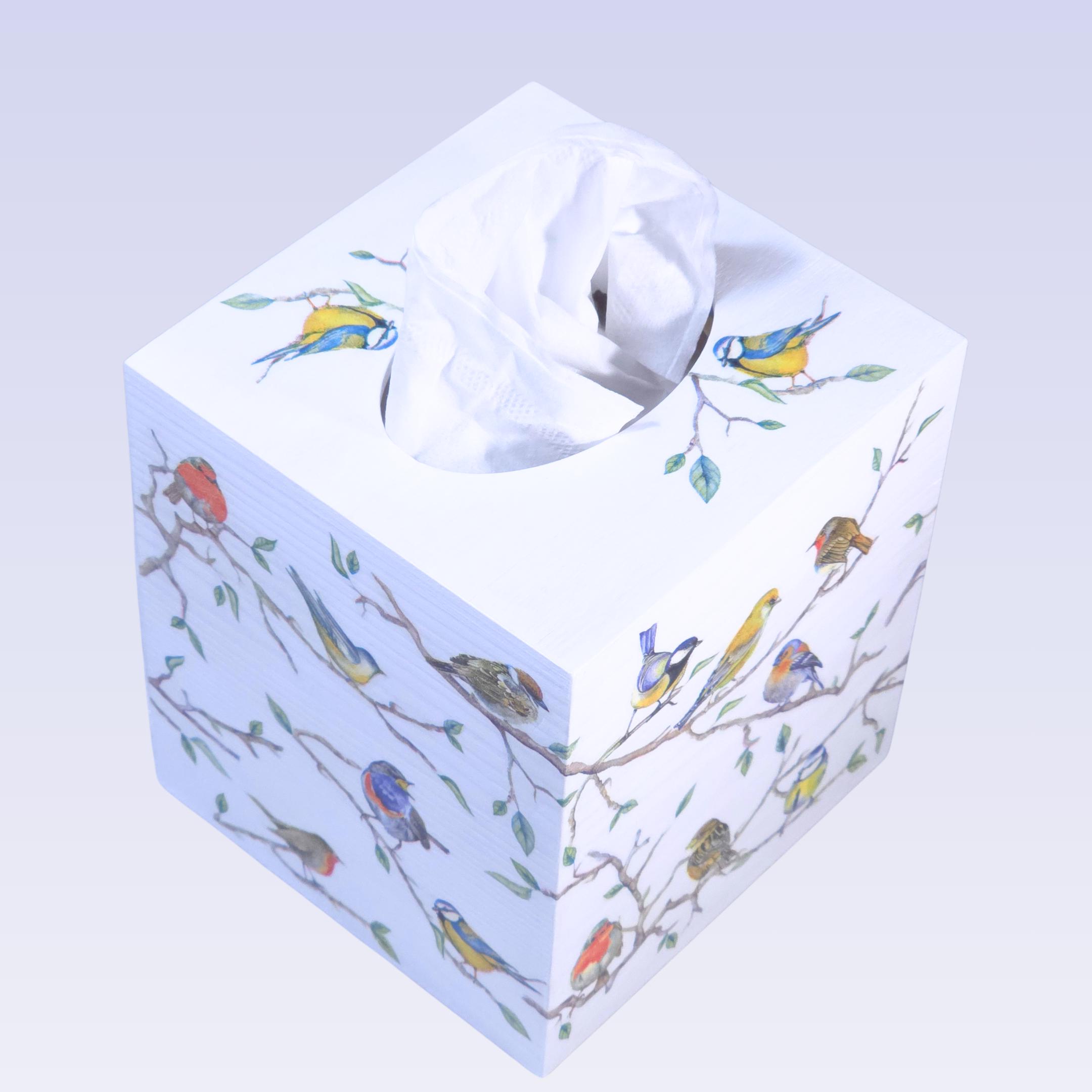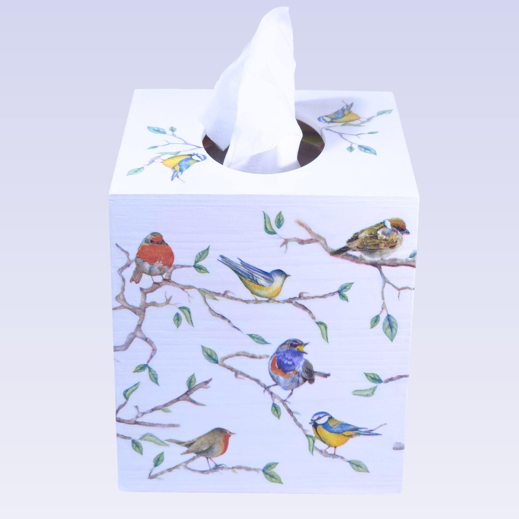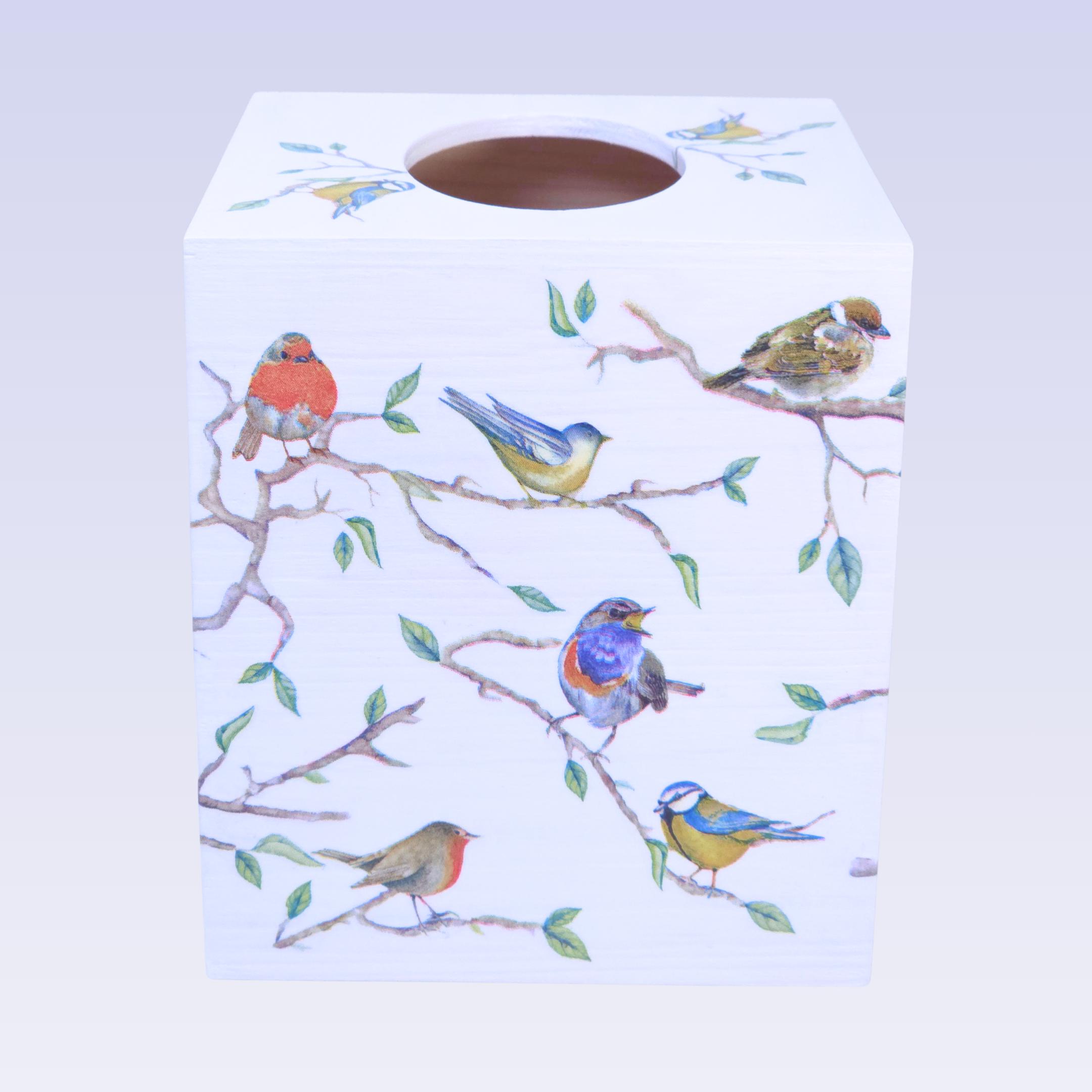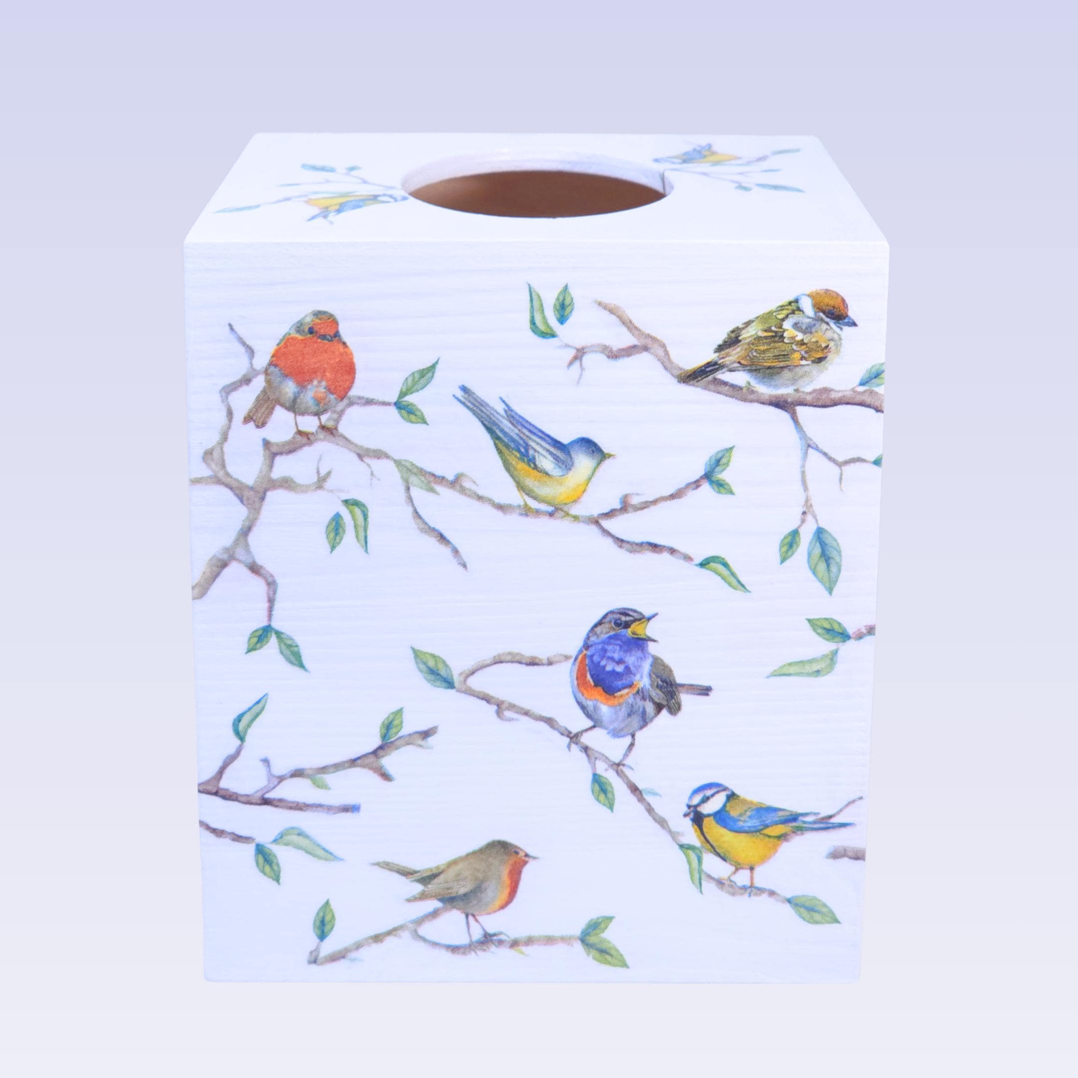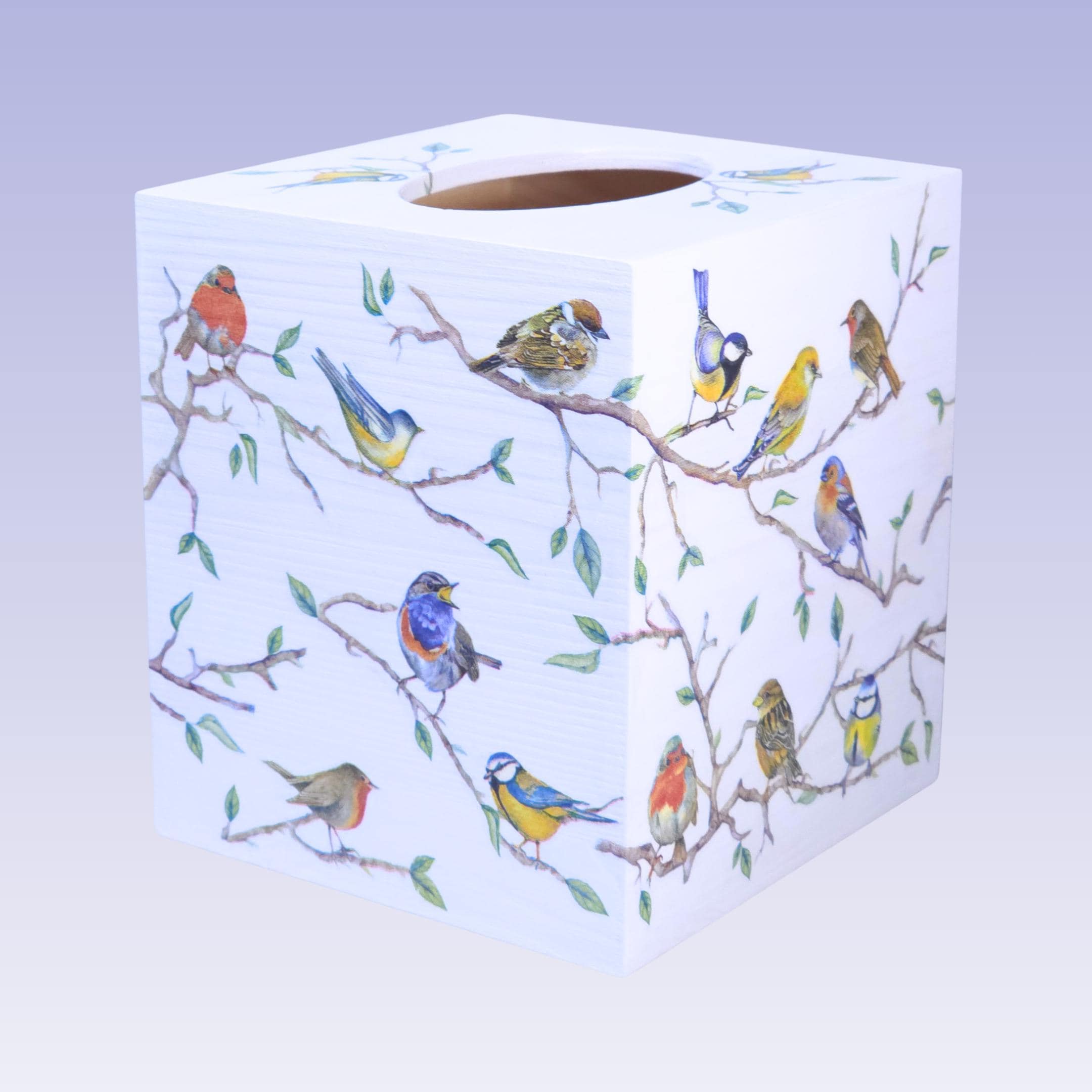 Upcycled 5-inch Square Solid Wood Tissue Box Cover: the exterior surfaces are hand painted white; and then hand decoupaged with designer paper napkins featuring many colorful songbirds perched upon long branches.