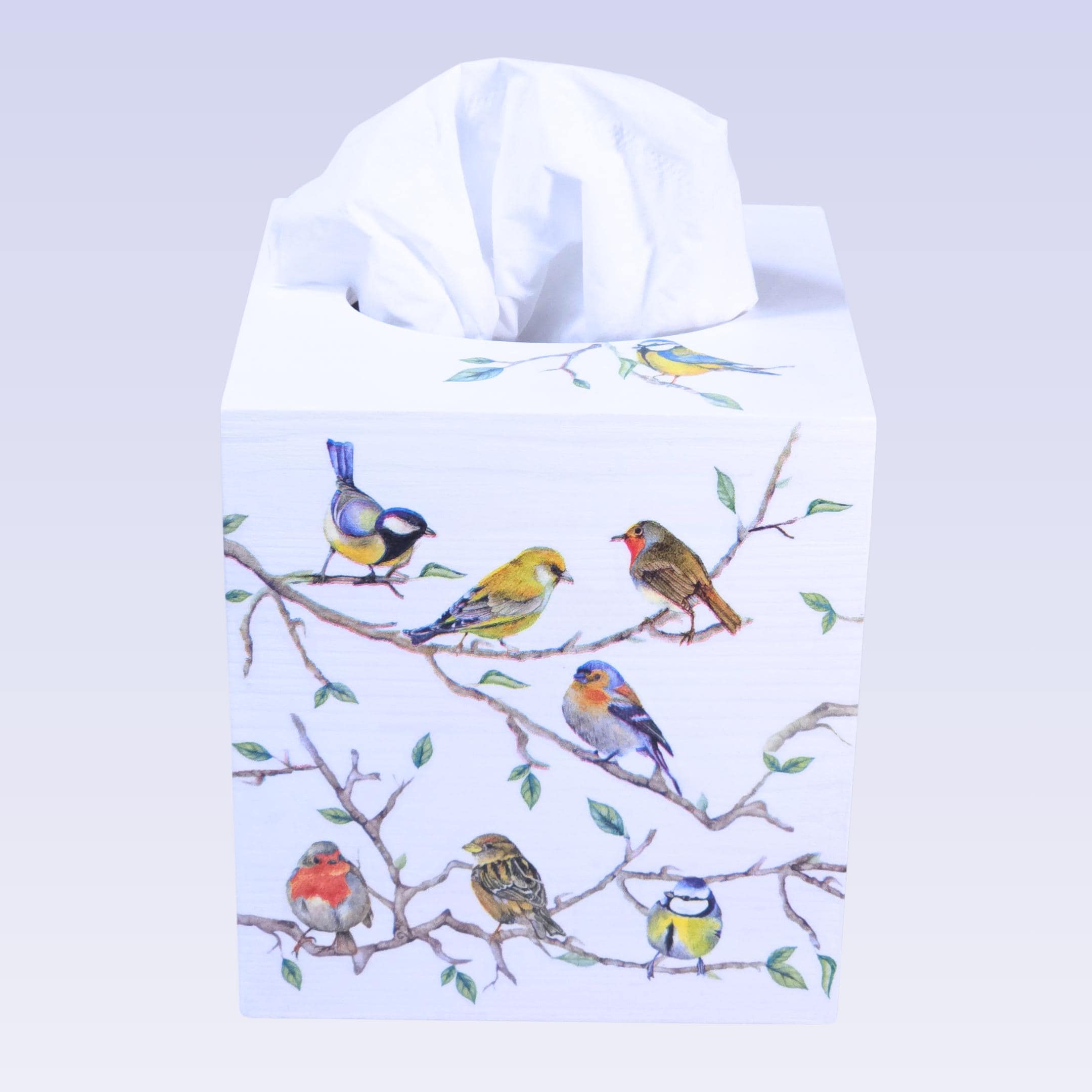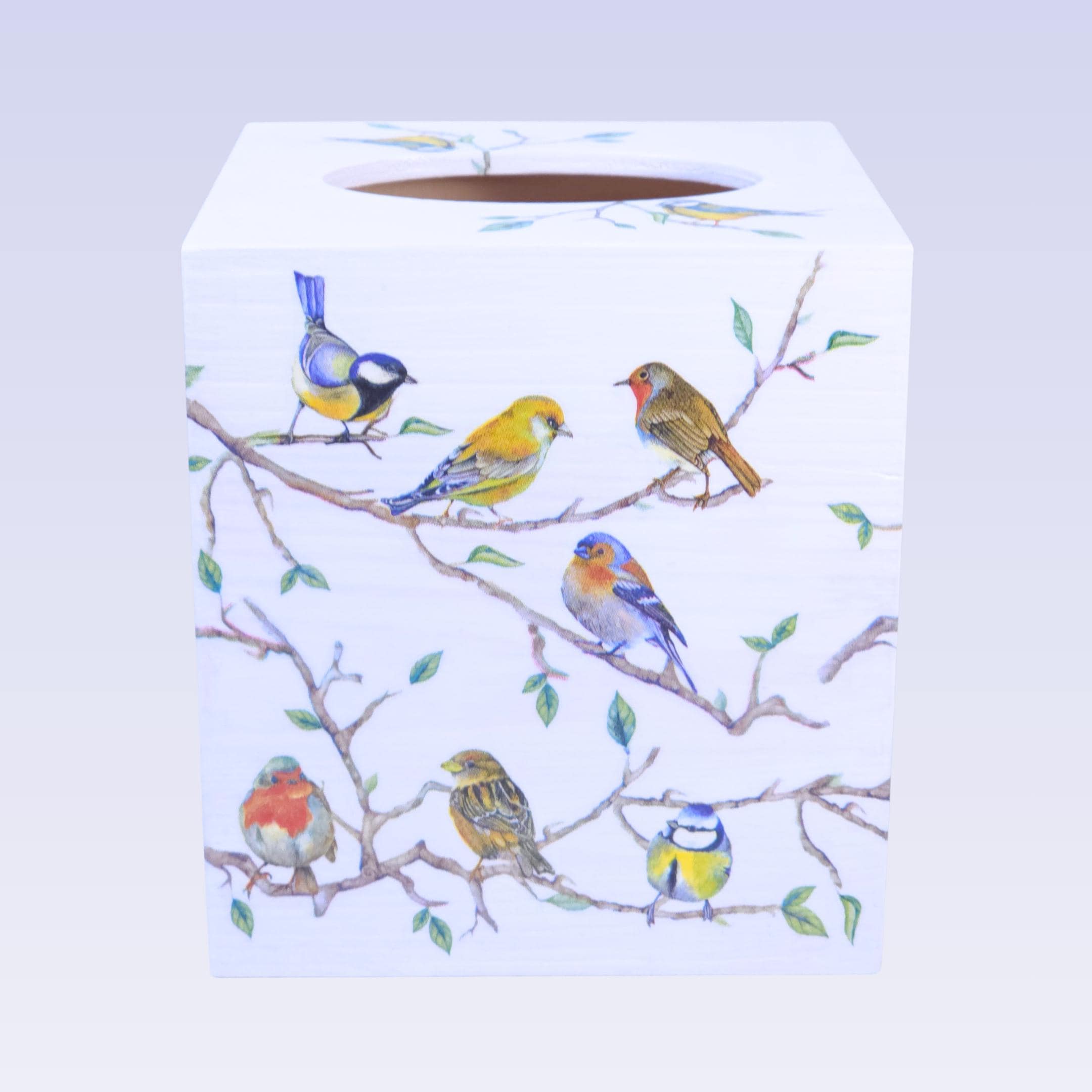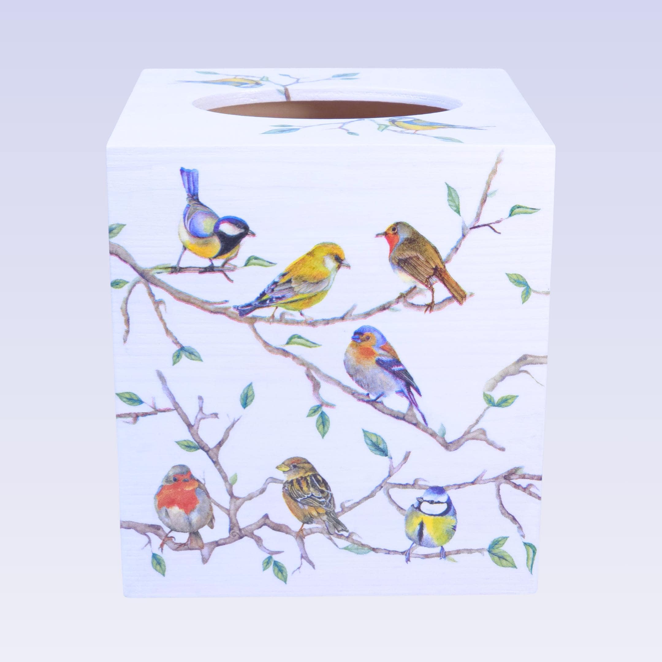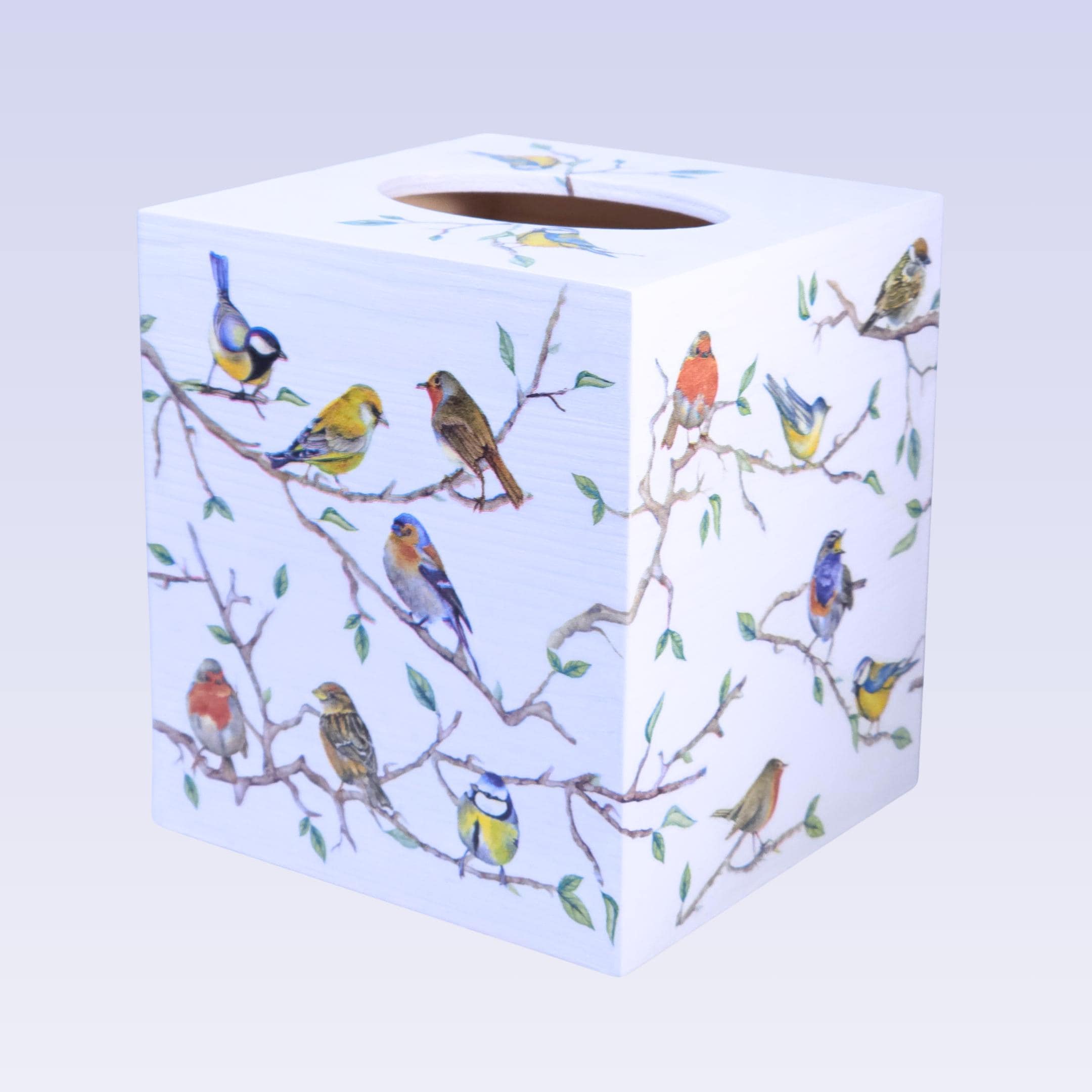 Upcycled 5-inch Square Solid Wood Tissue Box Cover: the exterior surfaces are hand painted white; and then hand decoupaged with designer paper napkins featuring many colorful songbirds perched upon long branches.