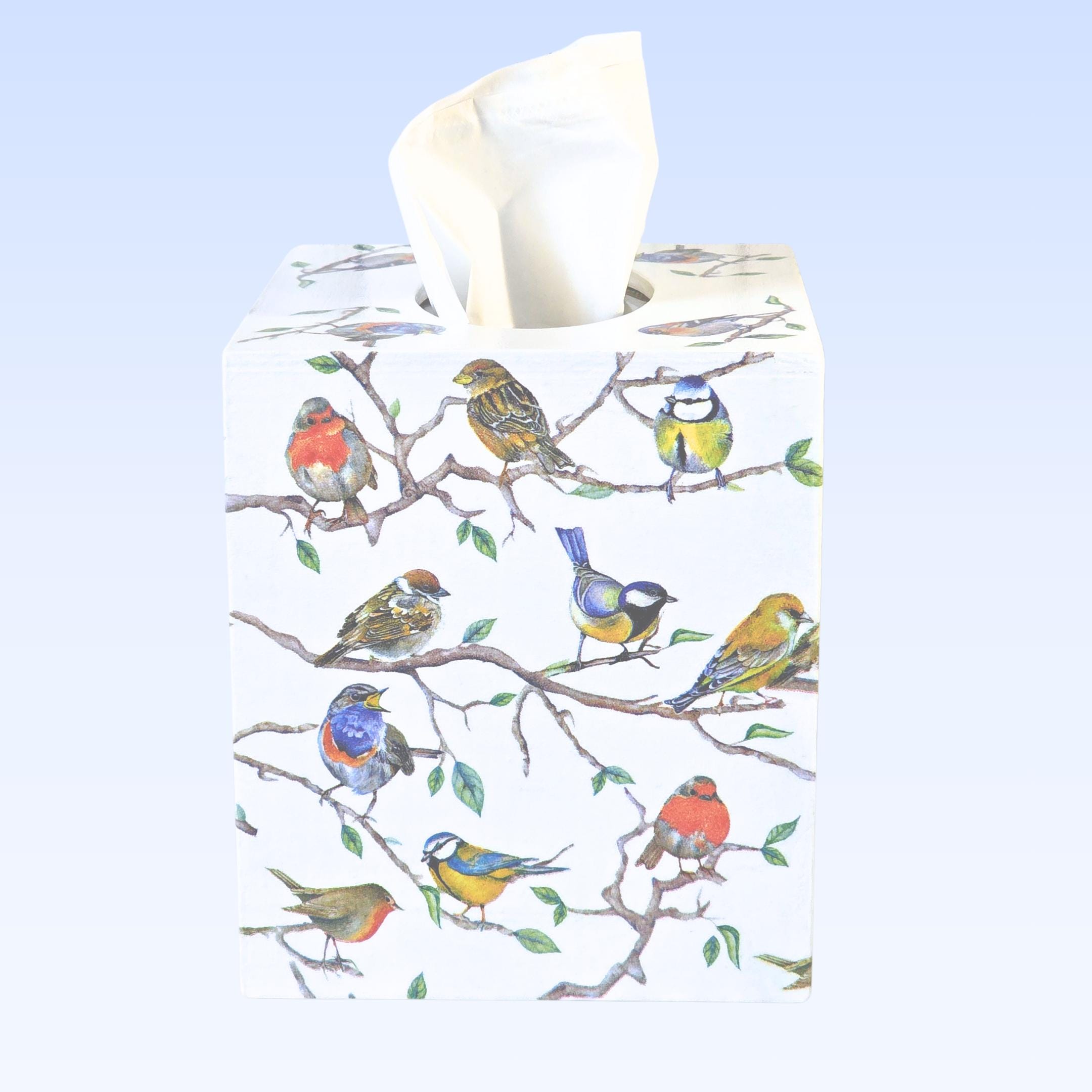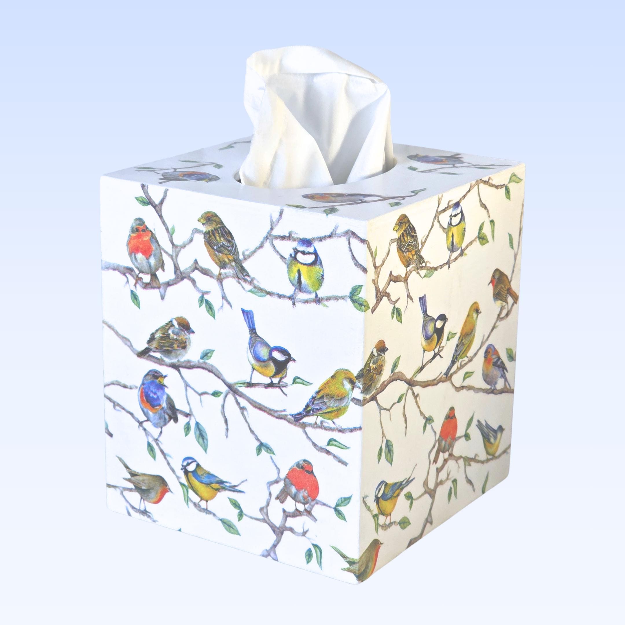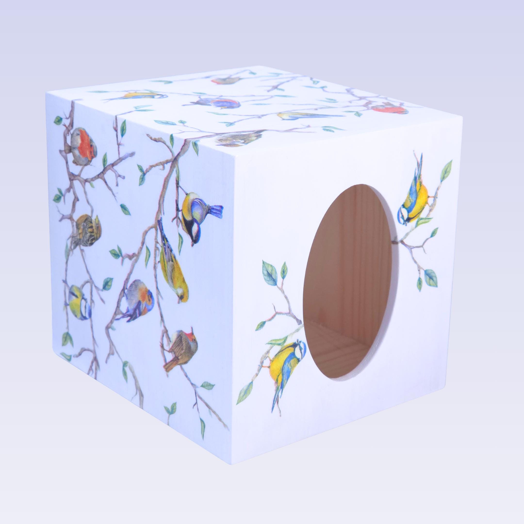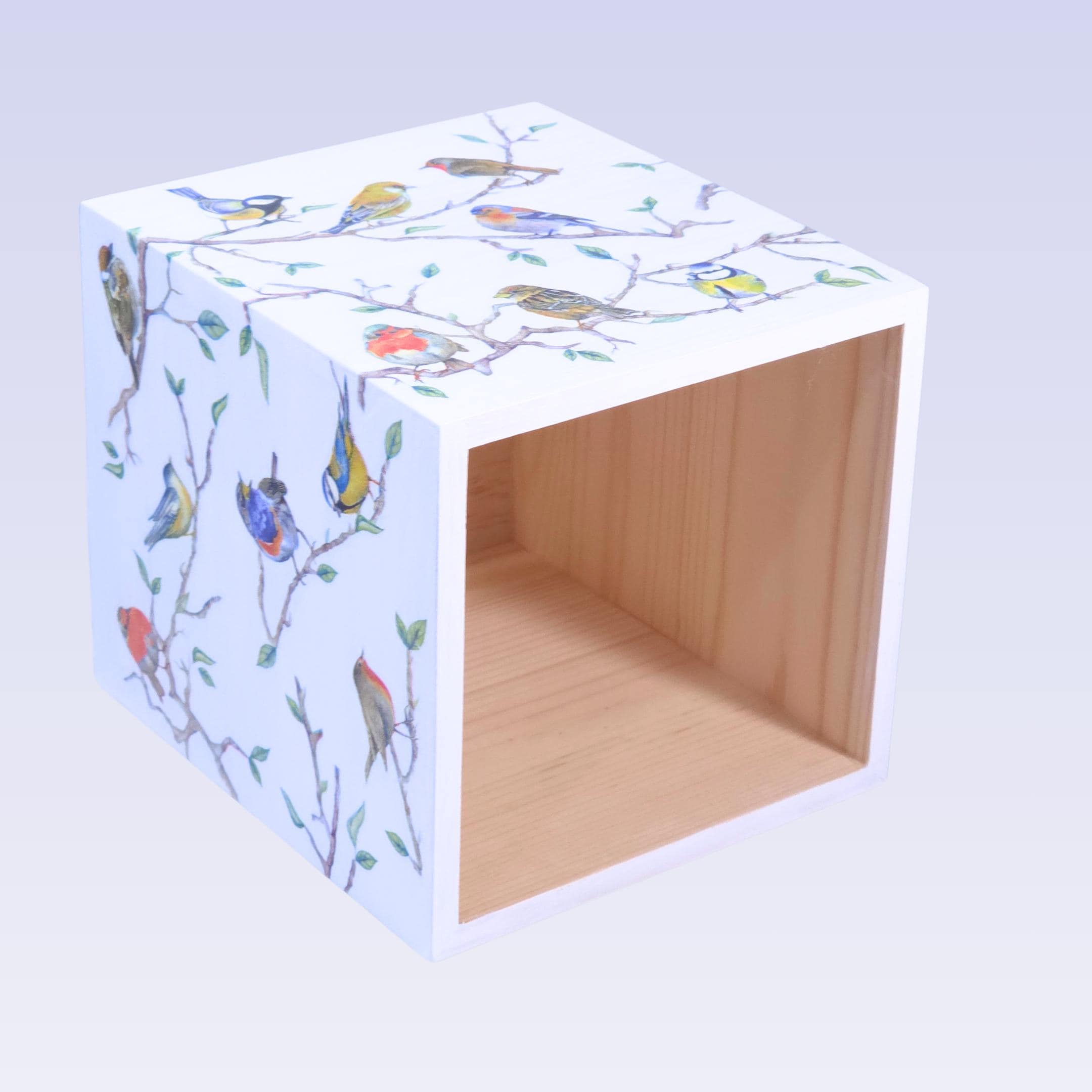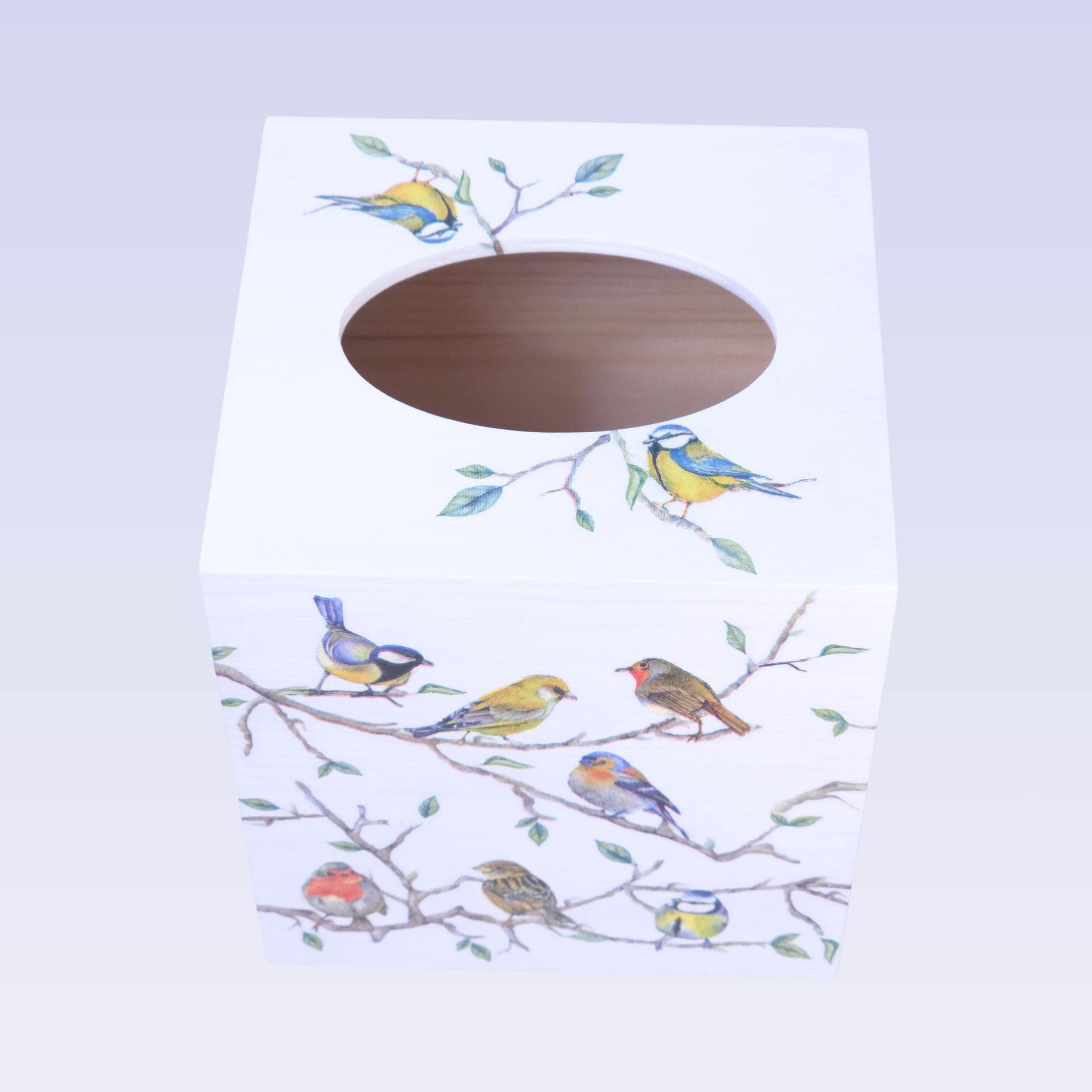 Upcycled 5-inch Square Solid Wood Tissue Box Cover: the exterior surfaces are hand painted white; and then hand decoupaged with designer paper napkins featuring many colorful songbirds perched upon long branches.