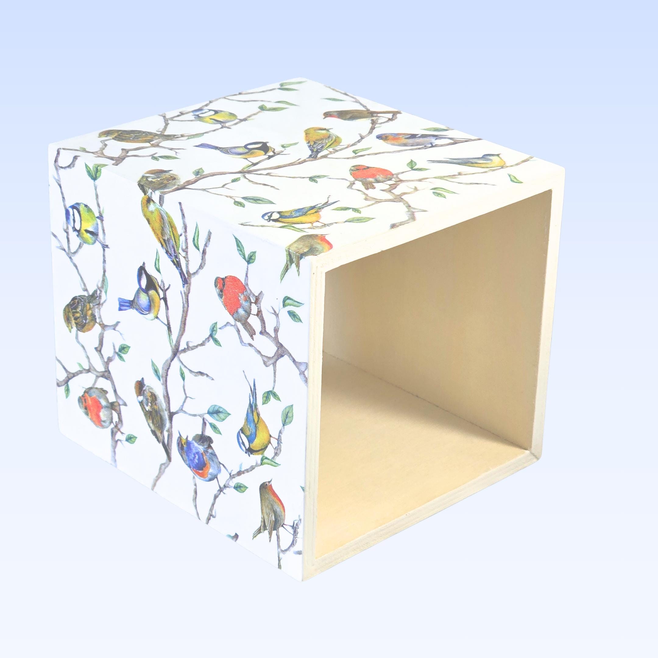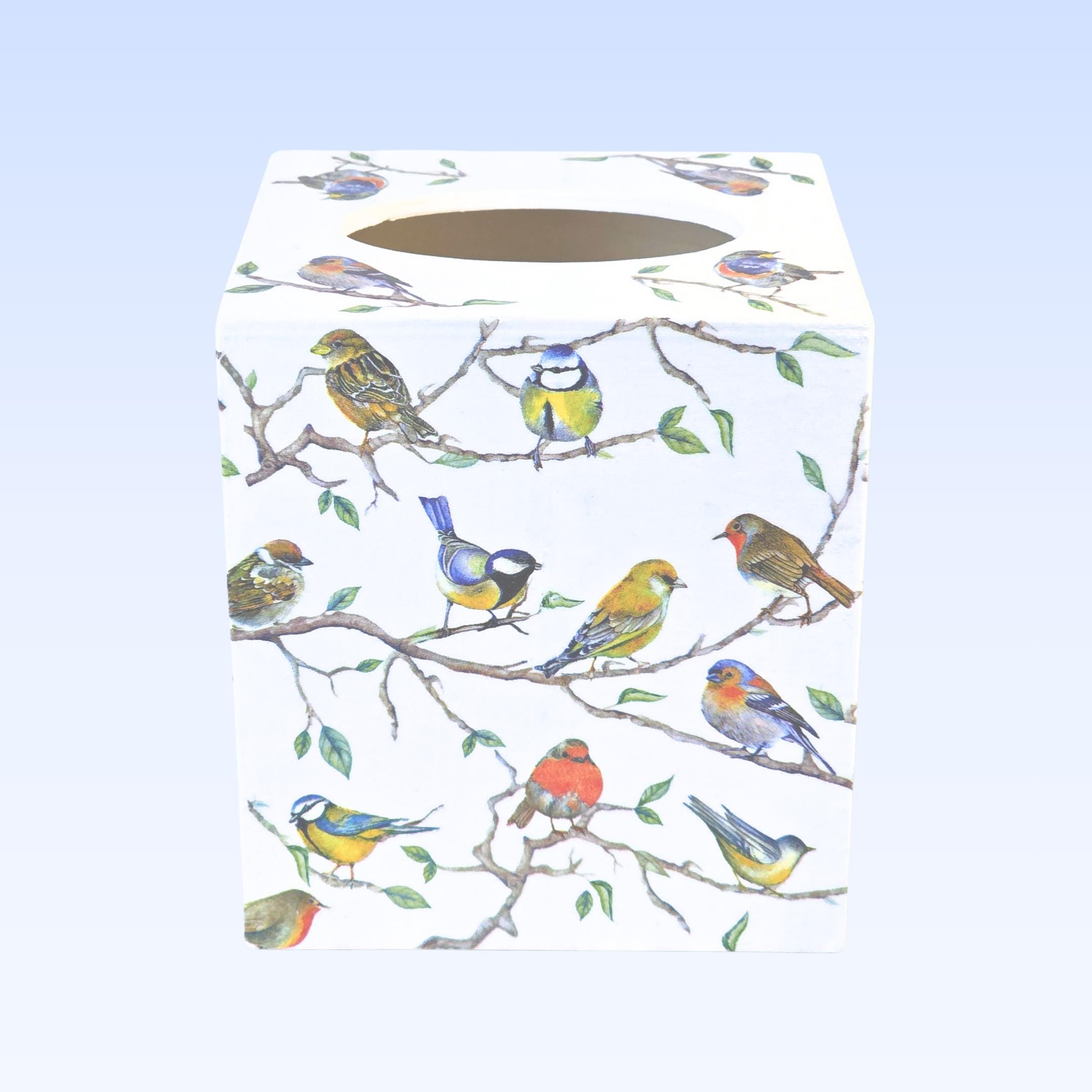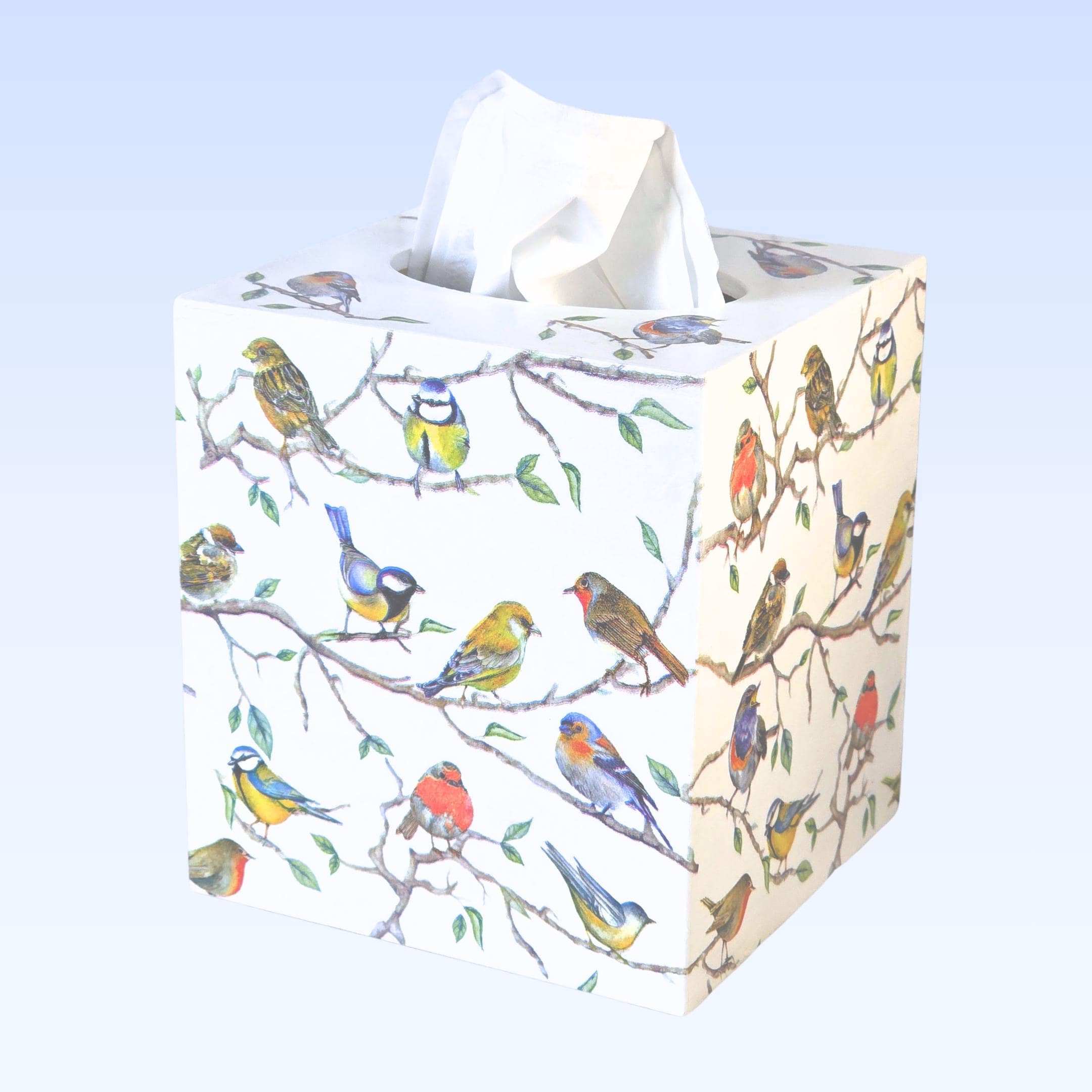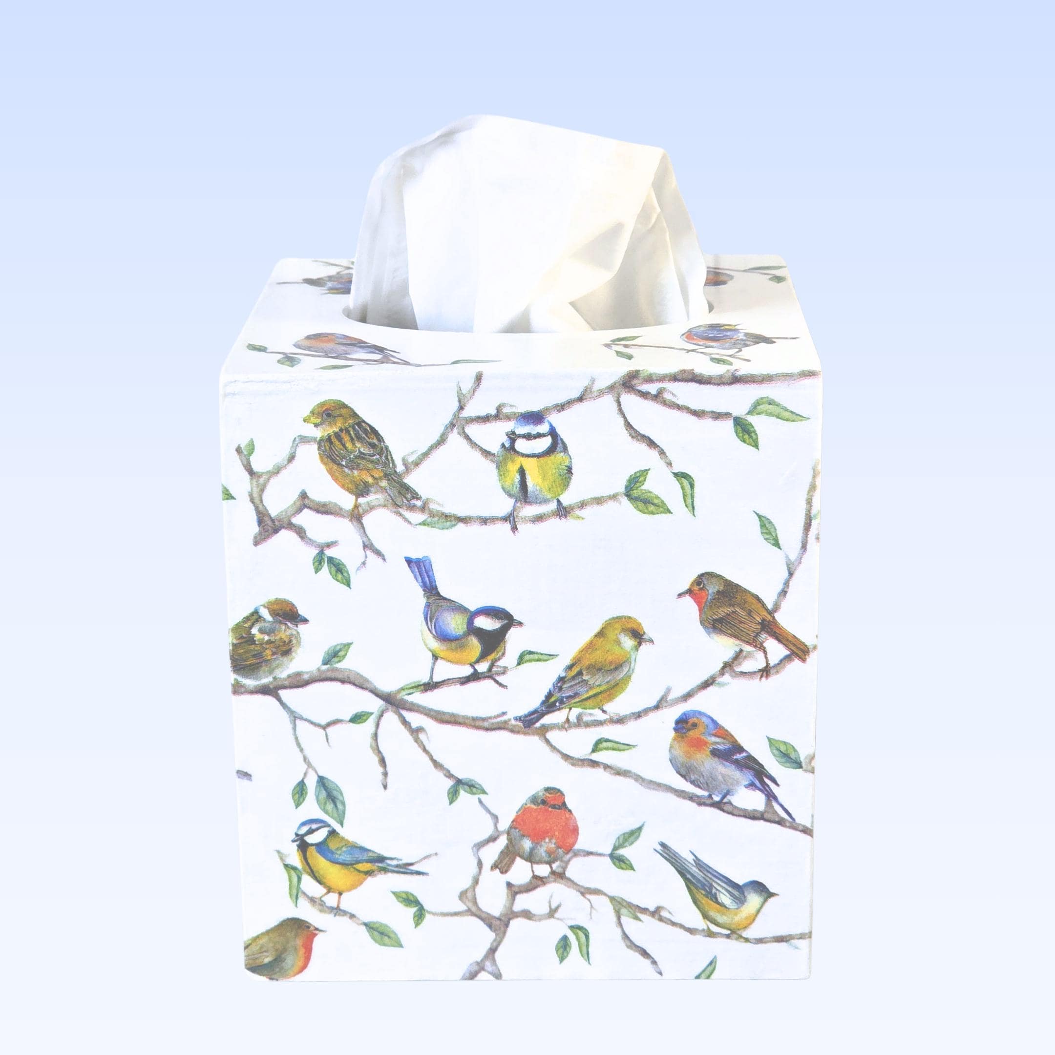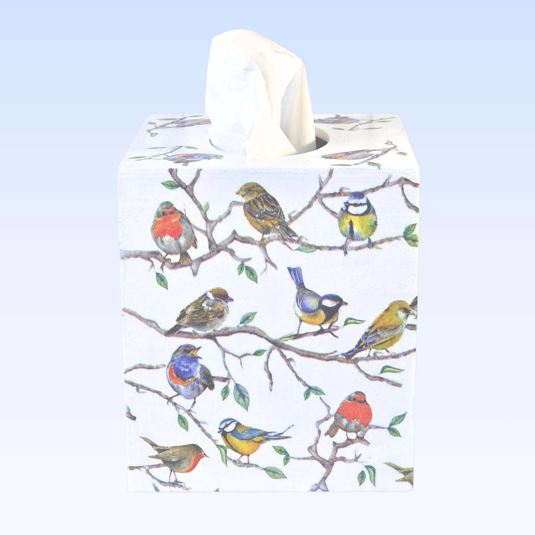 Upcycled 5-inch Square Solid Wood Tissue Box Cover: the exterior surfaces are hand painted white; and then hand decoupaged with designer paper napkins featuring many colorful songbirds perched upon long branches.