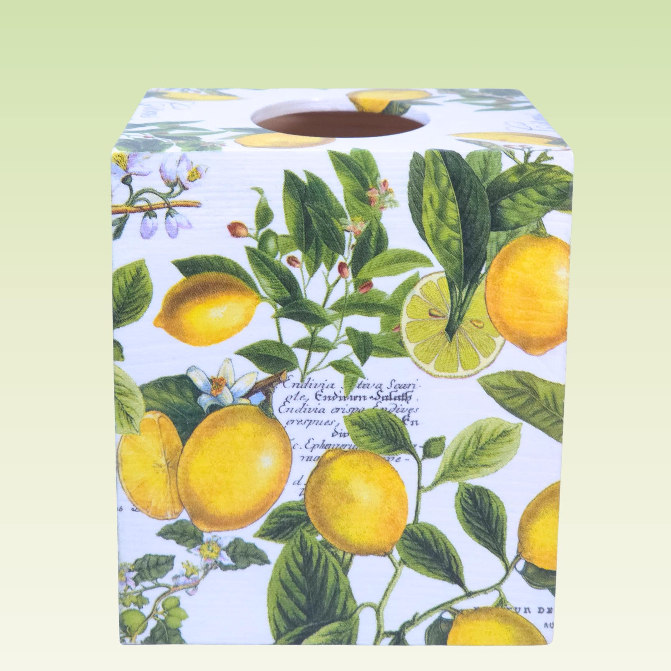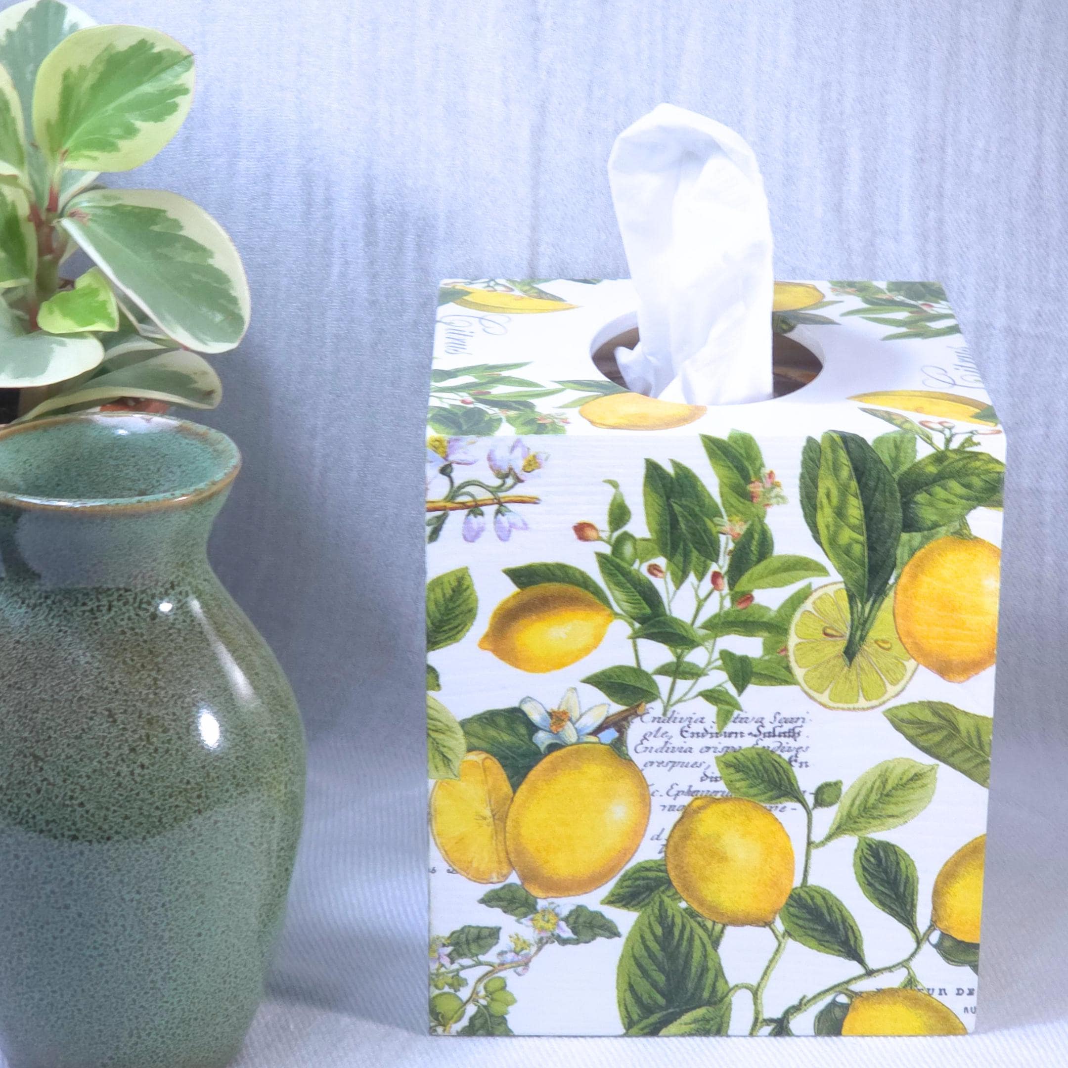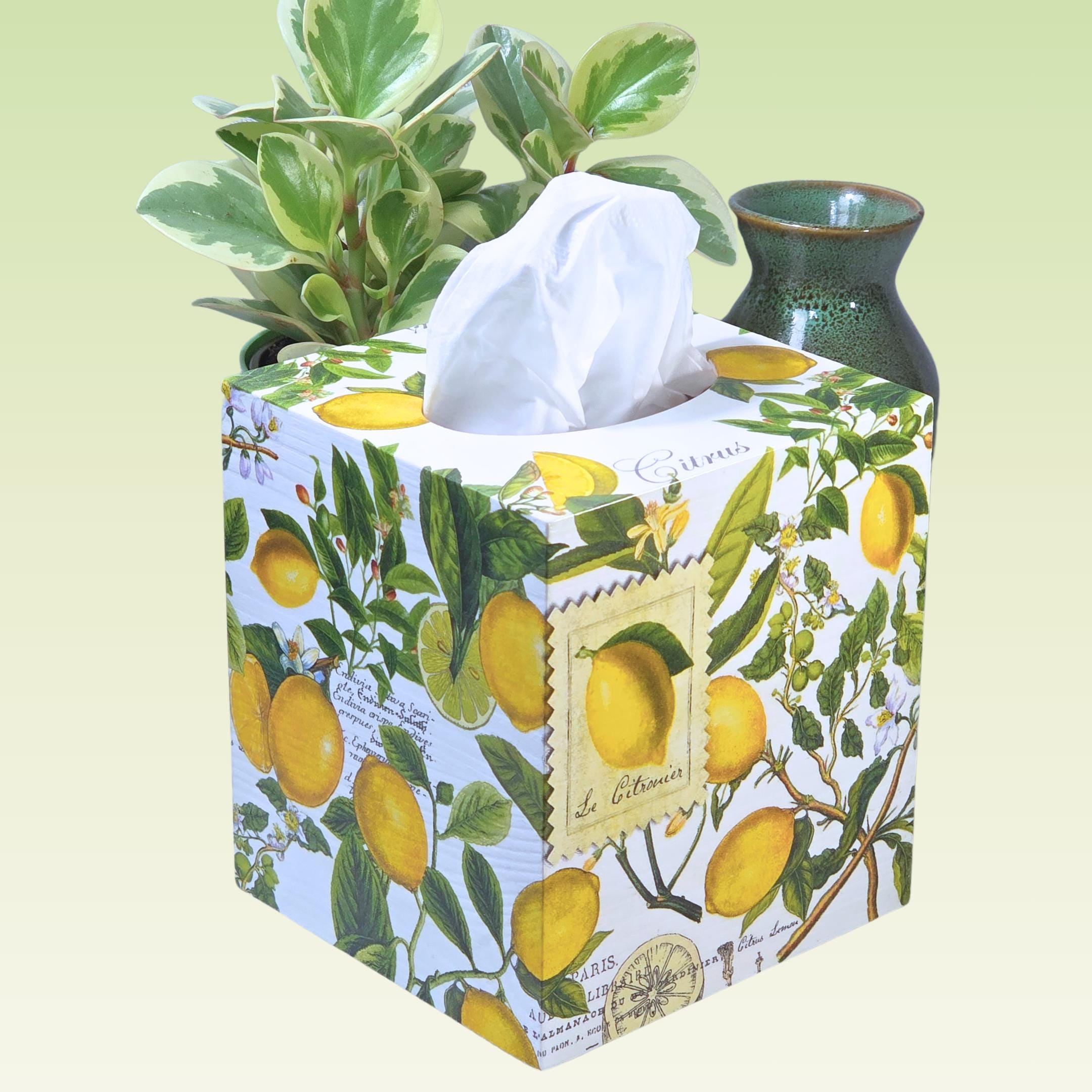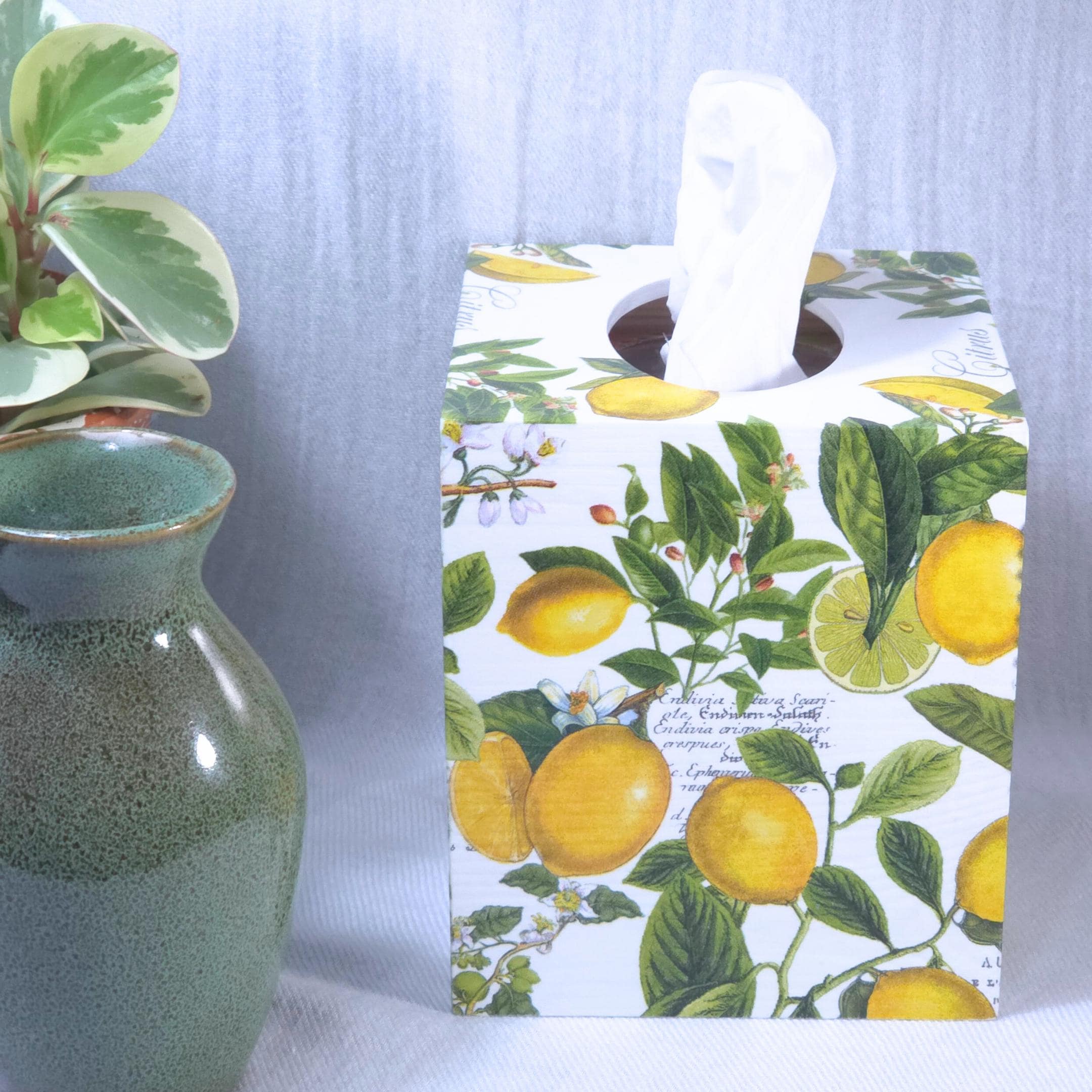 Upcycled 5-inch Square Solid Wood Tissue Box Cover: the exterior surfaces are hand painted white; and then hand decoupaged with designer paper napkins featuring bright lemons and basil leaves.