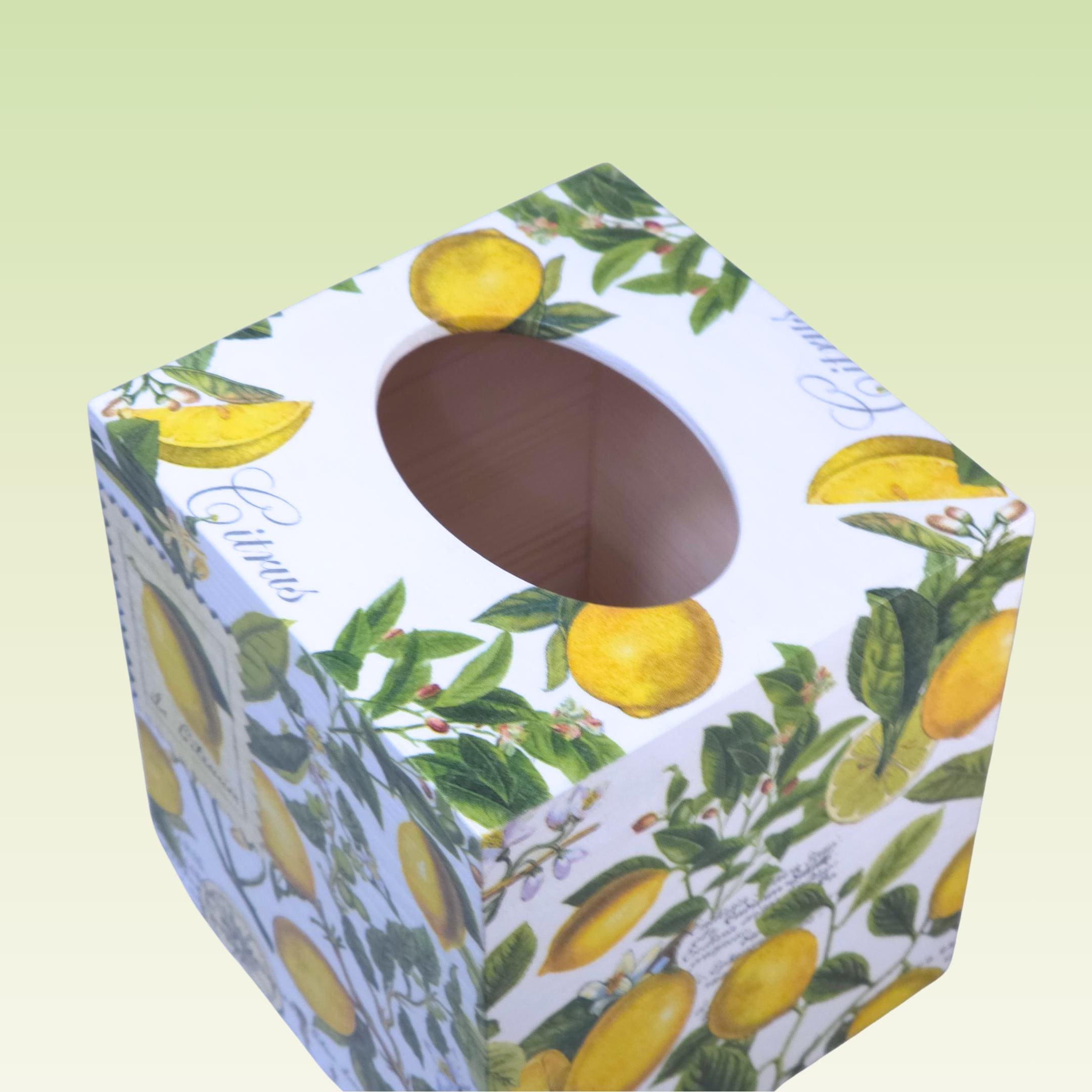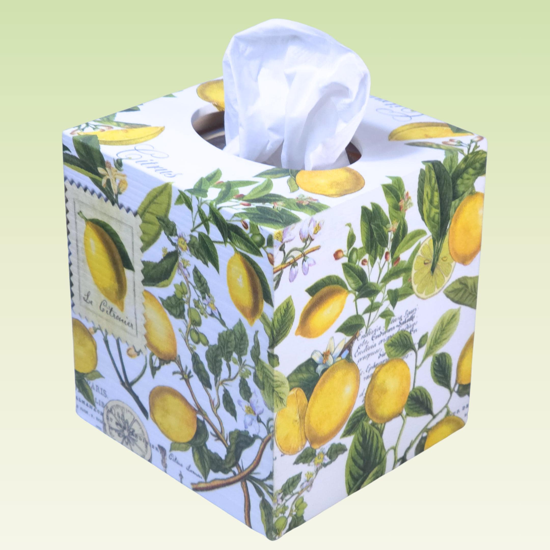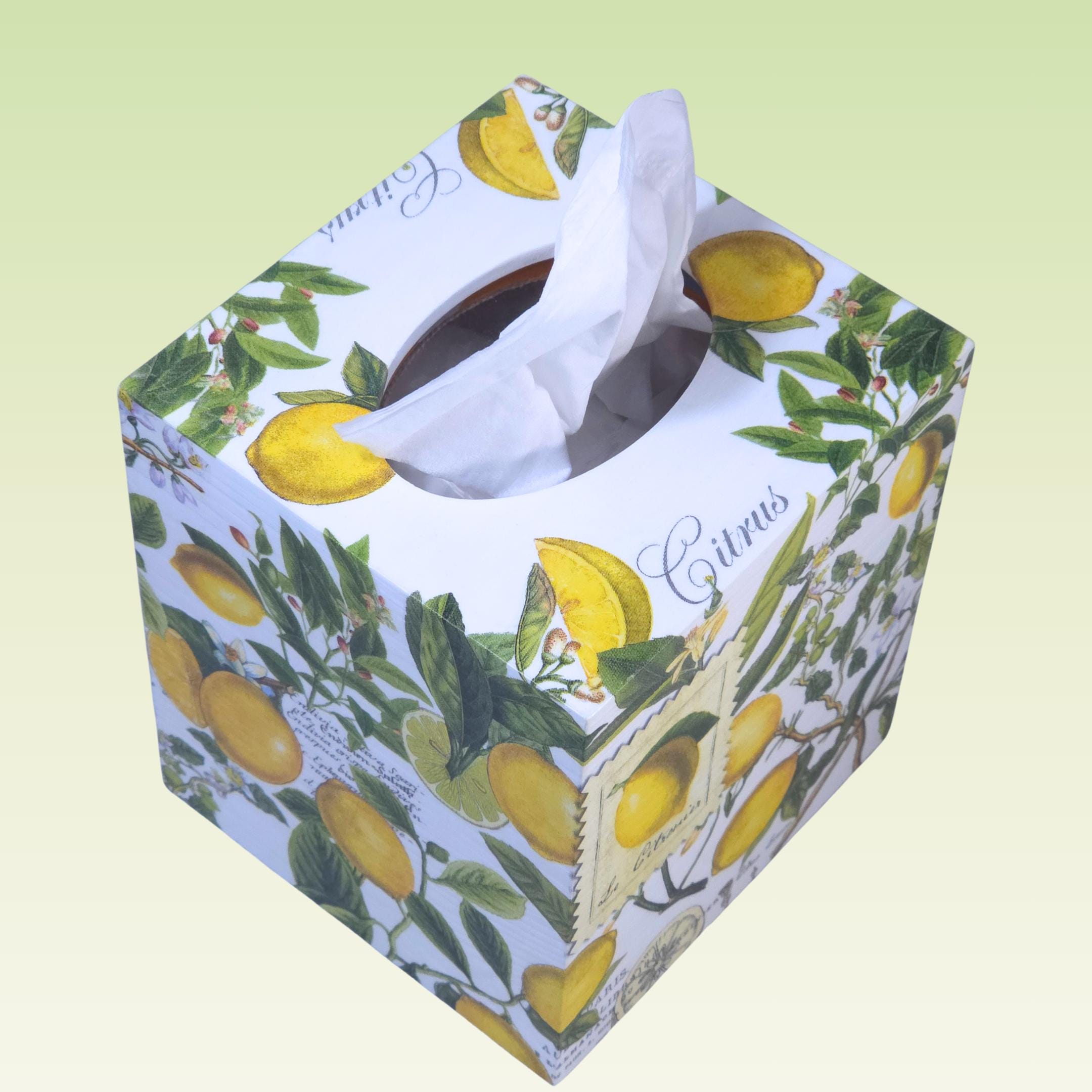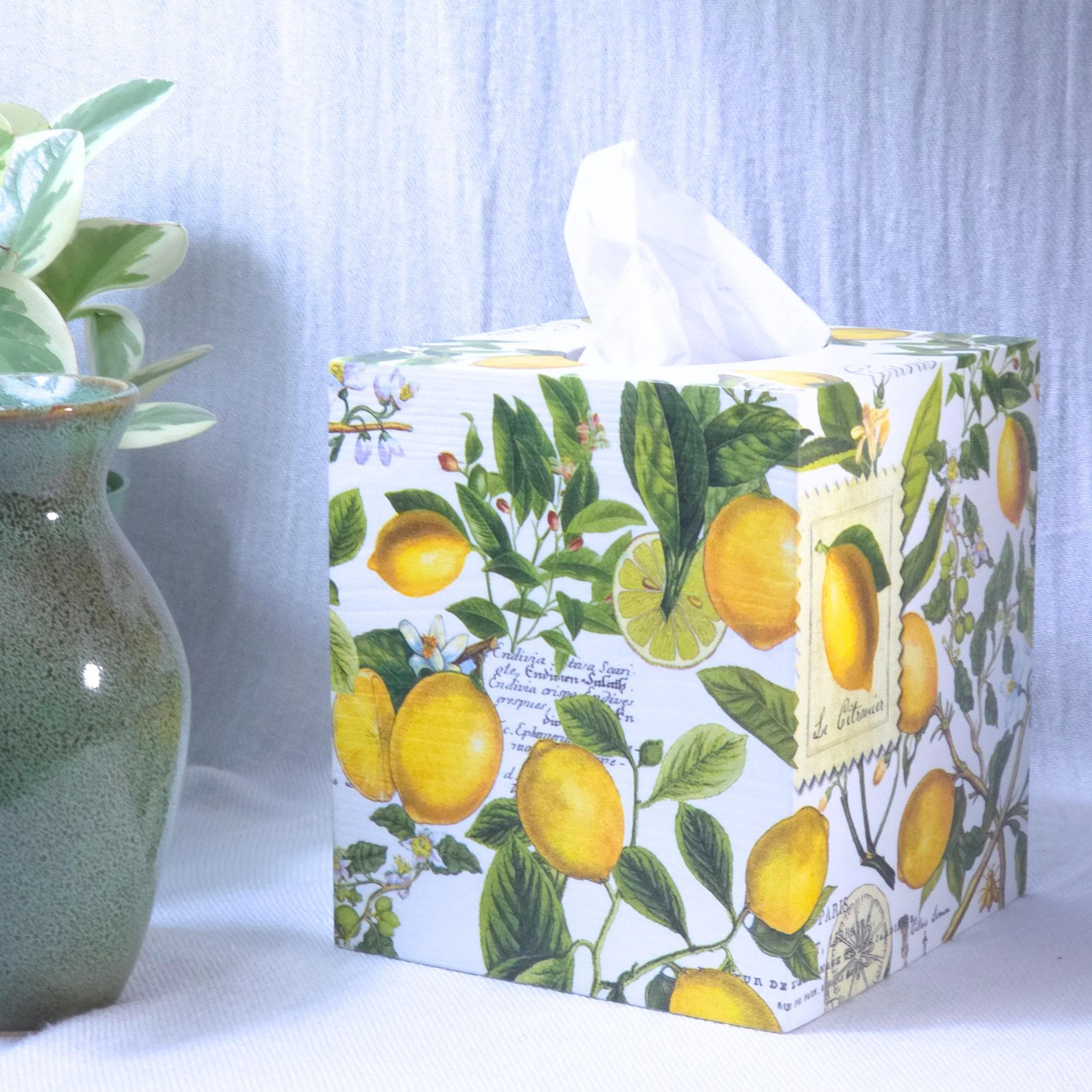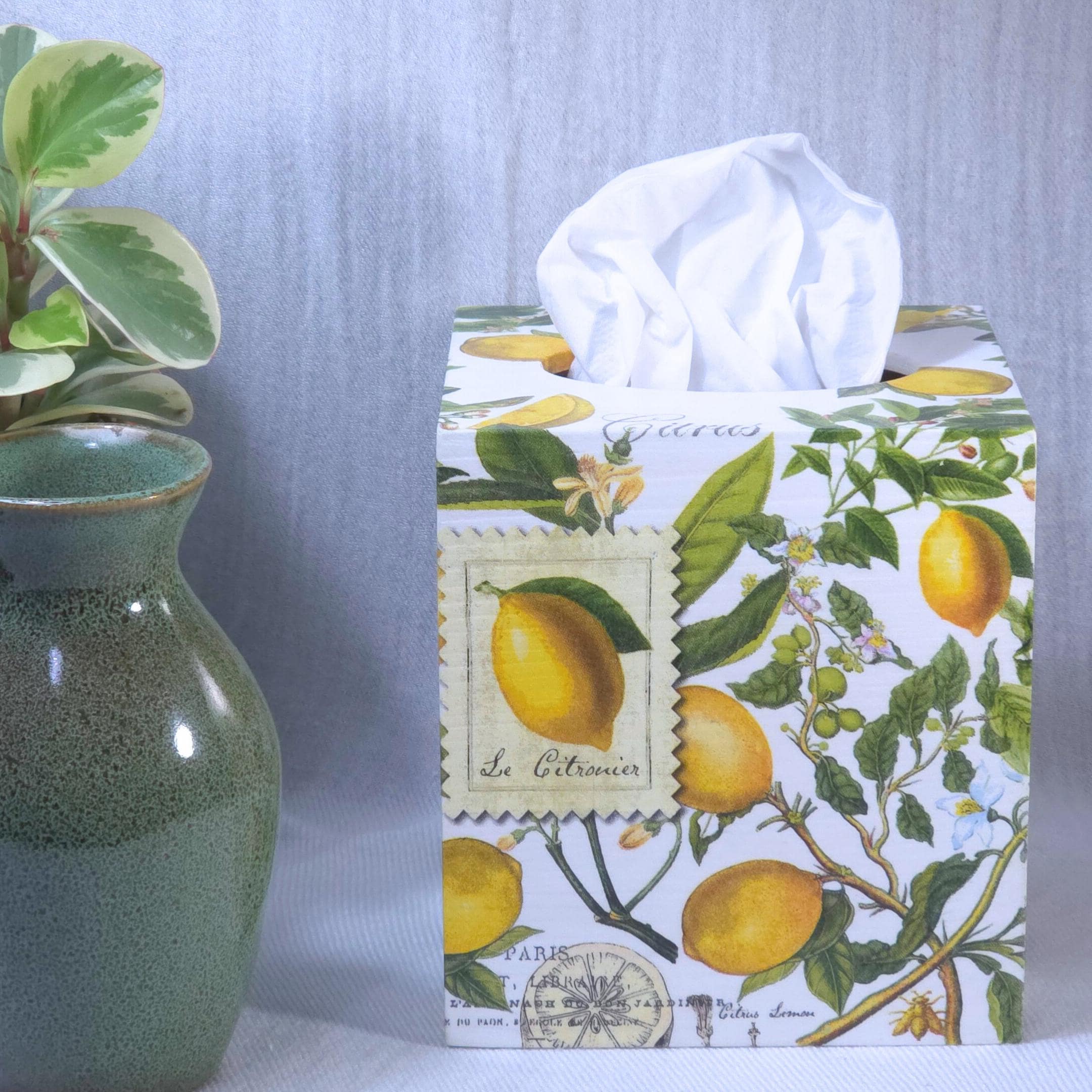 Upcycled 5-inch Square Solid Wood Tissue Box Cover: the exterior surfaces are hand painted white; and then hand decoupaged with designer paper napkins featuring bright lemons and basil leaves.