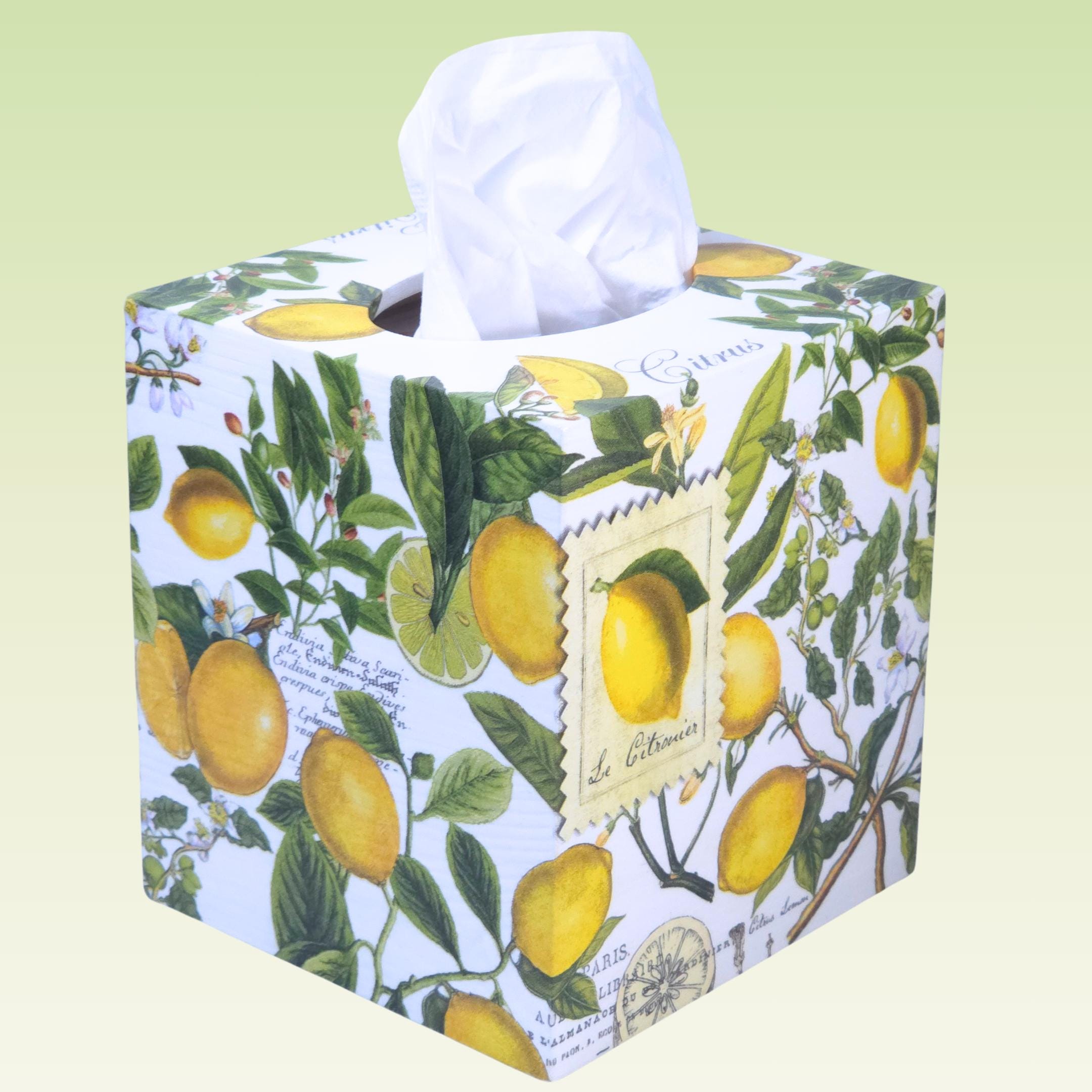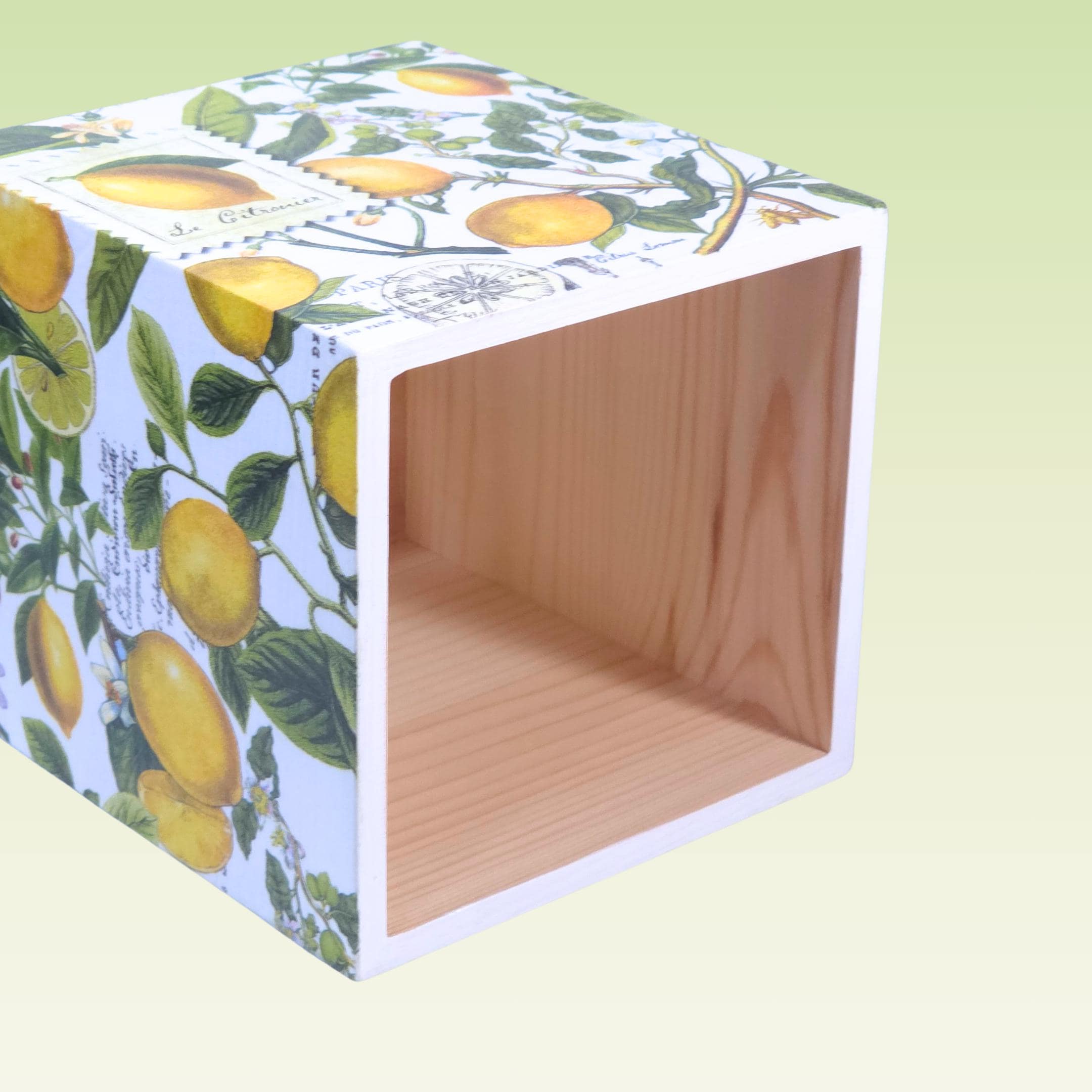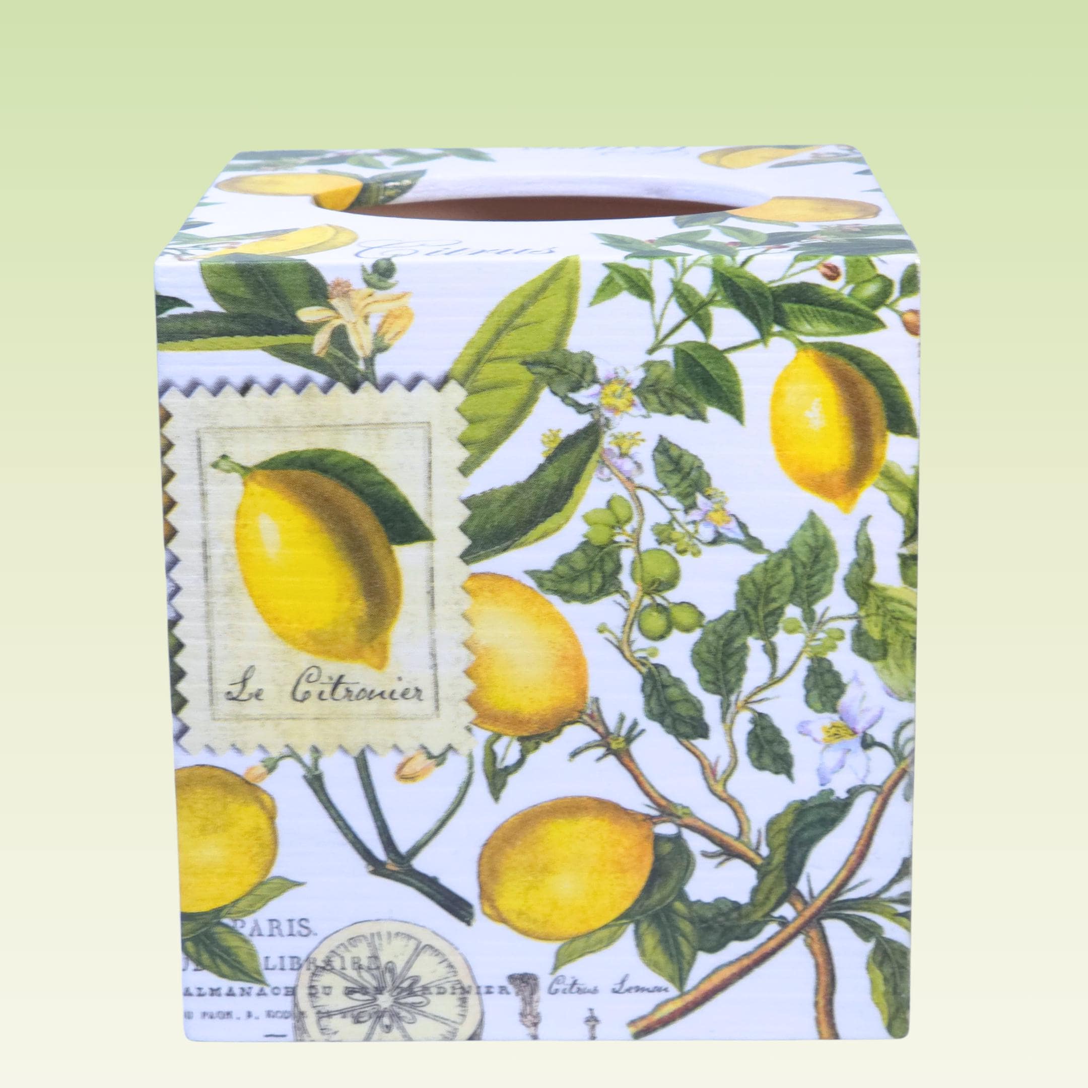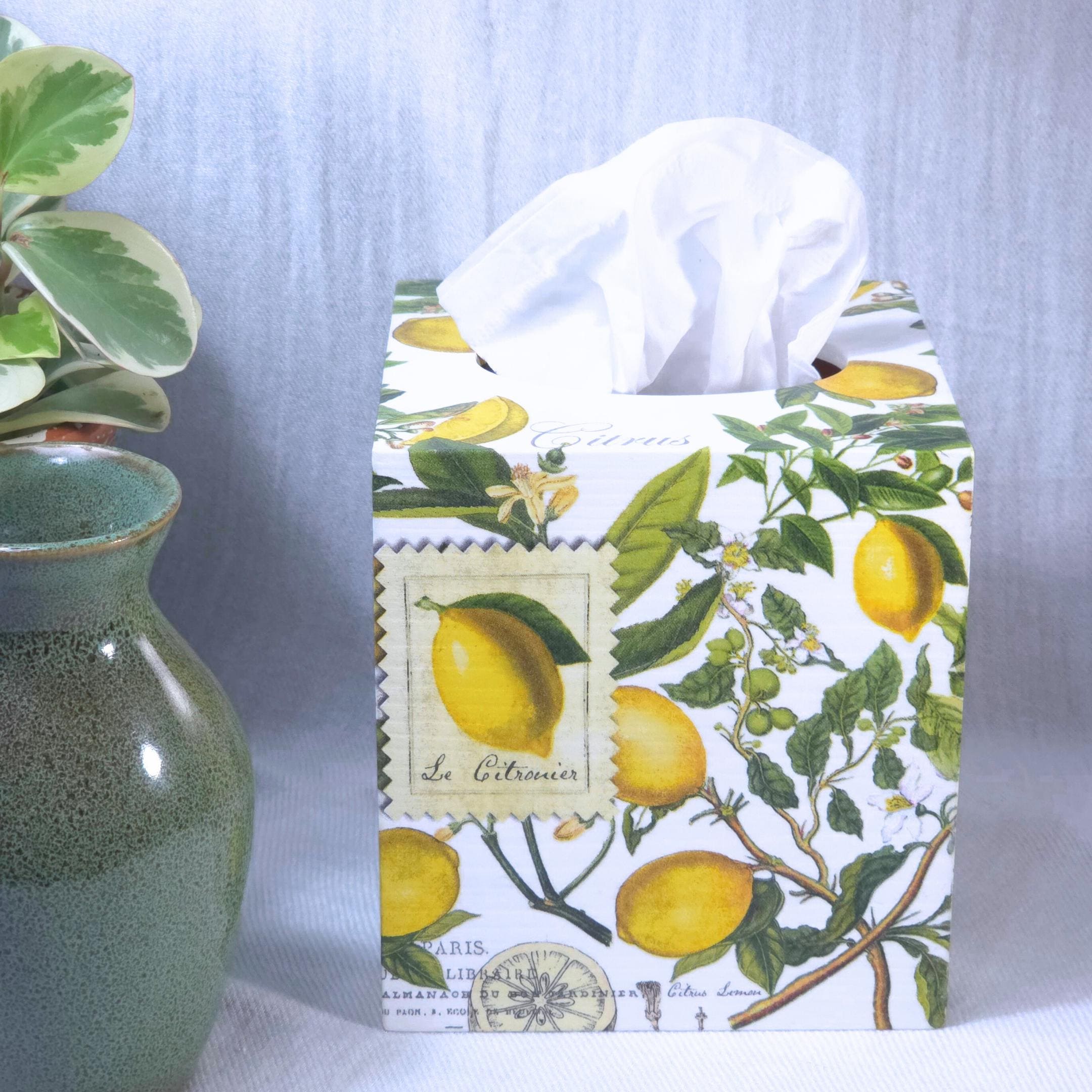 Upcycled 5-inch Square Solid Wood Tissue Box Cover: the exterior surfaces are hand painted white; and then hand decoupaged with designer paper napkins featuring bright lemons and basil leaves.