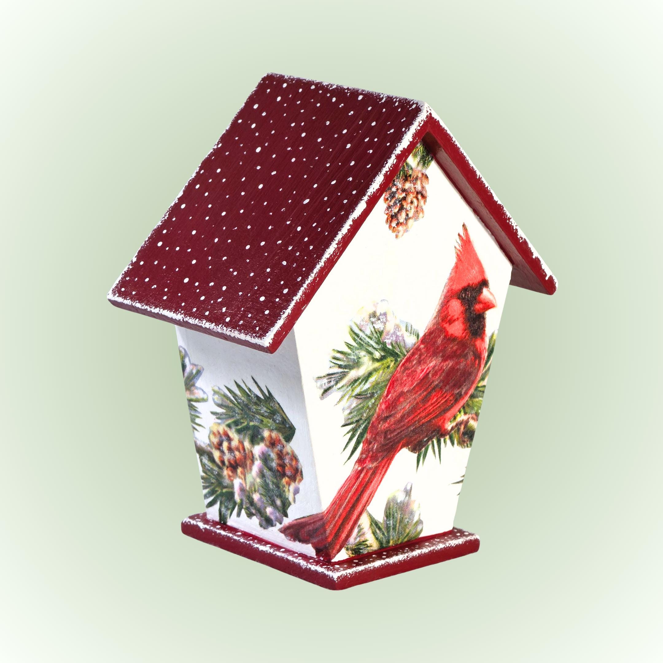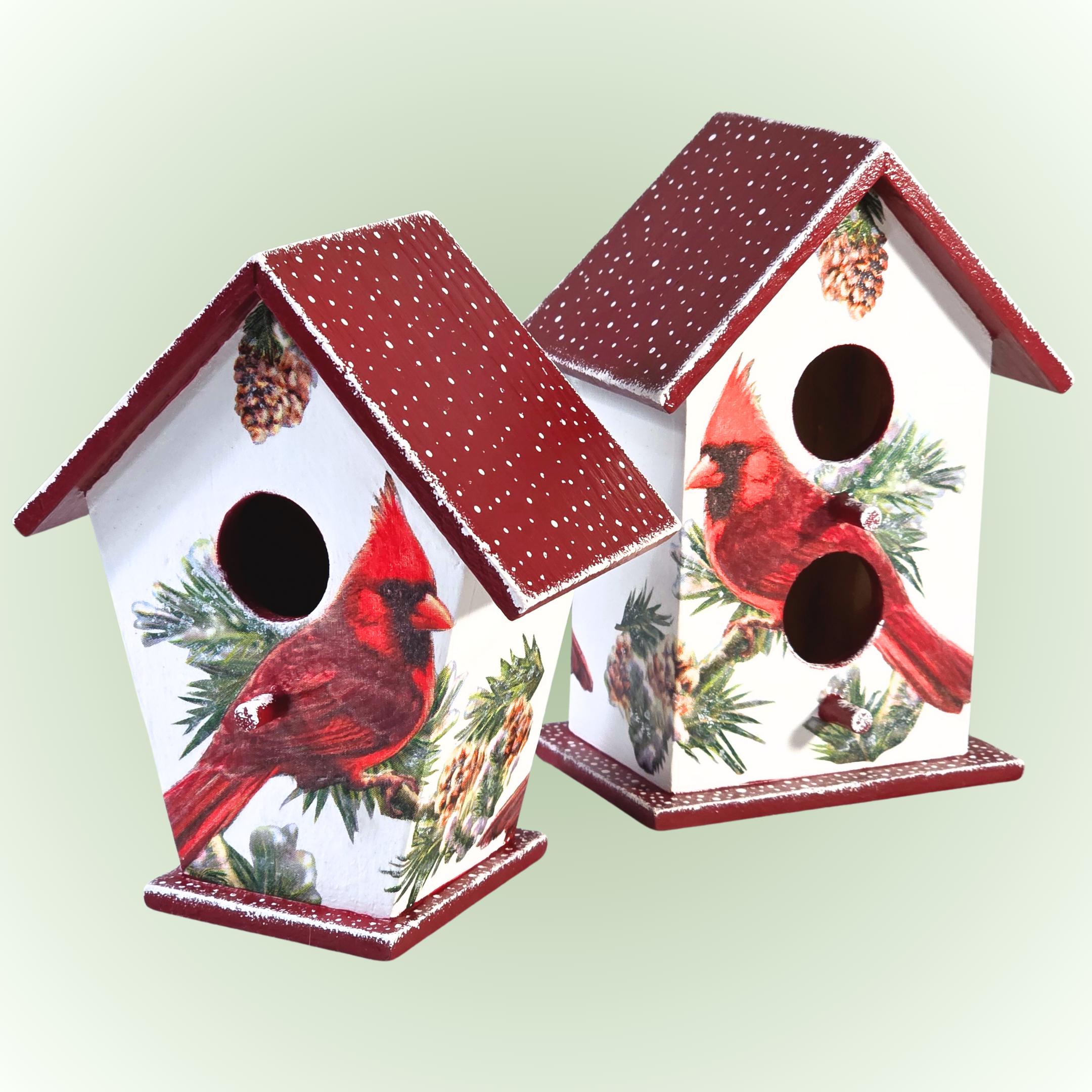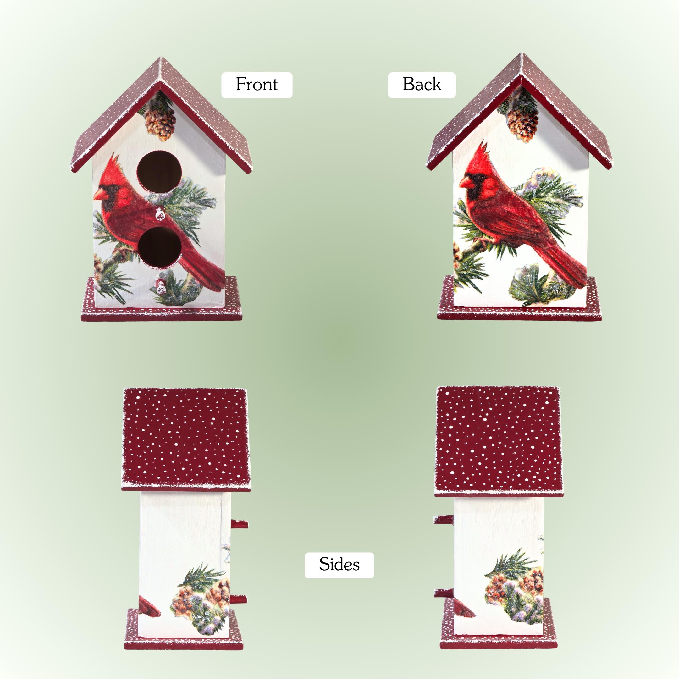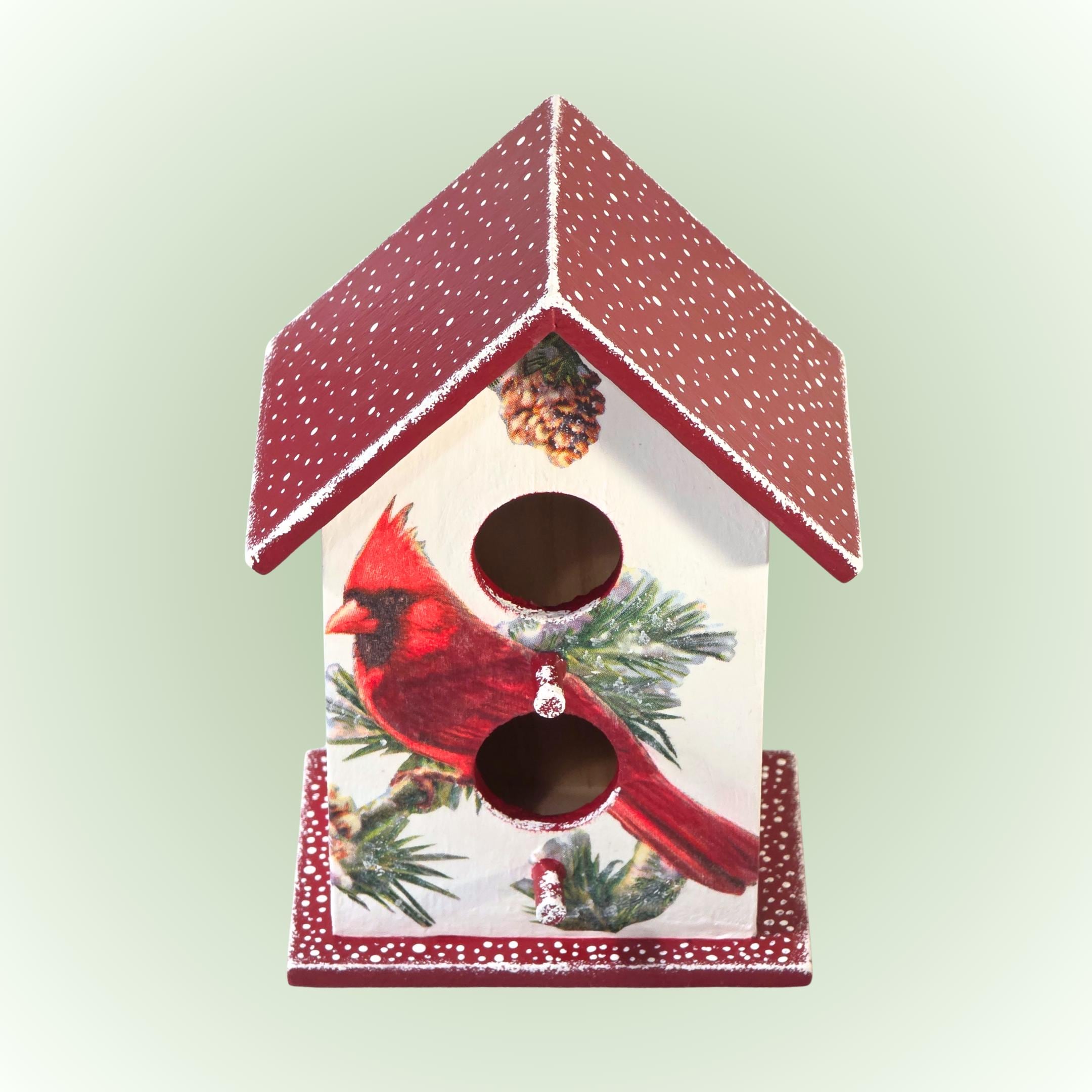 Bring the quiet beauty of winter indoors with these Winter Cardinal collectible birdhouses — handcrafted treasures that celebrate nature’s most striking winter visitor. Handcrafted with love, each Winter Cardinal birdhouse is upcycled from unfinished wood and hand-decoupaged with vivid red cardinals on snowy pine branches. Finished in our custom “bright burgundy” paint, they bring cozy, woodland charm to shelves, mantels, or holiday displays.