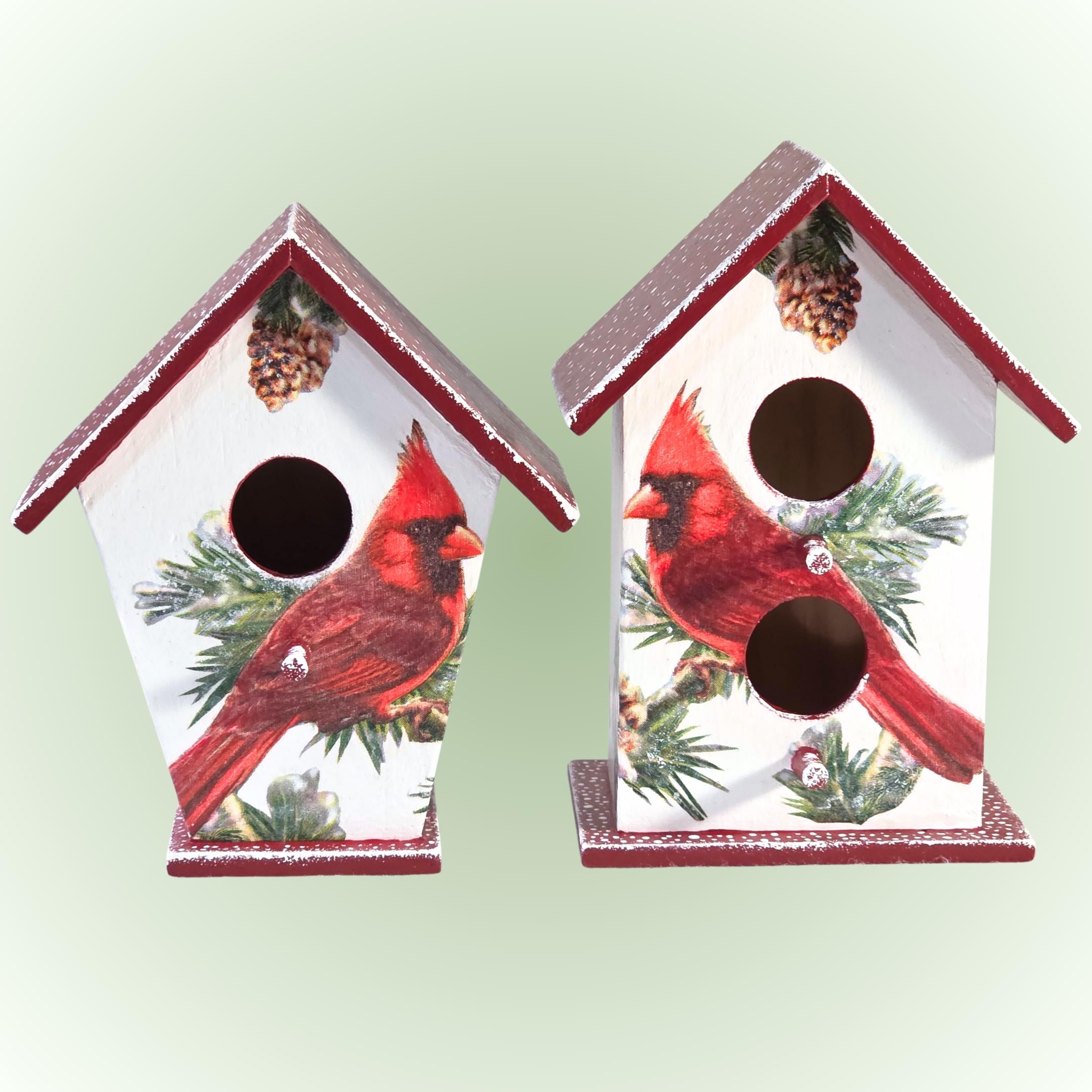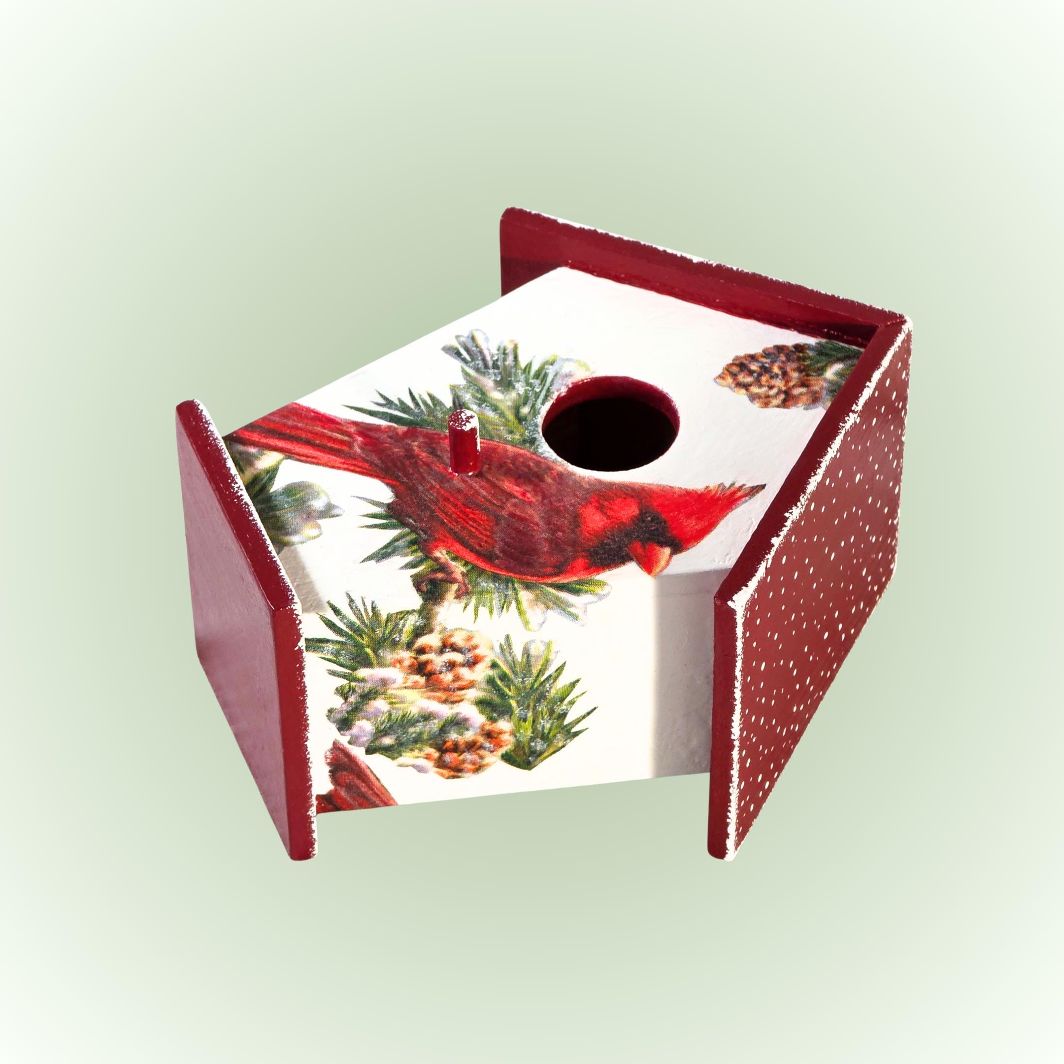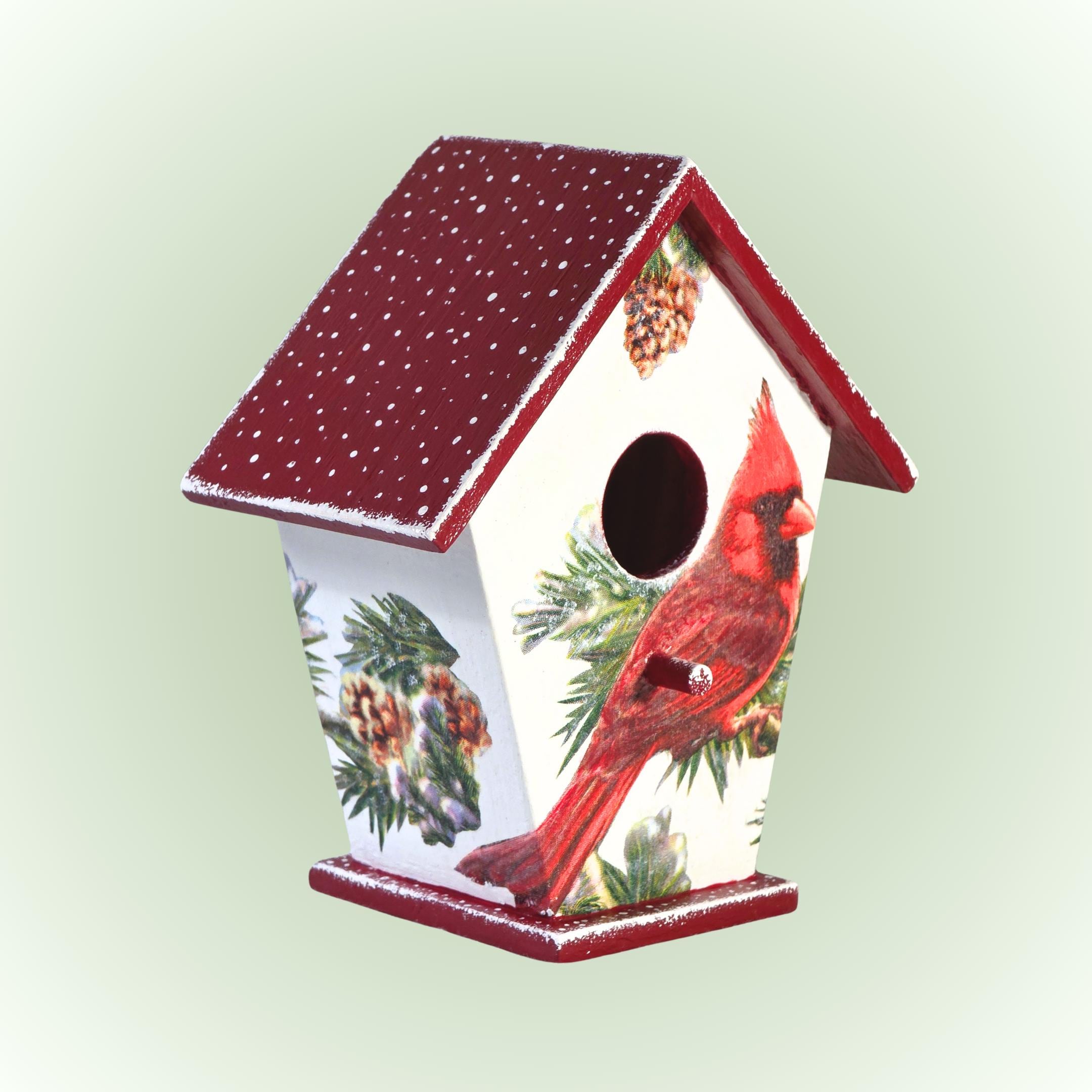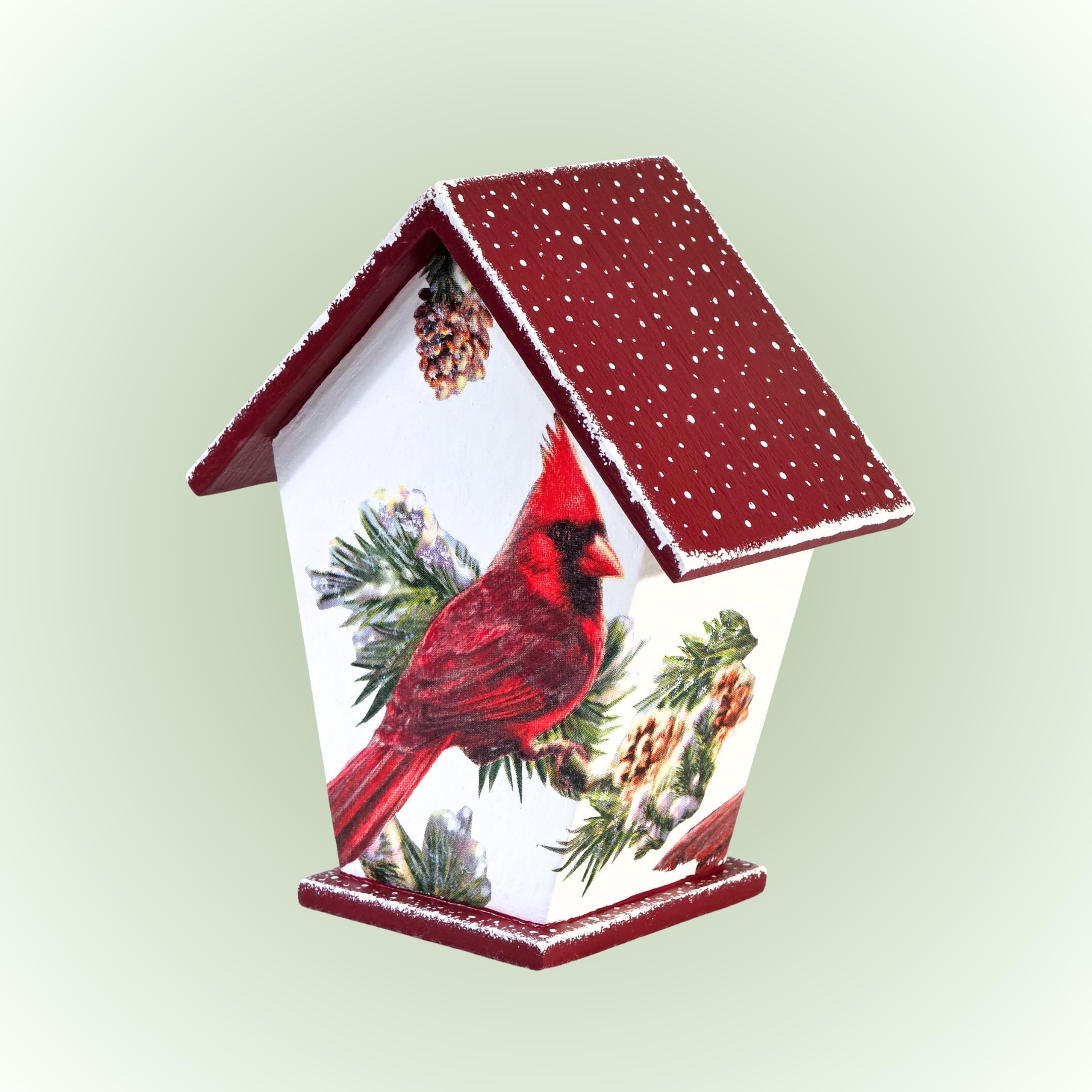 Bring the quiet beauty of winter indoors with these Winter Cardinal collectible birdhouses — handcrafted treasures that celebrate nature’s most striking winter visitor. Handcrafted with love, each Winter Cardinal birdhouse is upcycled from unfinished wood and hand-decoupaged with vivid red cardinals on snowy pine branches. Finished in our custom “bright burgundy” paint, they bring cozy, woodland charm to shelves, mantels, or holiday displays.