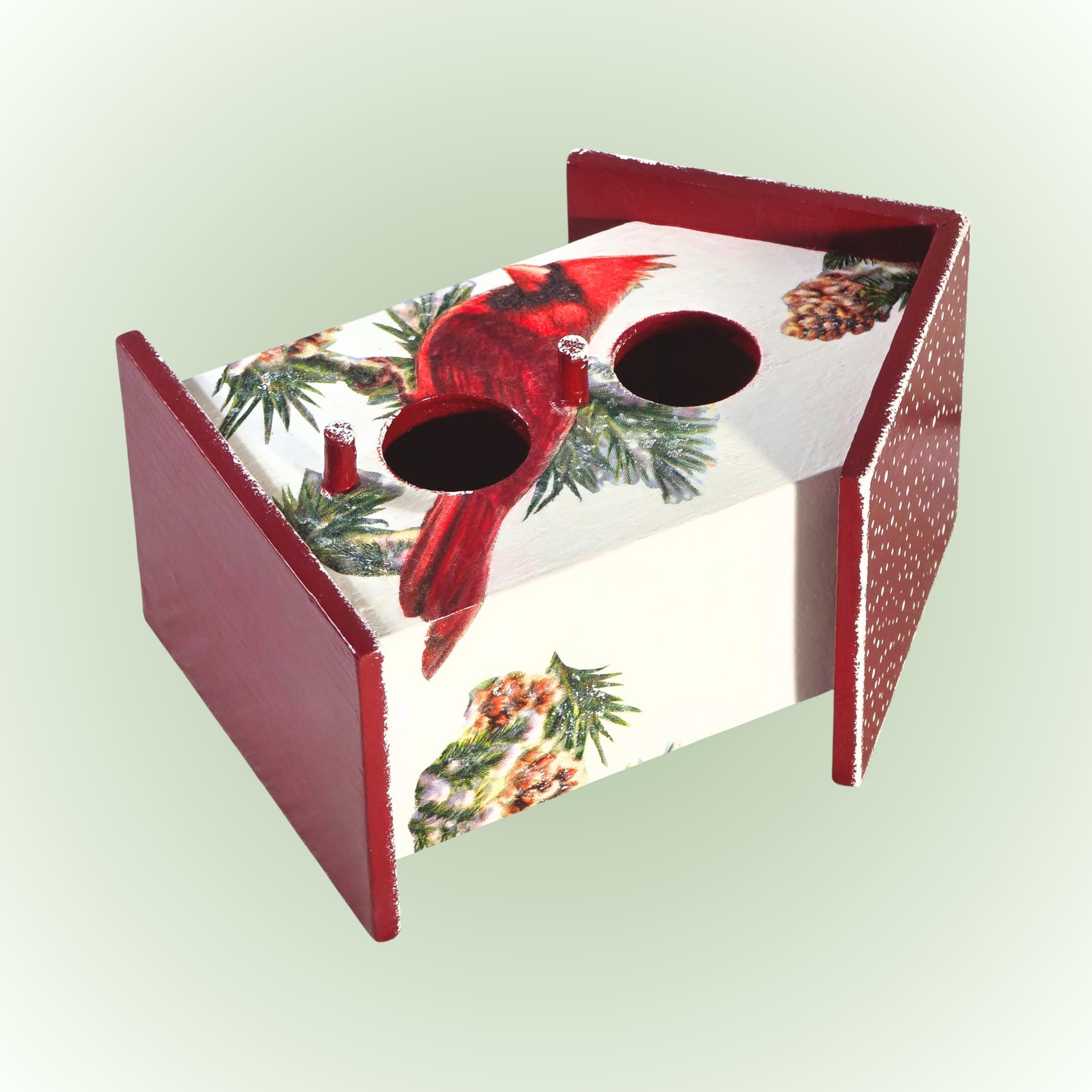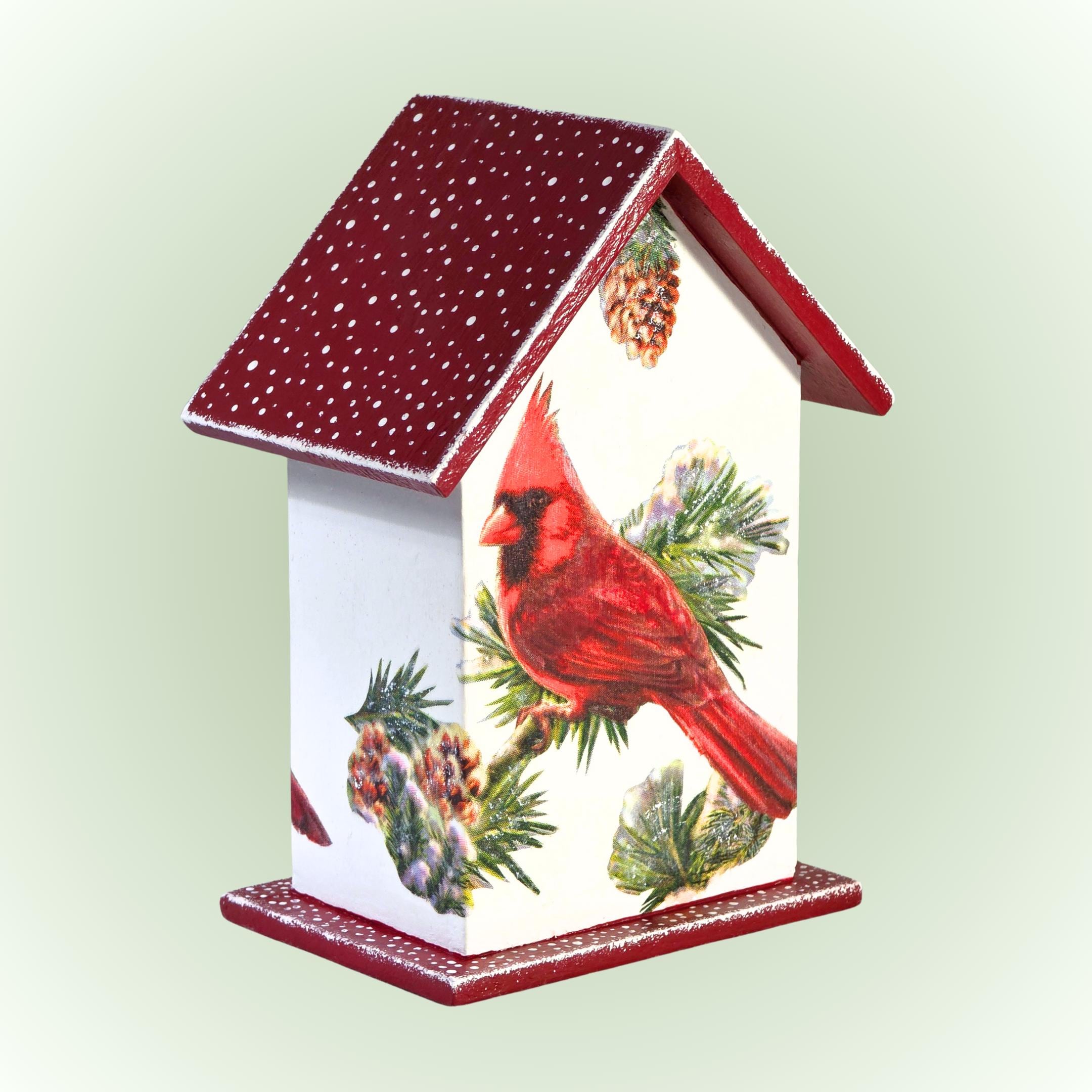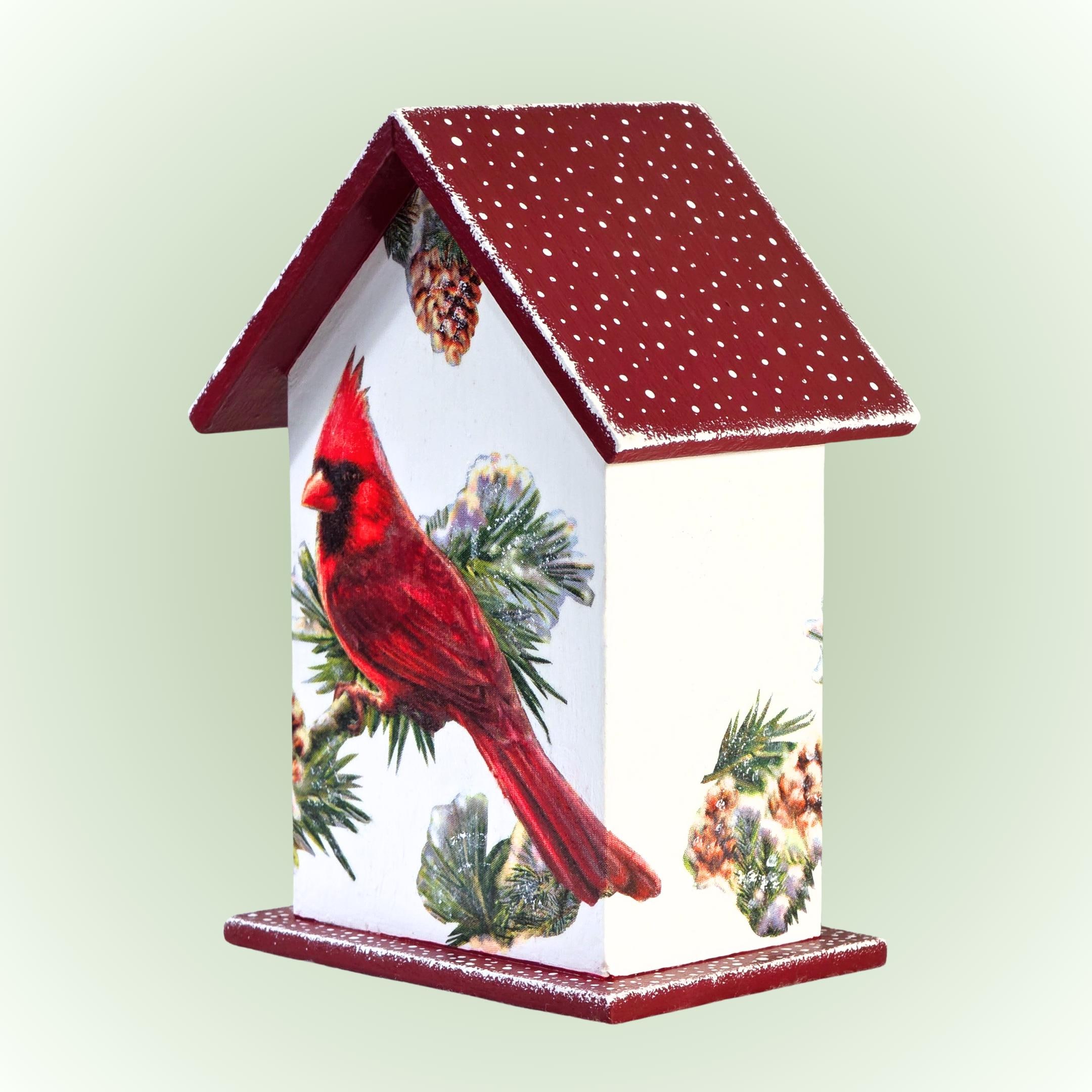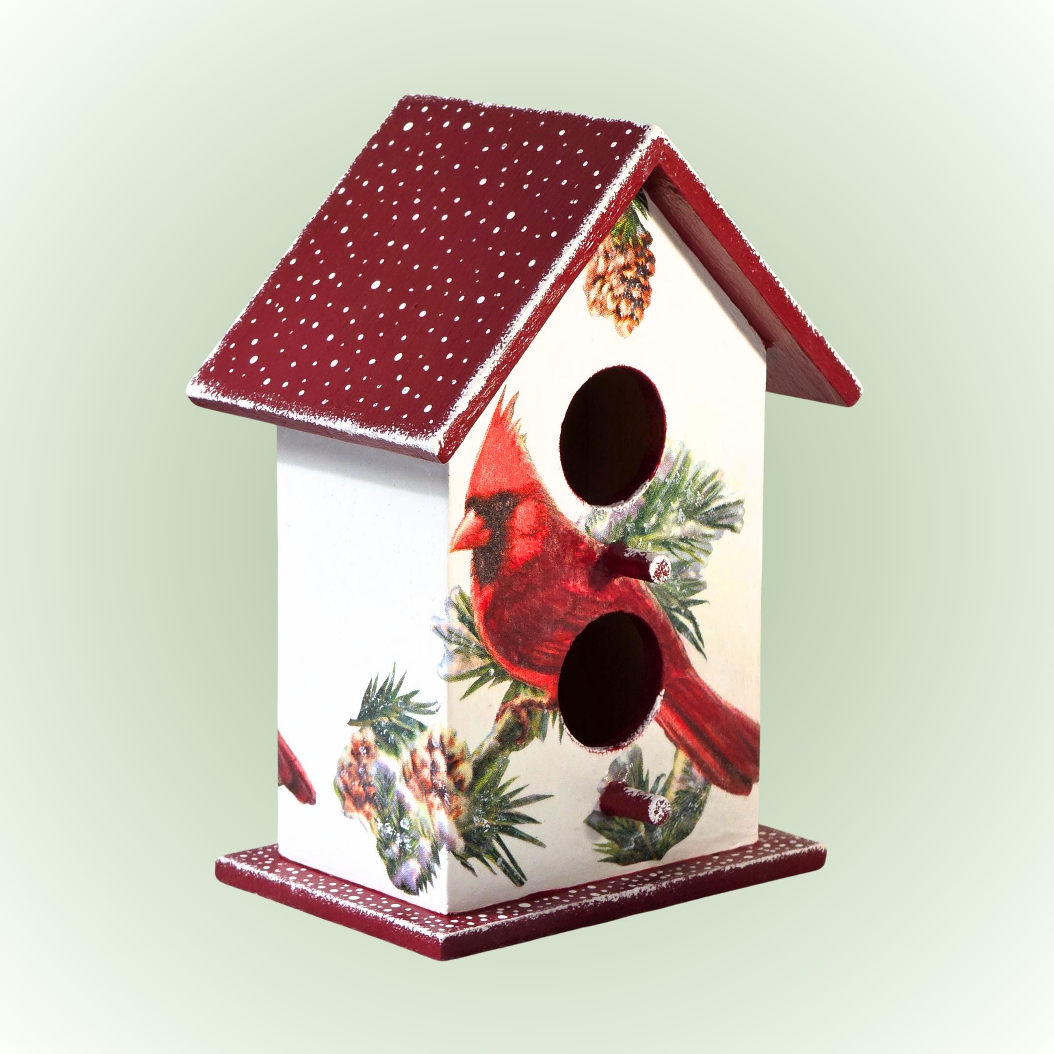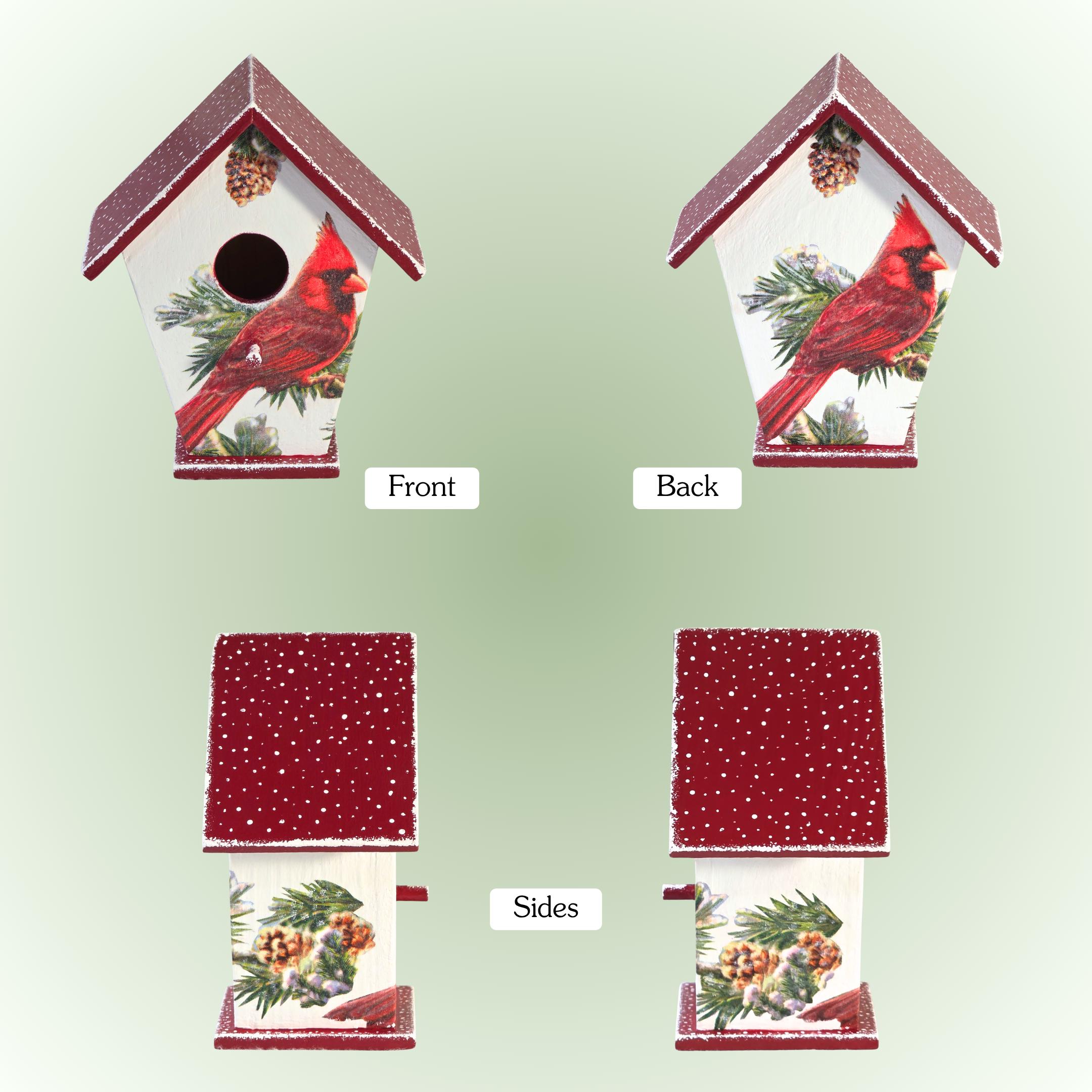 Bring the quiet beauty of winter indoors with these Winter Cardinal collectible birdhouses — handcrafted treasures that celebrate nature’s most striking winter visitor. Handcrafted with love, each Winter Cardinal birdhouse is upcycled from unfinished wood and hand-decoupaged with vivid red cardinals on snowy pine branches. Finished in our custom “bright burgundy” paint, they bring cozy, woodland charm to shelves, mantels, or holiday displays.
