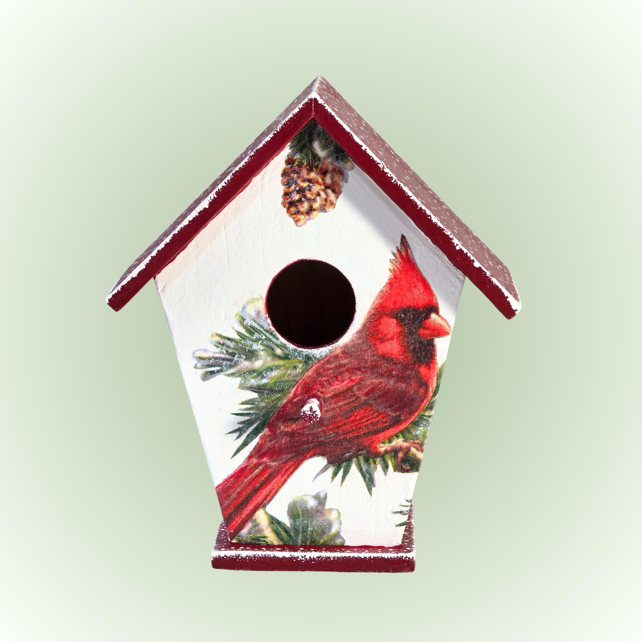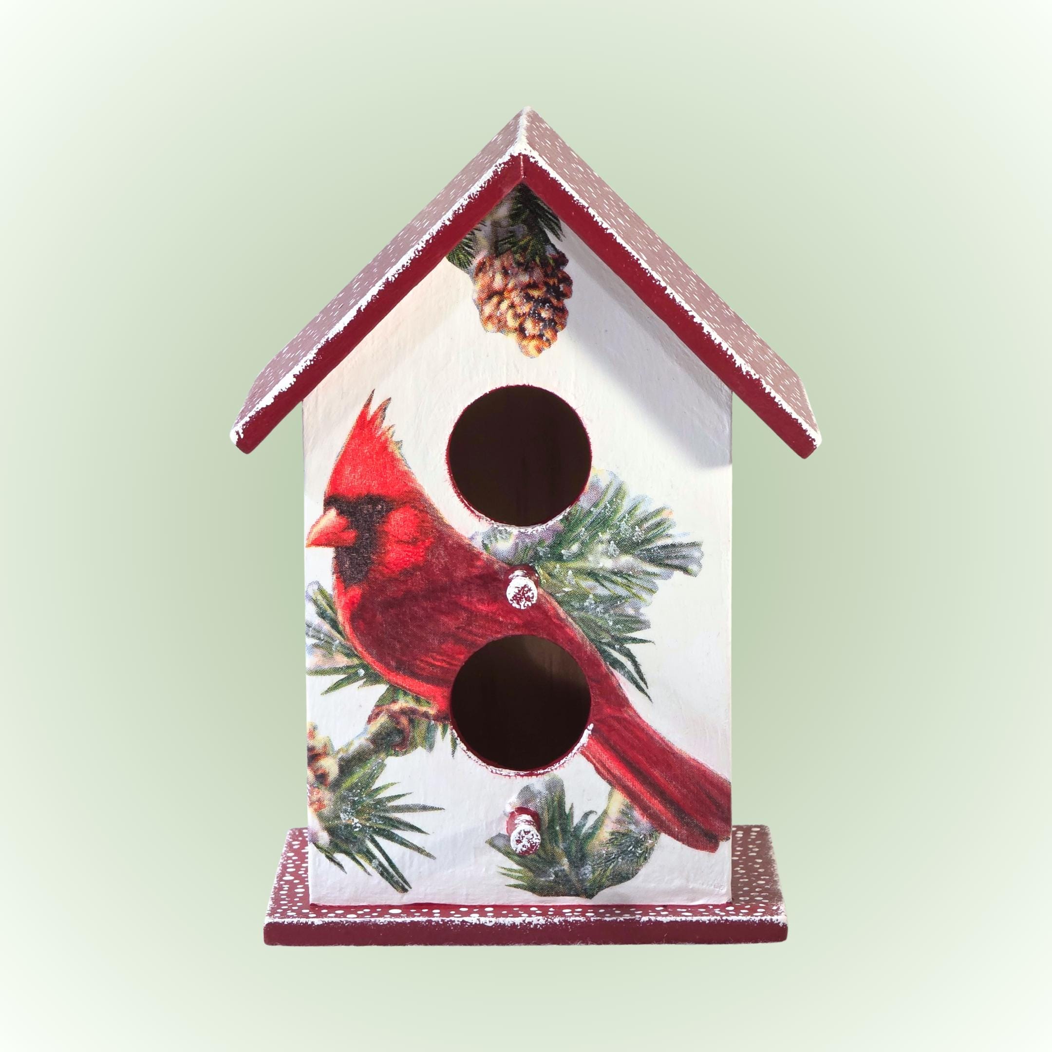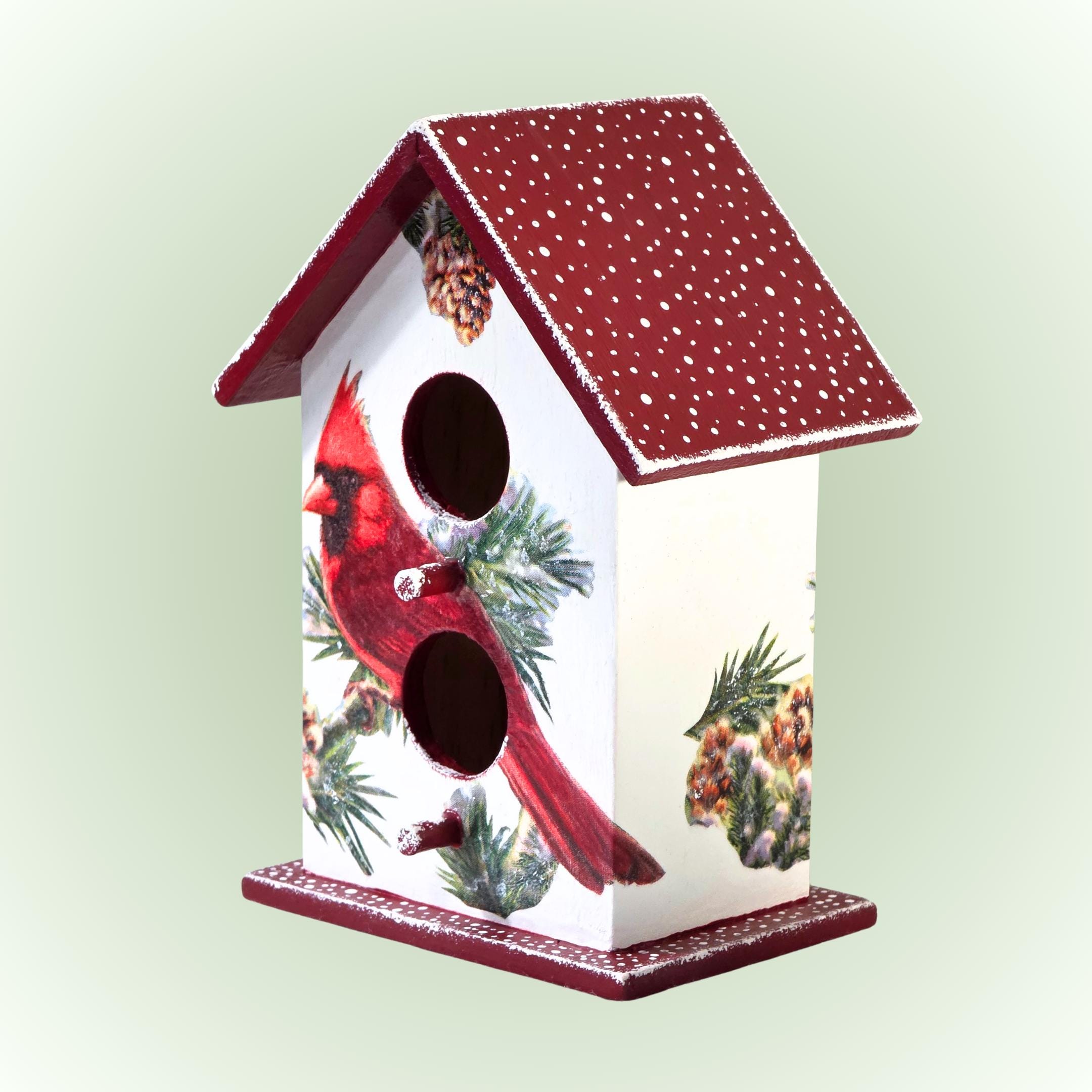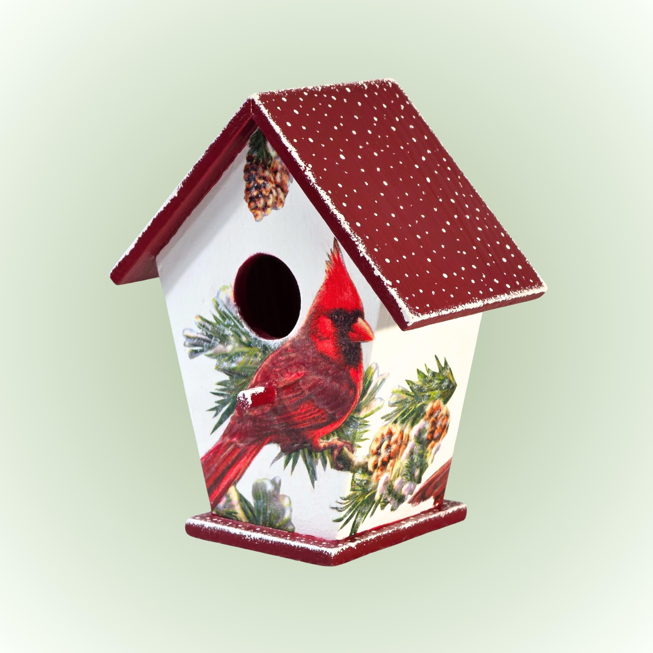 Bring the quiet beauty of winter indoors with these Winter Cardinal collectible birdhouses — handcrafted treasures that celebrate nature’s most striking winter visitor. Handcrafted with love, each Winter Cardinal birdhouse is upcycled from unfinished wood and hand-decoupaged with vivid red cardinals on snowy pine branches. Finished in our custom “bright burgundy” paint, they bring cozy, woodland charm to shelves, mantels, or holiday displays.
