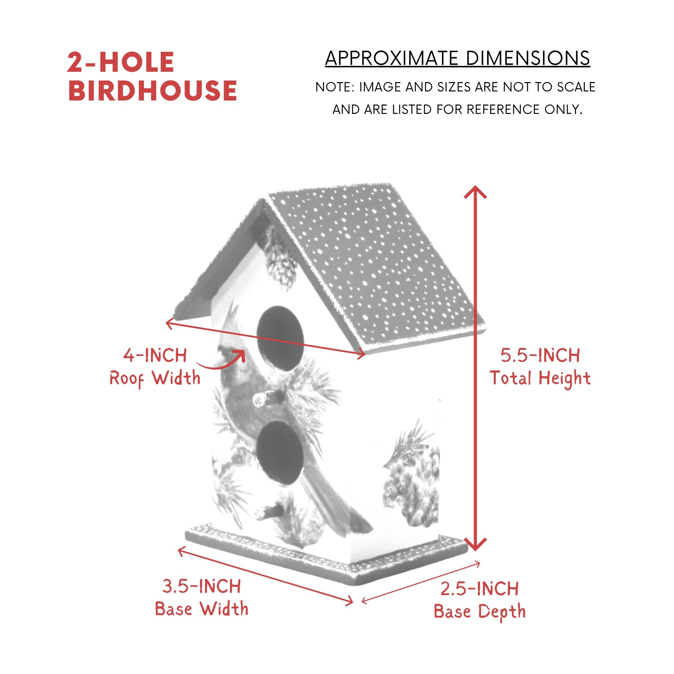 2-Hole Birdhouse: 5.5-inches TOTAL HEIGHT 3.5-inches BASE WIDTH 2.5-inches BASE DEPTH 4.0-inches ROOF WIDTH