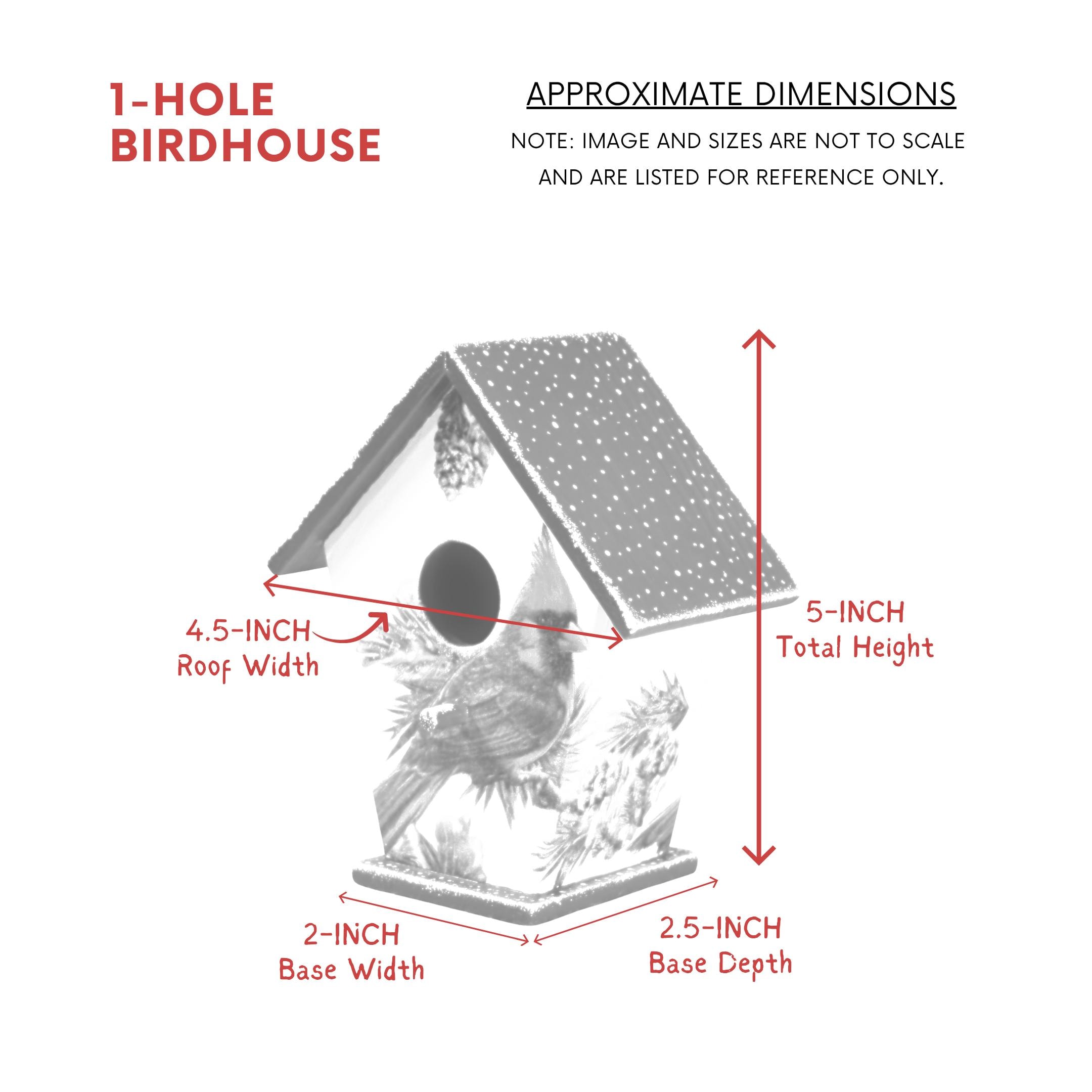1-Hole Birdhouse: 5.0-inches TOTAL HEIGHT 2.0-inches BASE WIDTH 2.5-inches BASE DEPTH 4.5-inches ROOF WIDTH