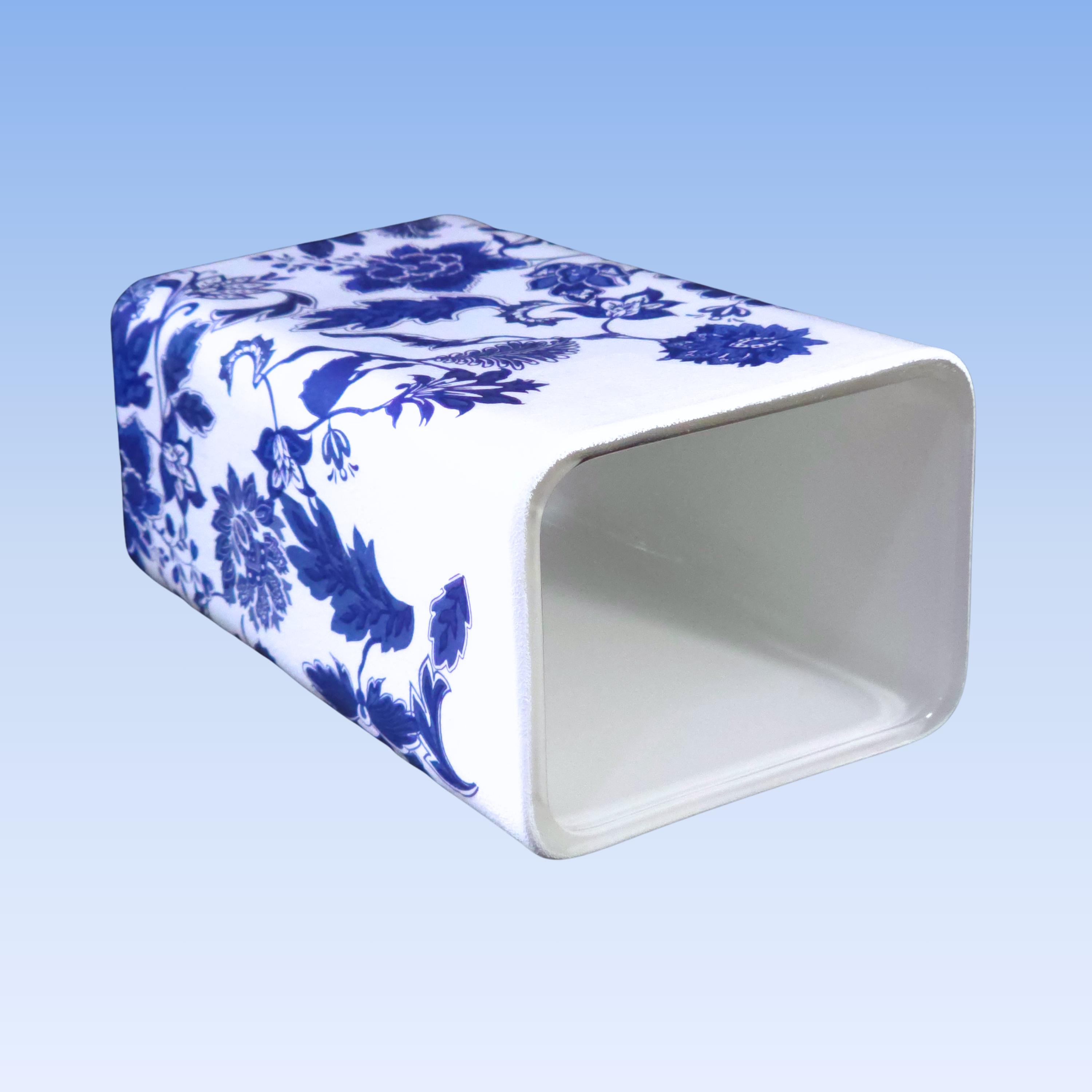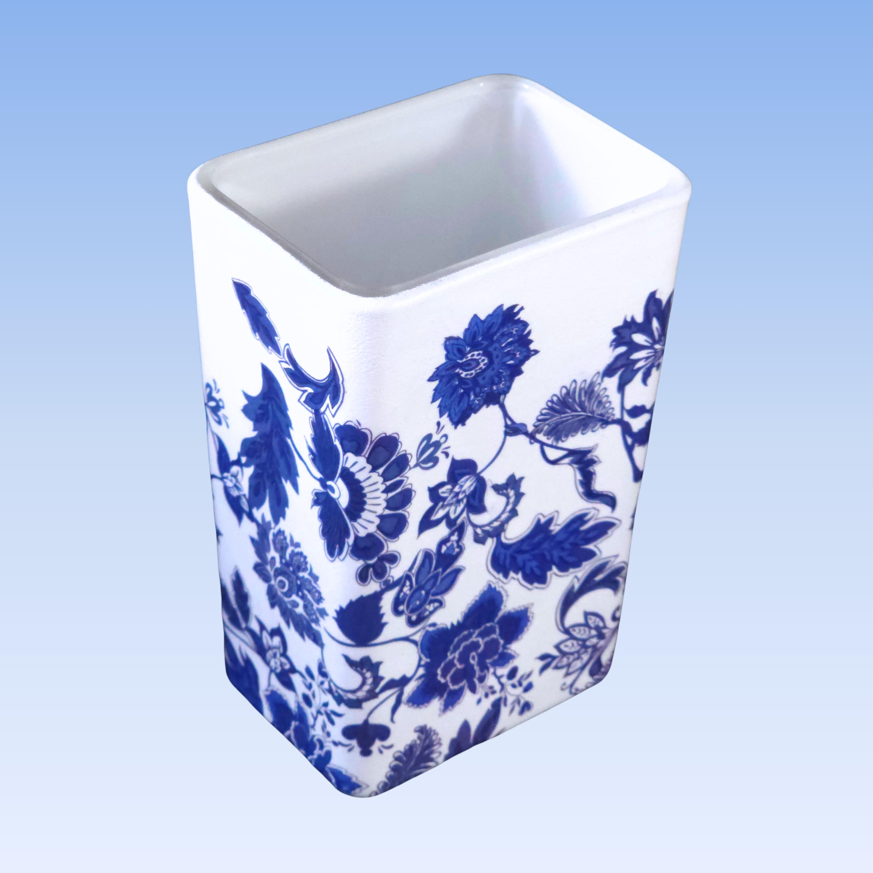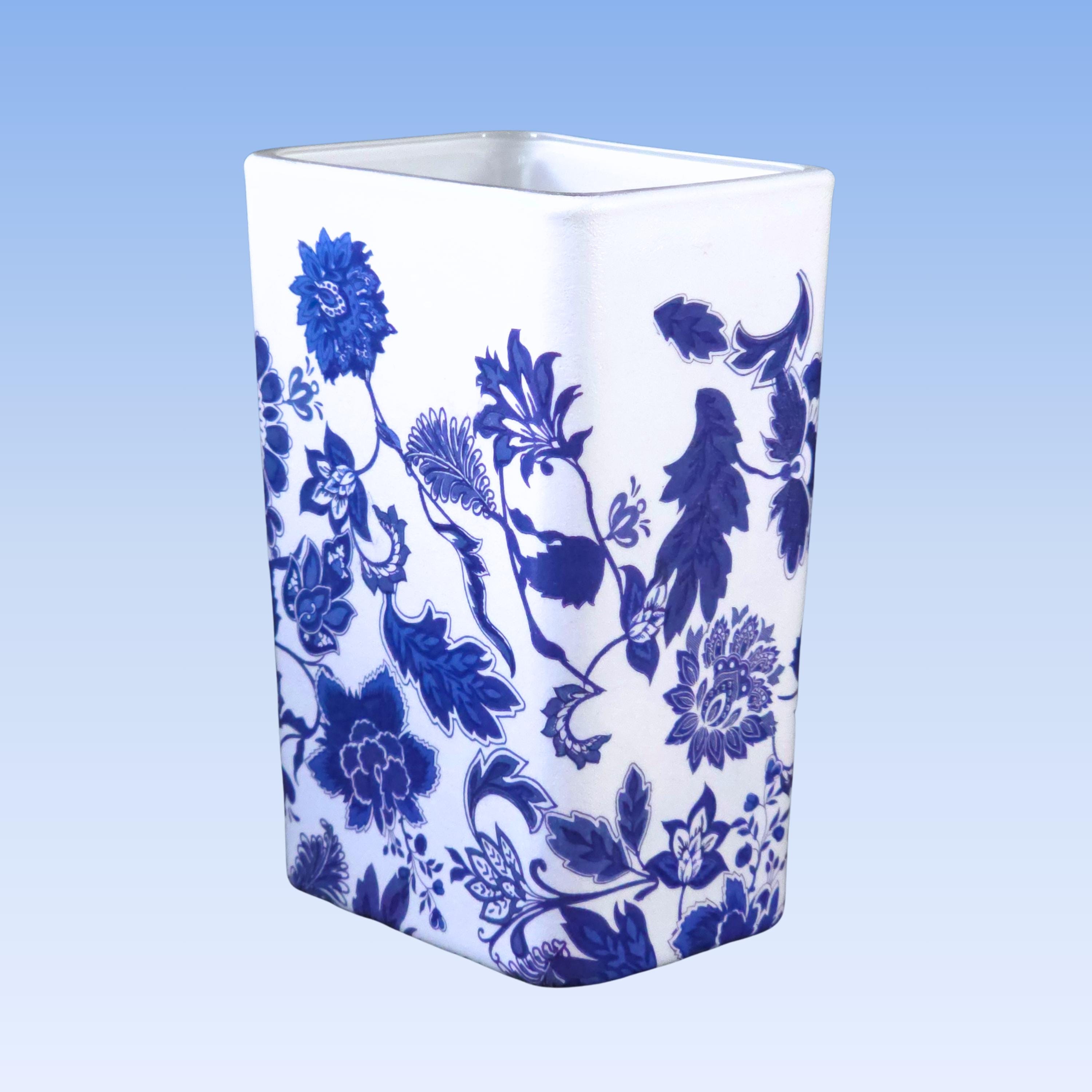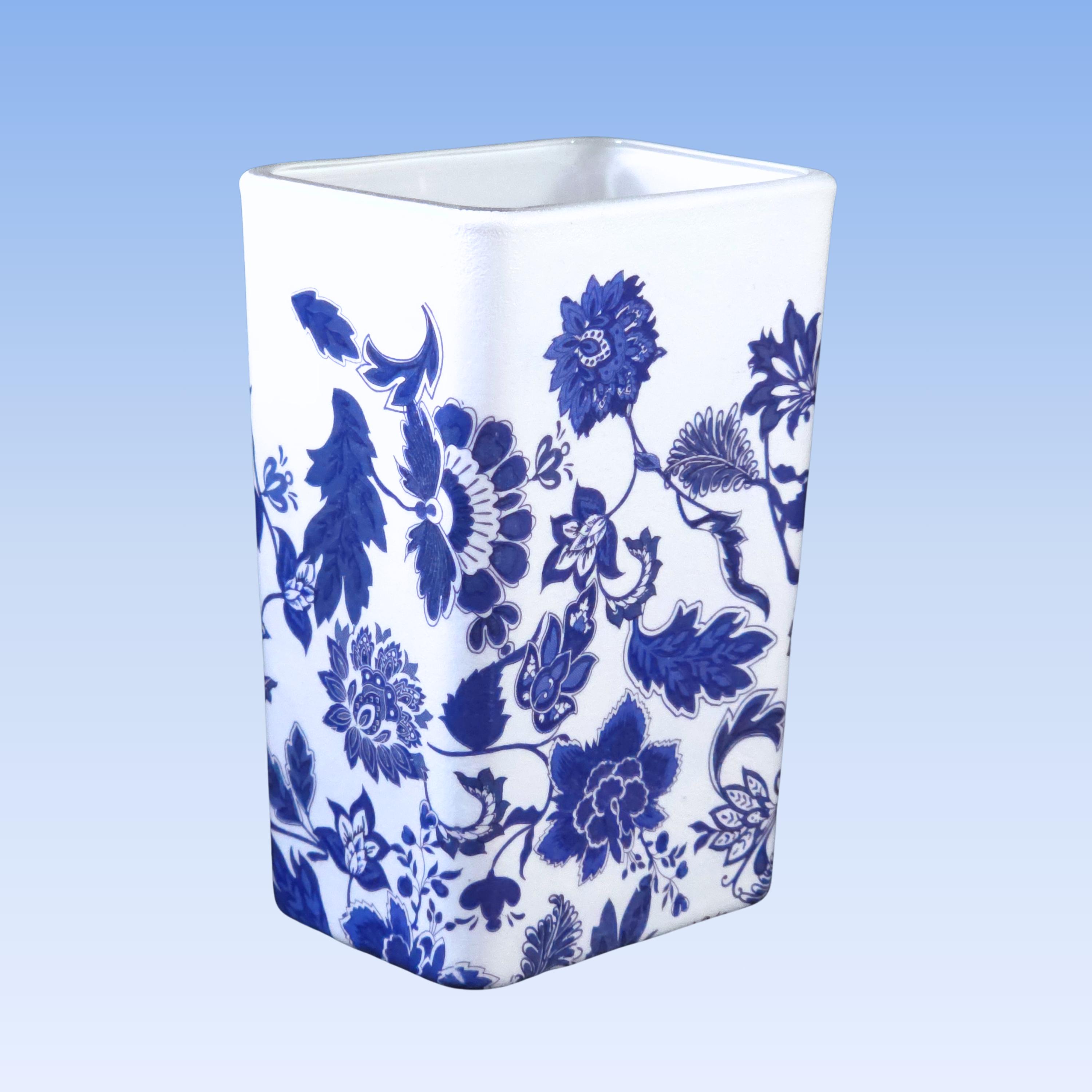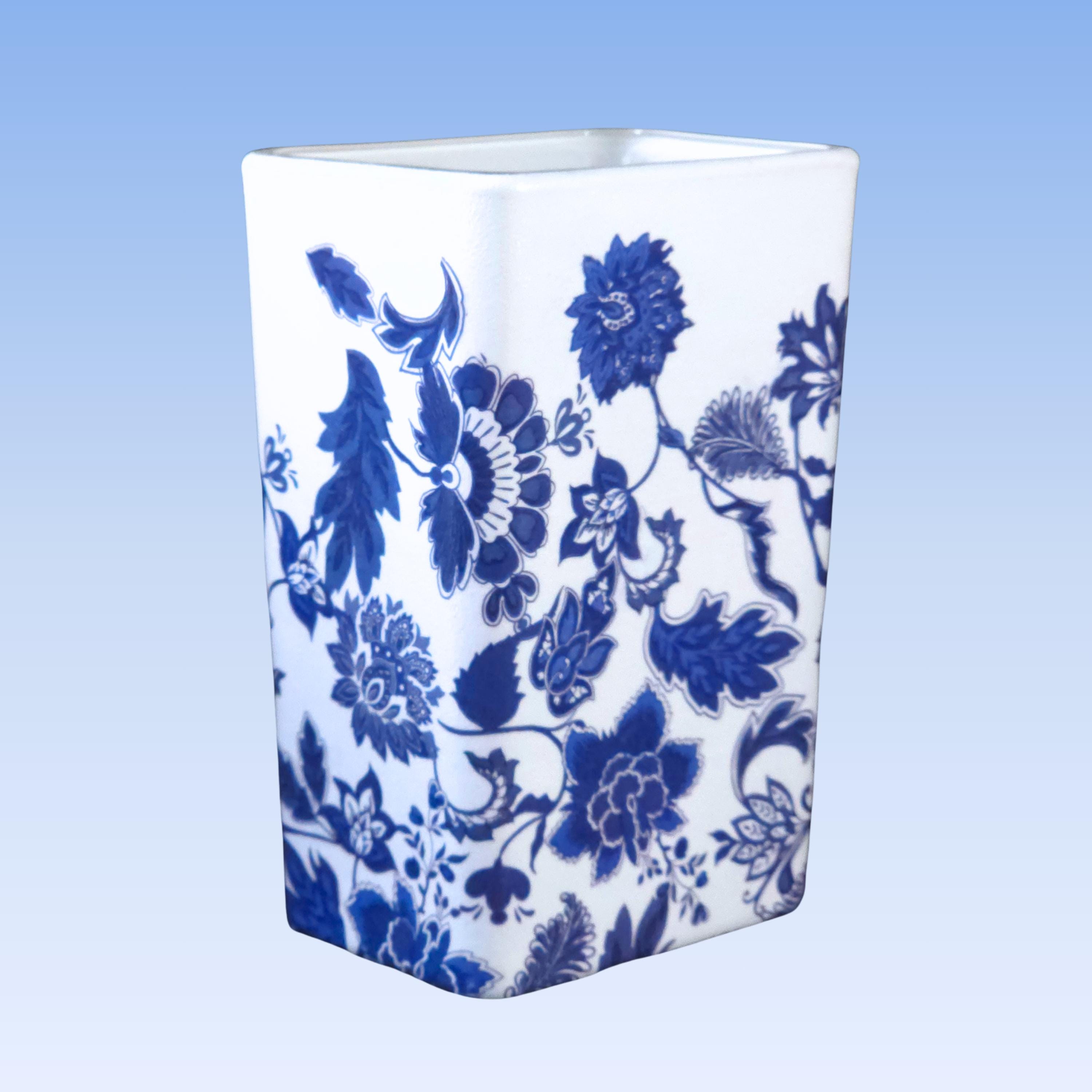 The exterior vertical surfaces are hand-painted white to create a crisp foundation for the decoupage artwork. Each vase is then carefully hand-decoupaged using designer paper napkins featuring intricate blue florals drawn from classic chinoiserie motifs. Once complete, the exterior is sealed for durability, resulting in a polished yet approachable accent that feels both traditional and fresh.