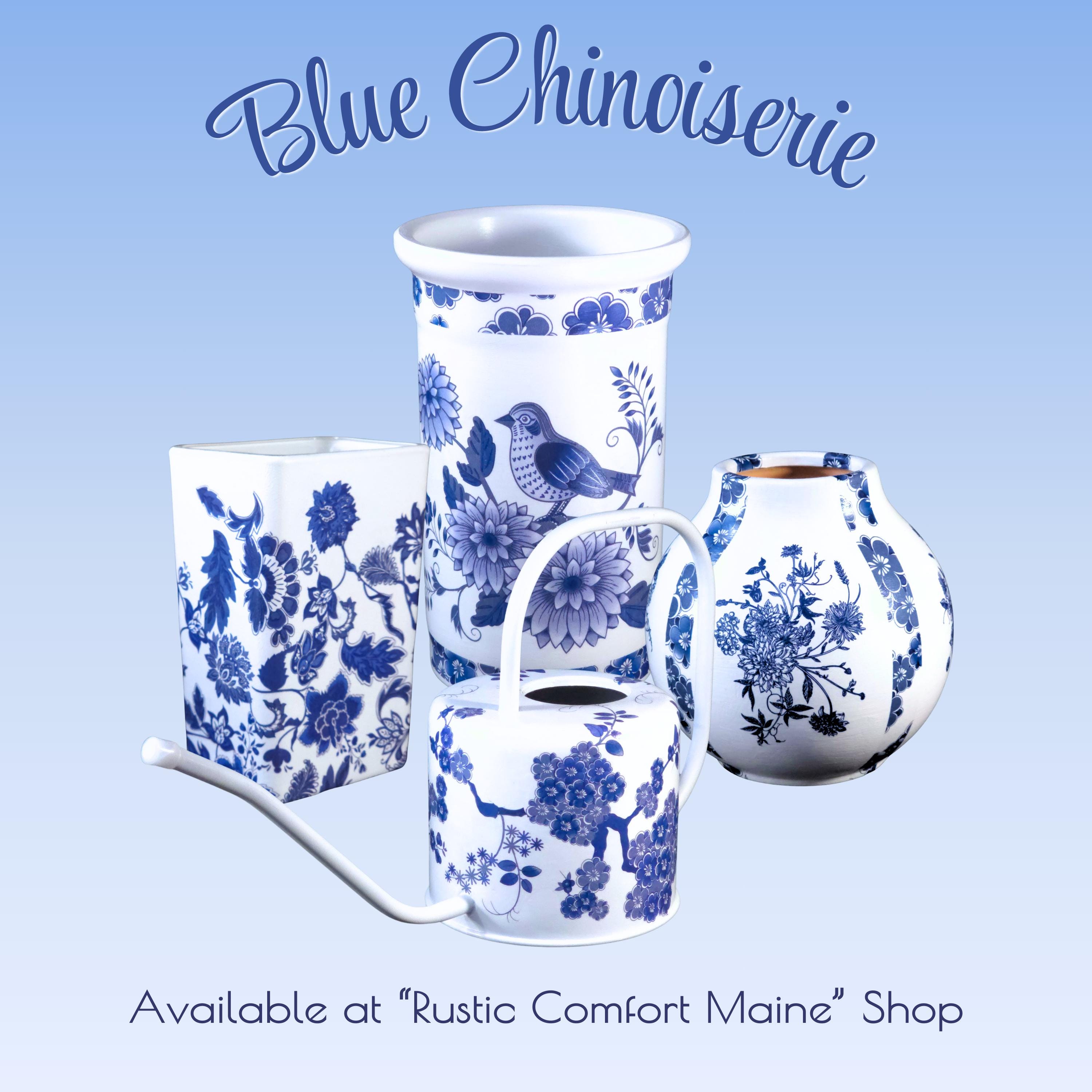 Explore coordinating pieces in our Chinoiserie Collection at RusticComfortMaine, where classic blue-and-white patterns meet handcrafted charm.