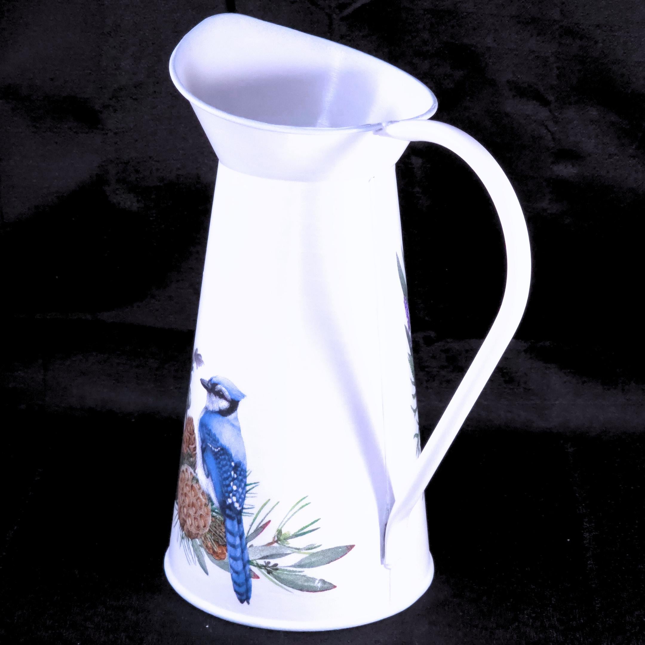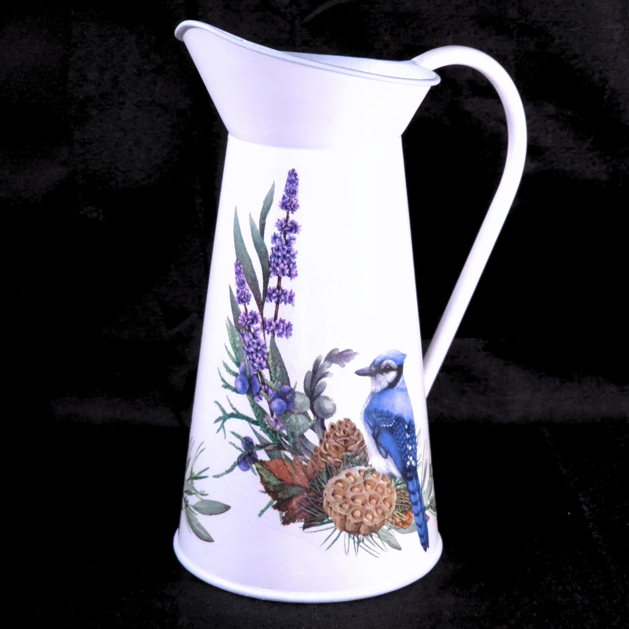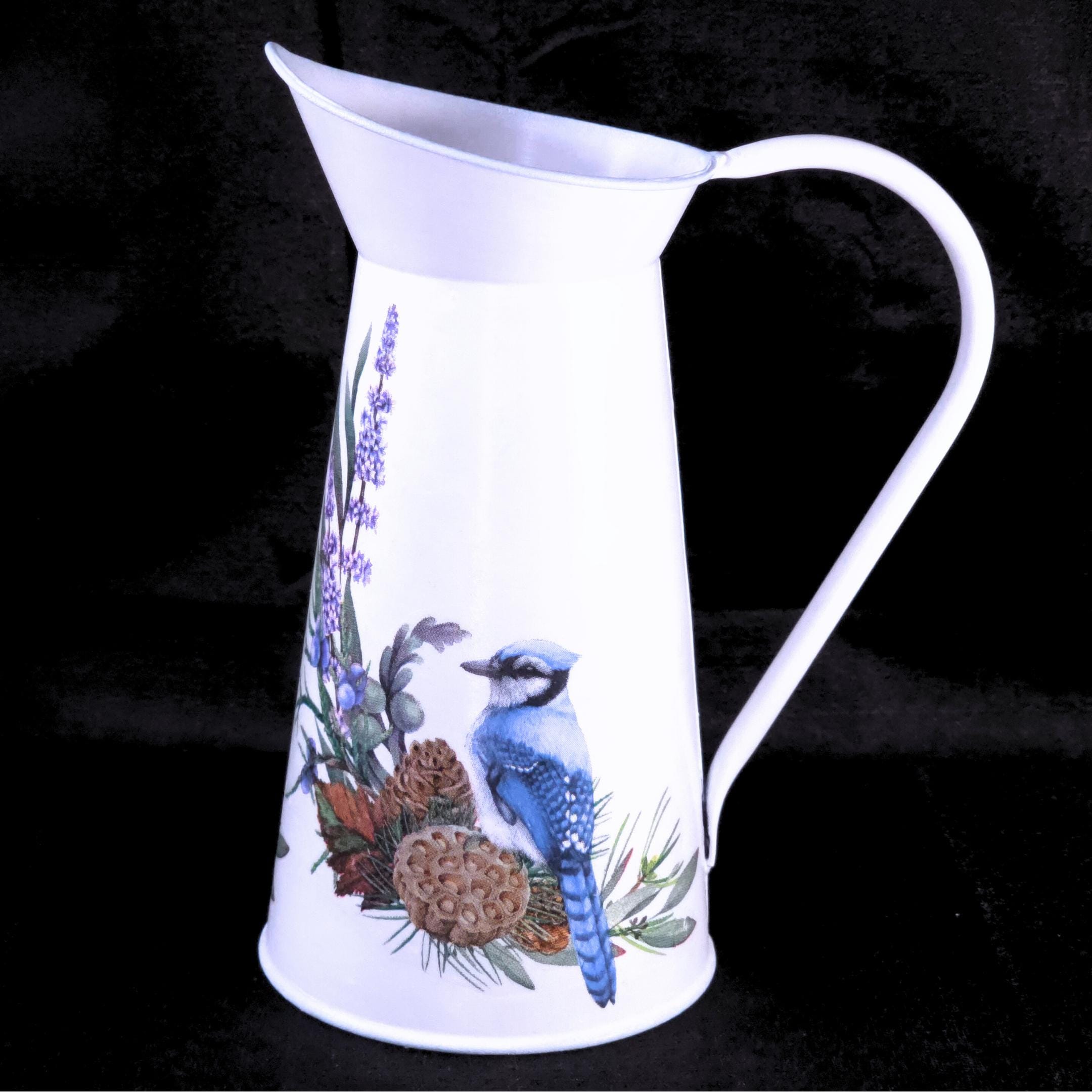 Each white metal pitcher is hand-decoupaged with designer paper napkins featuring regal blue jays perched among sprays of wildflower. The result is a light, airy farmhouse accent that brings warmth and personality to shelves, mantels, sideboards, or tables.