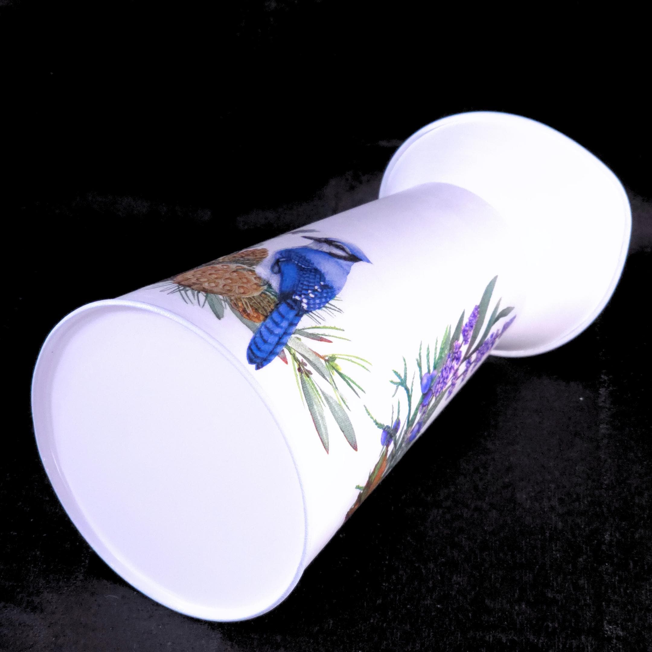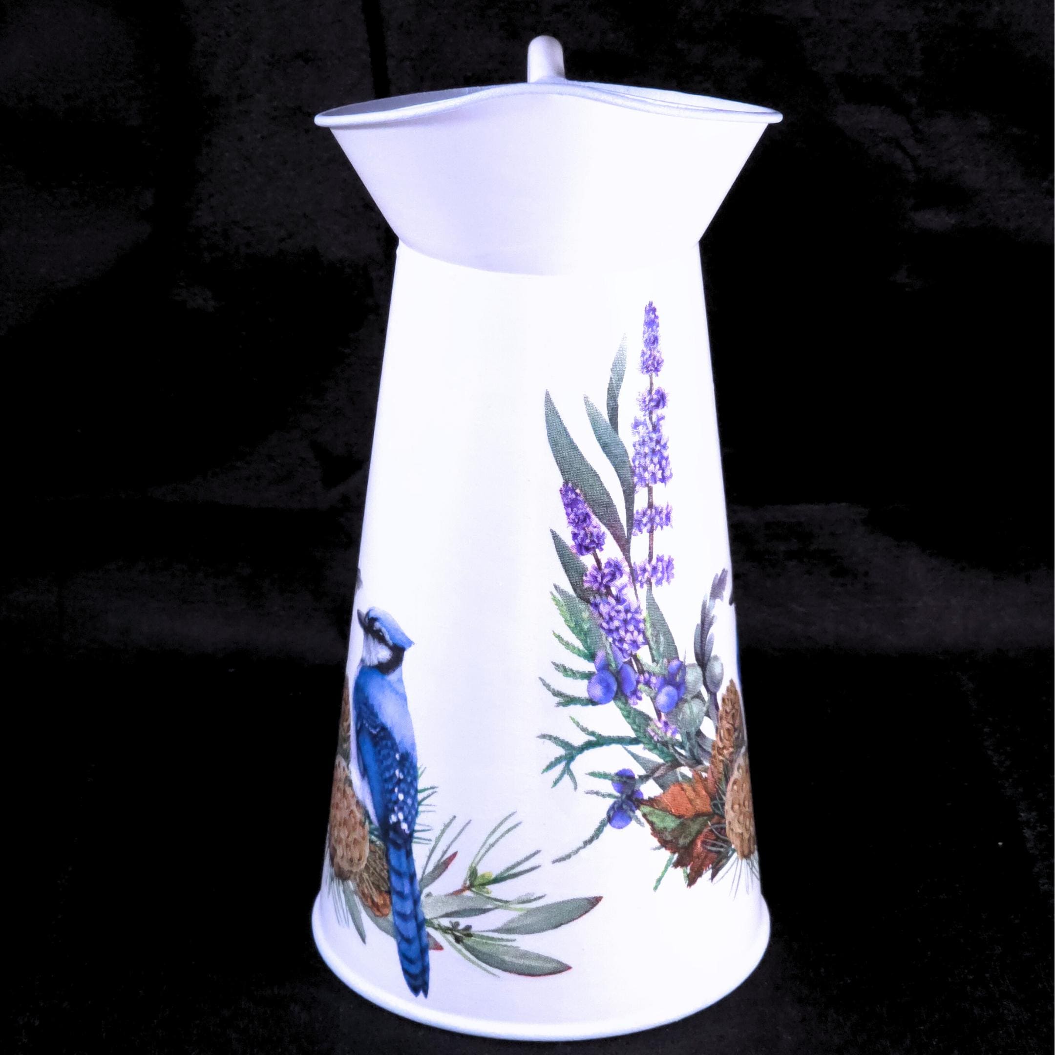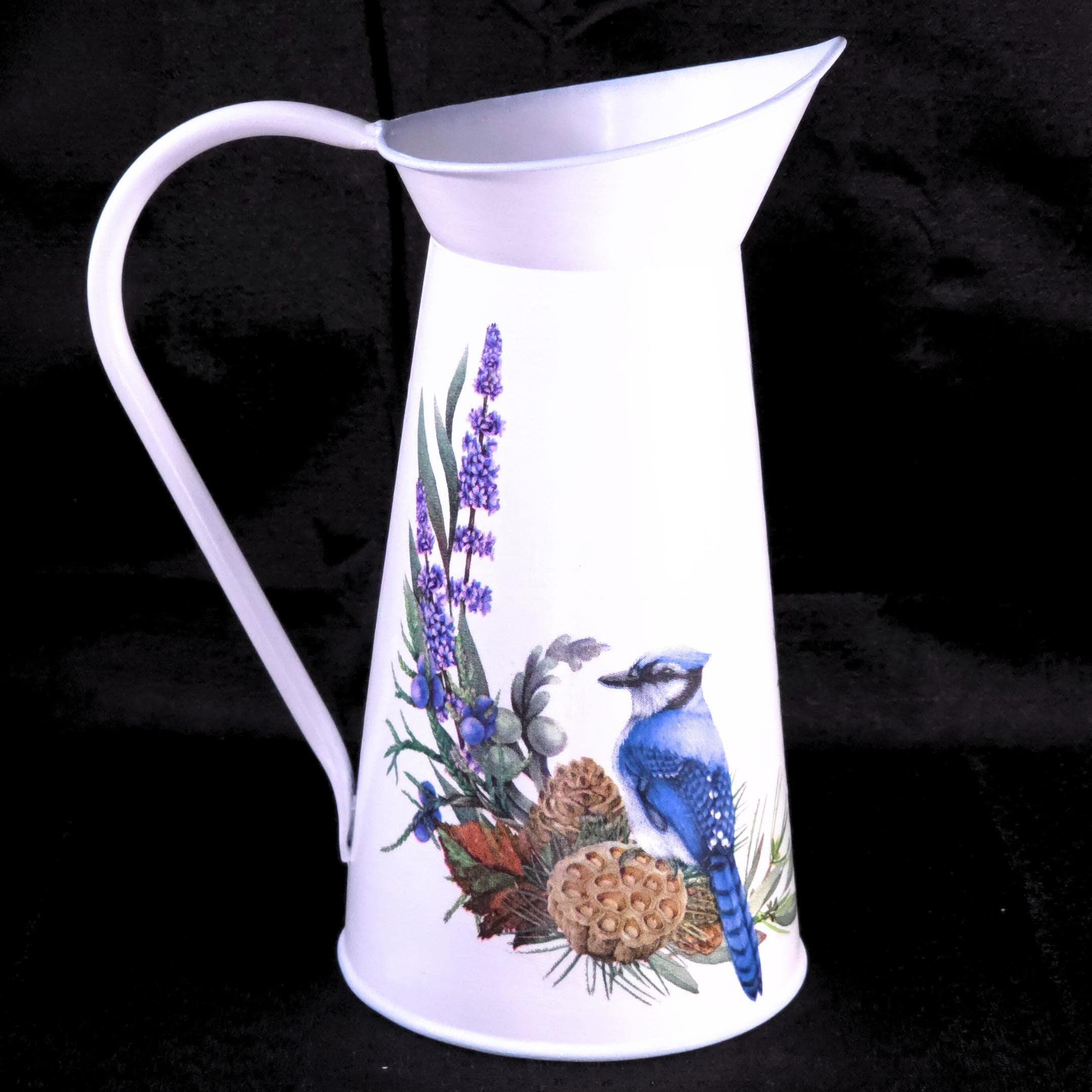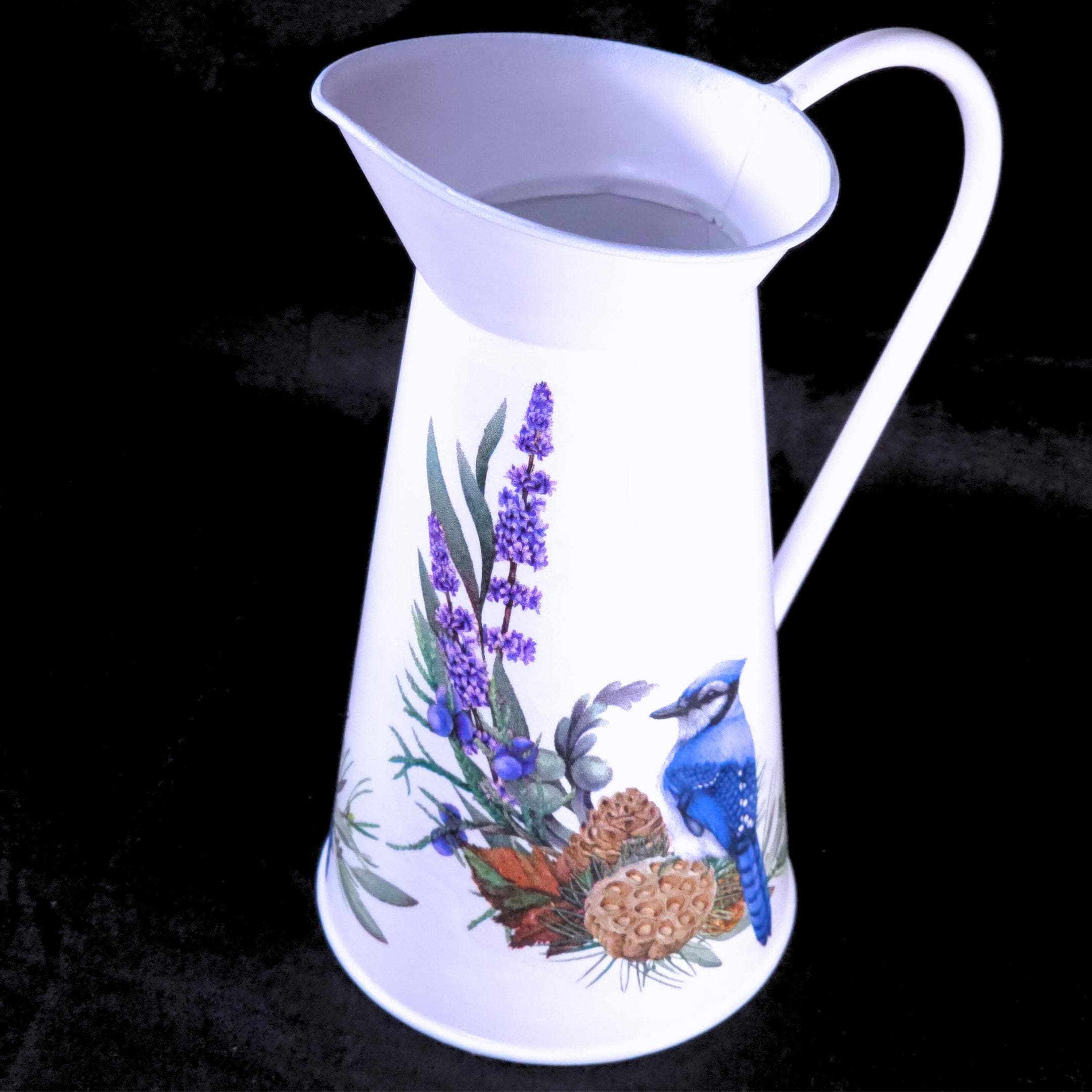 Each white metal pitcher is hand-decoupaged with designer paper napkins featuring regal blue jays perched among sprays of wildflower. The result is a light, airy farmhouse accent that brings warmth and personality to shelves, mantels, sideboards, or tables.