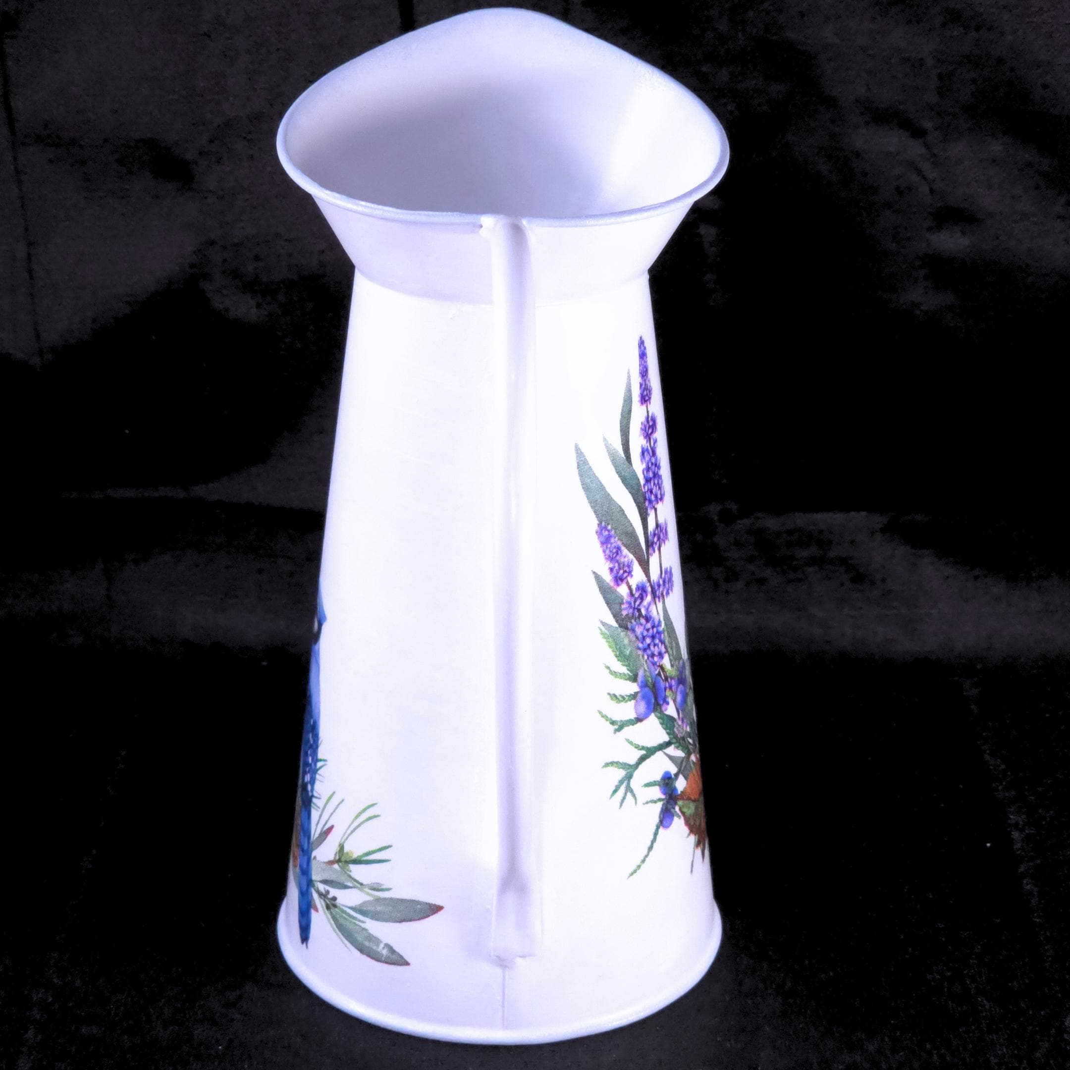 Bring a soft, cottage-garden charm to your home with this Blue Jay metal pitcher, thoughtfully upcycled and handcrafted as a beautiful and functional décor accent. Standing approximately 9 inches tall, this pitcher can hold water and is perfect for displaying fresh flower bouquets, faux florals, or dried arrangements — or simply enjoyed as a stand-alone statement piece.