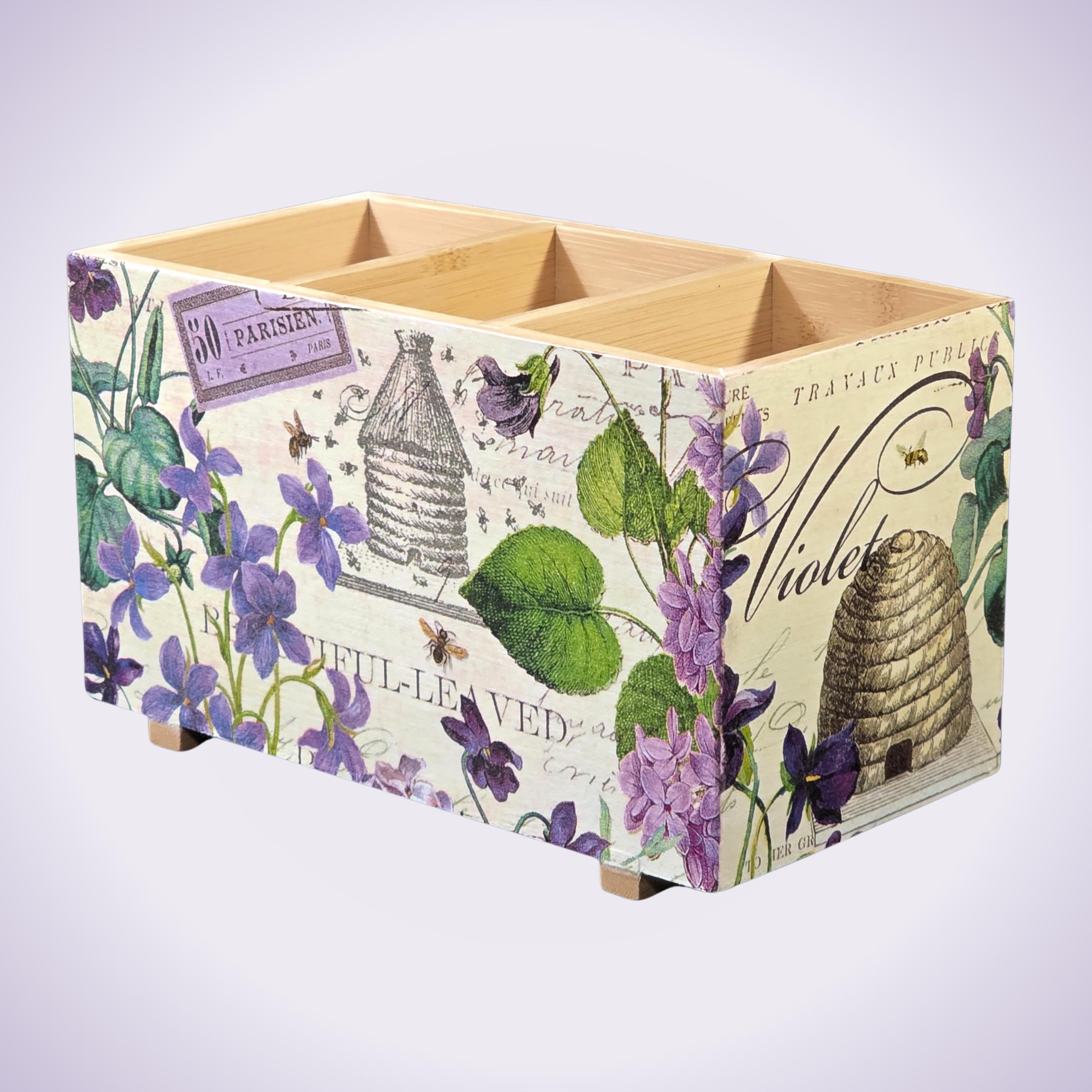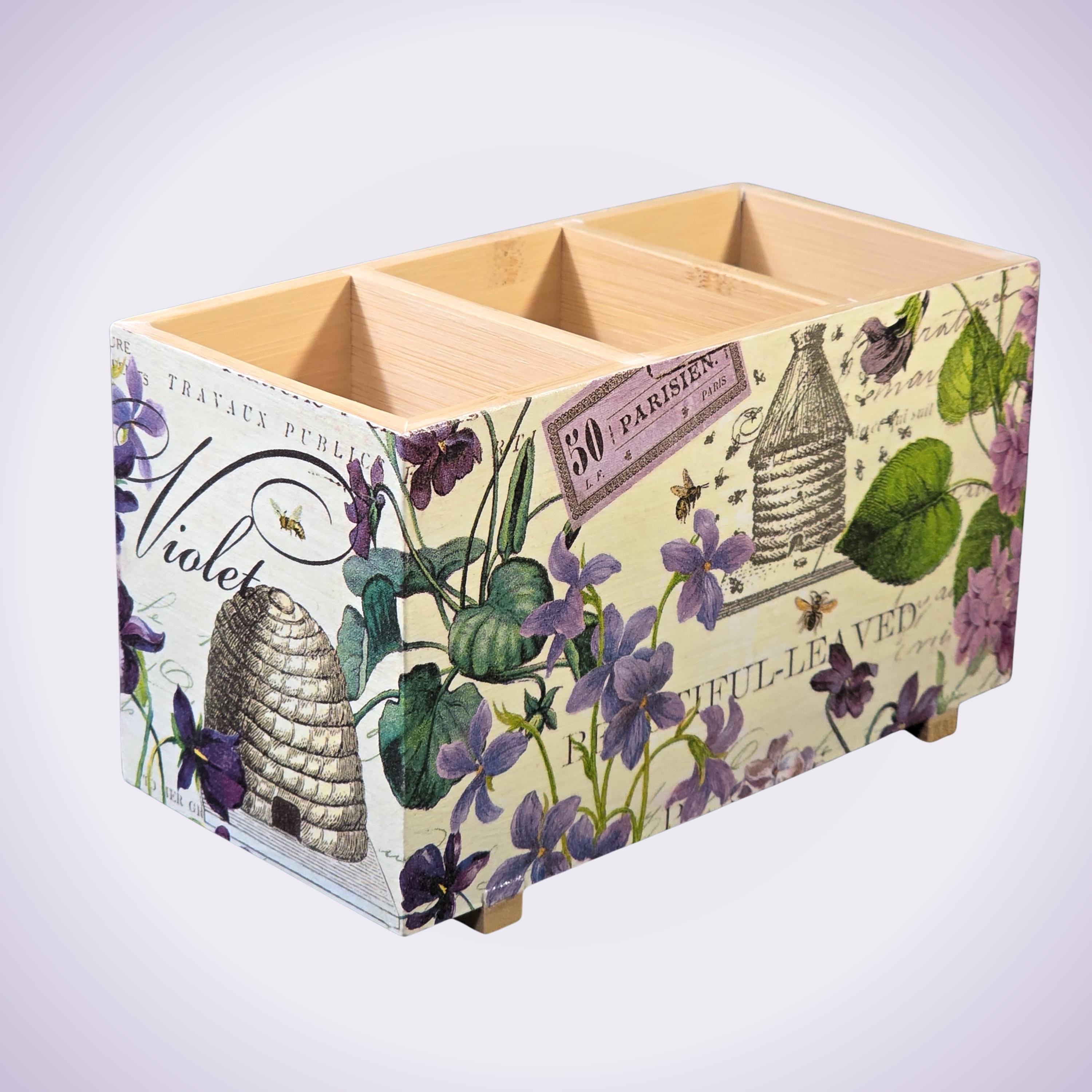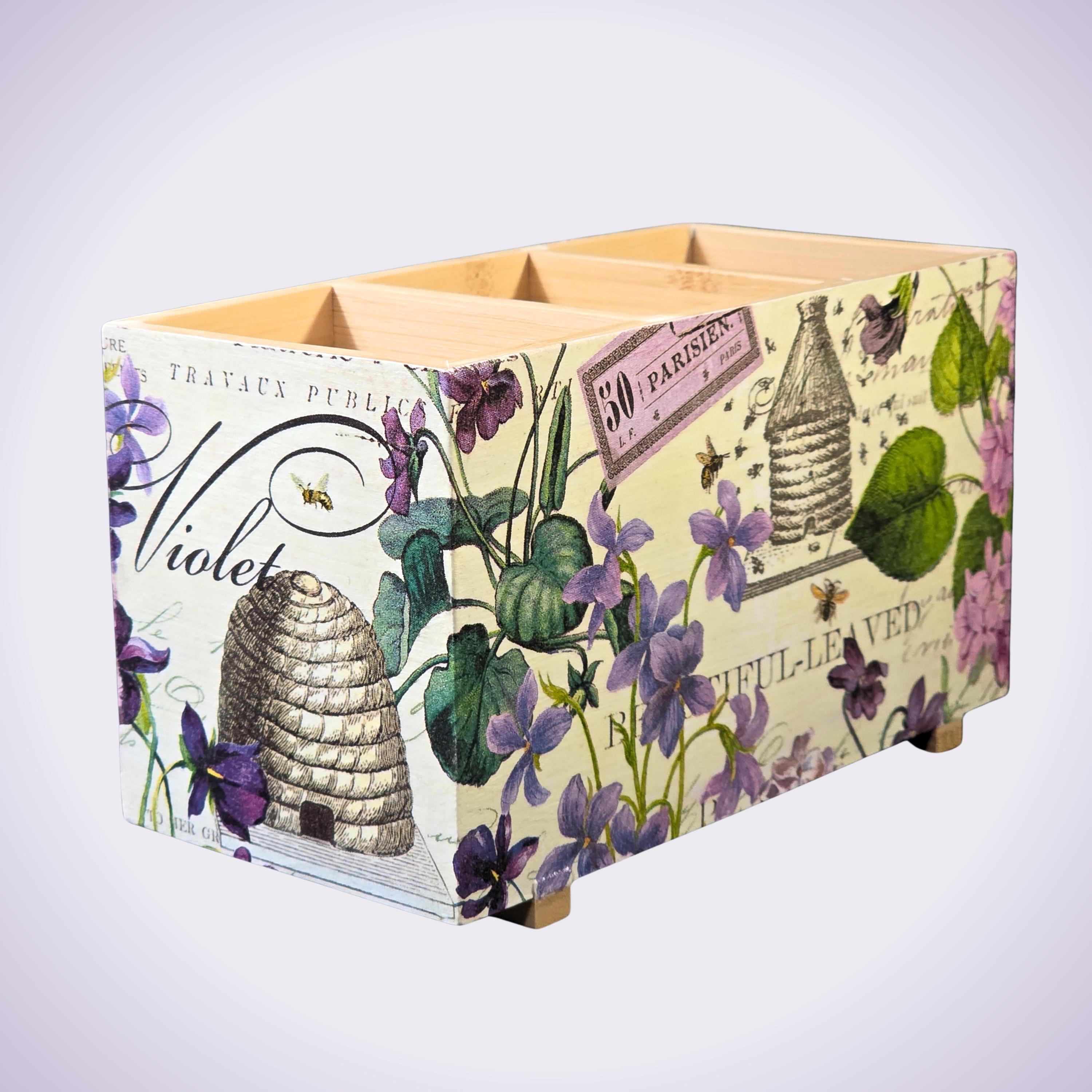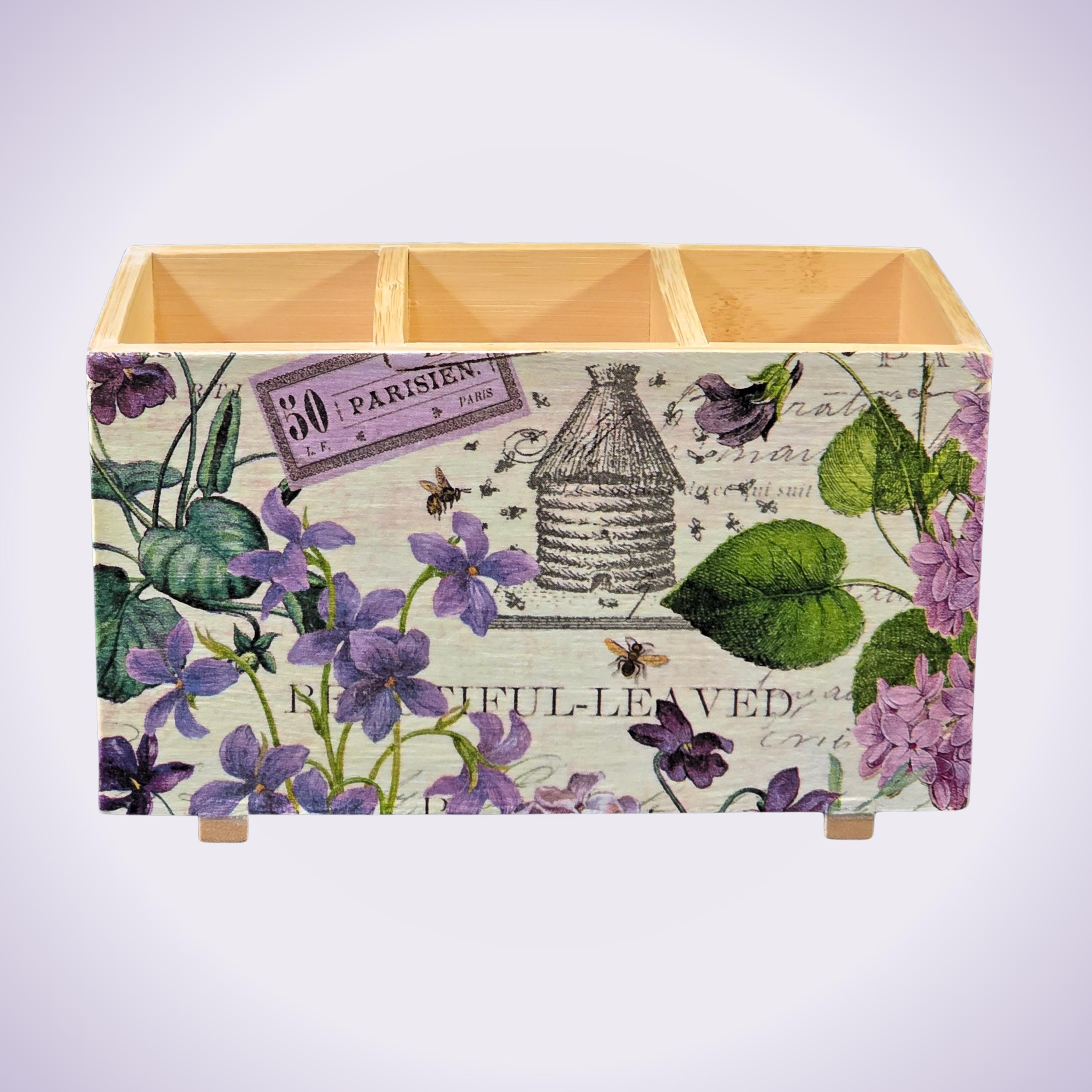 Add a touch of vintage French farmhouse charm to your workspace with this hand-decorated 3-compartment bamboo desk organizer. Featuring rustic bees, classic beehives, soft violets, lilacs, and layered vintage script details, this piece blends functionality with artistic cottage-inspired style.