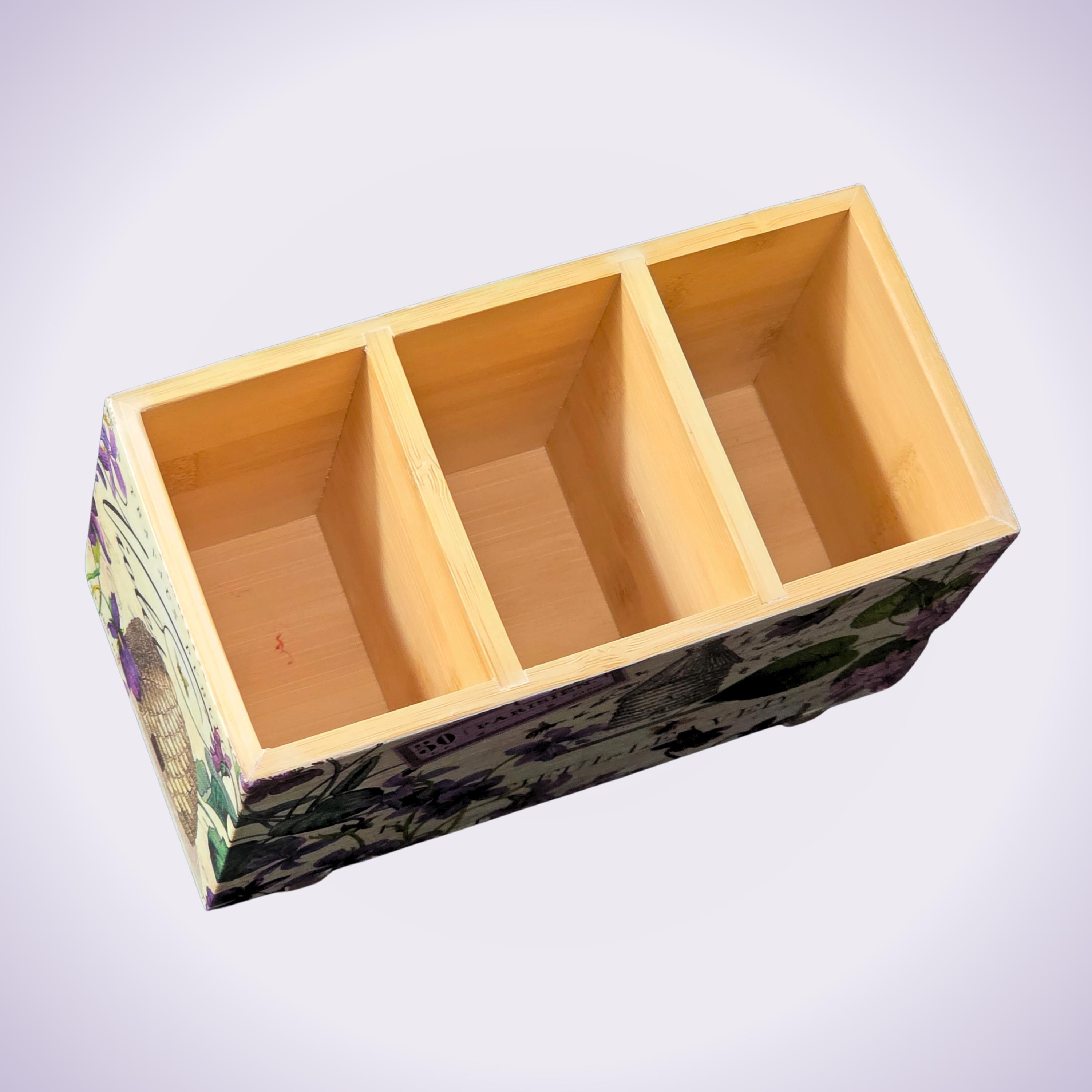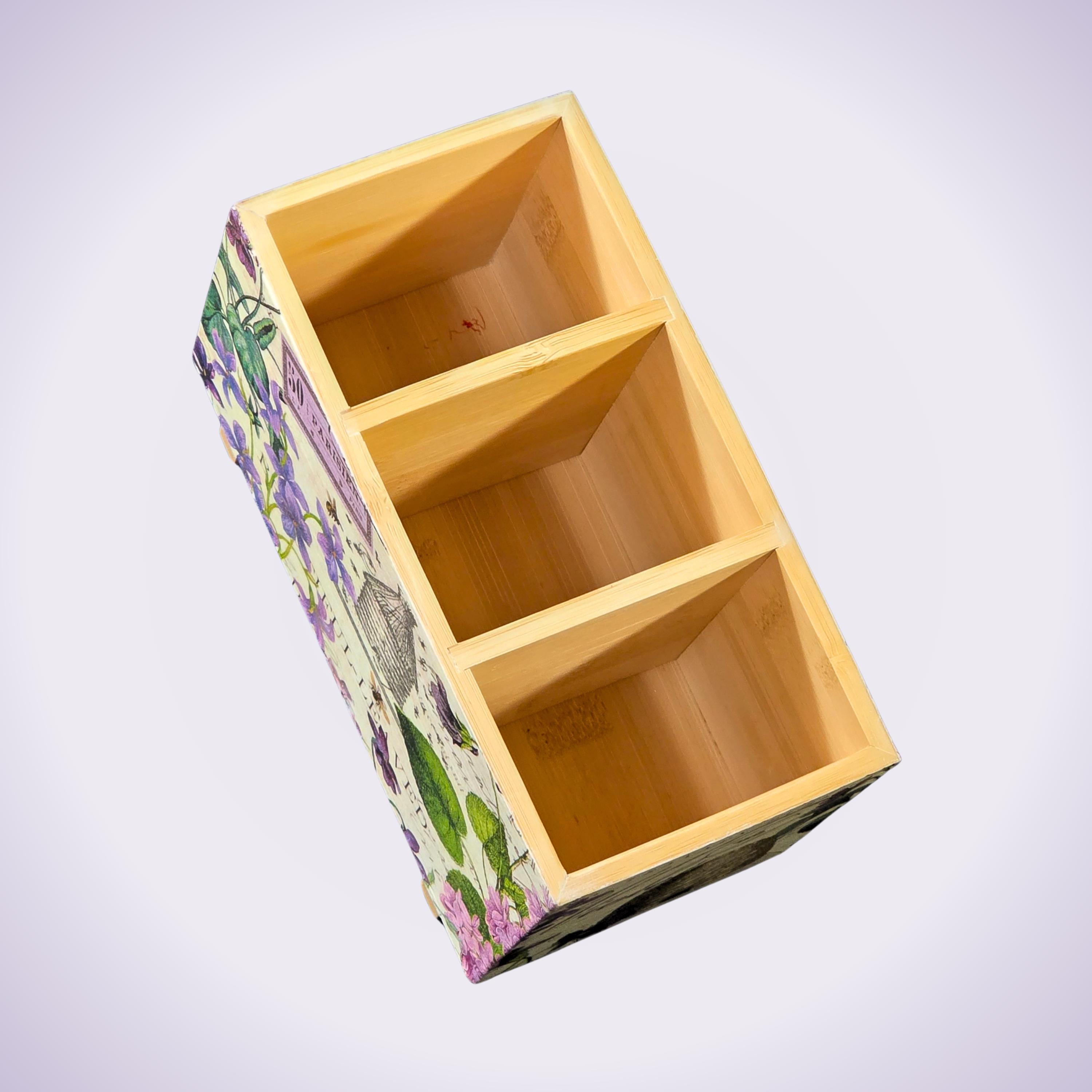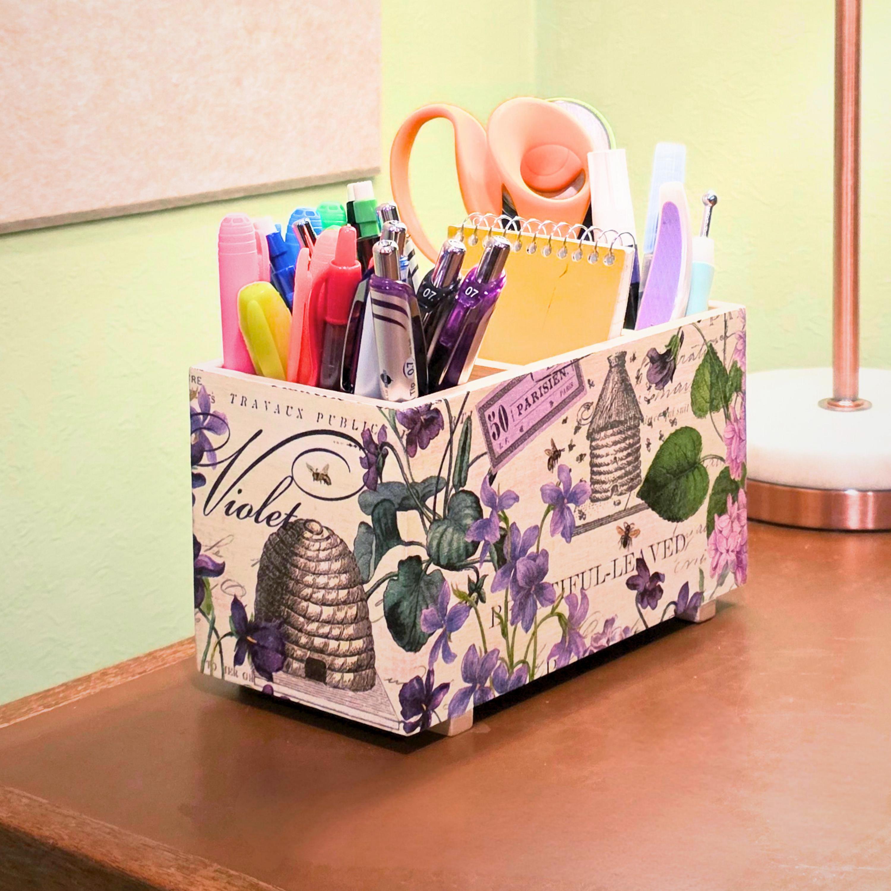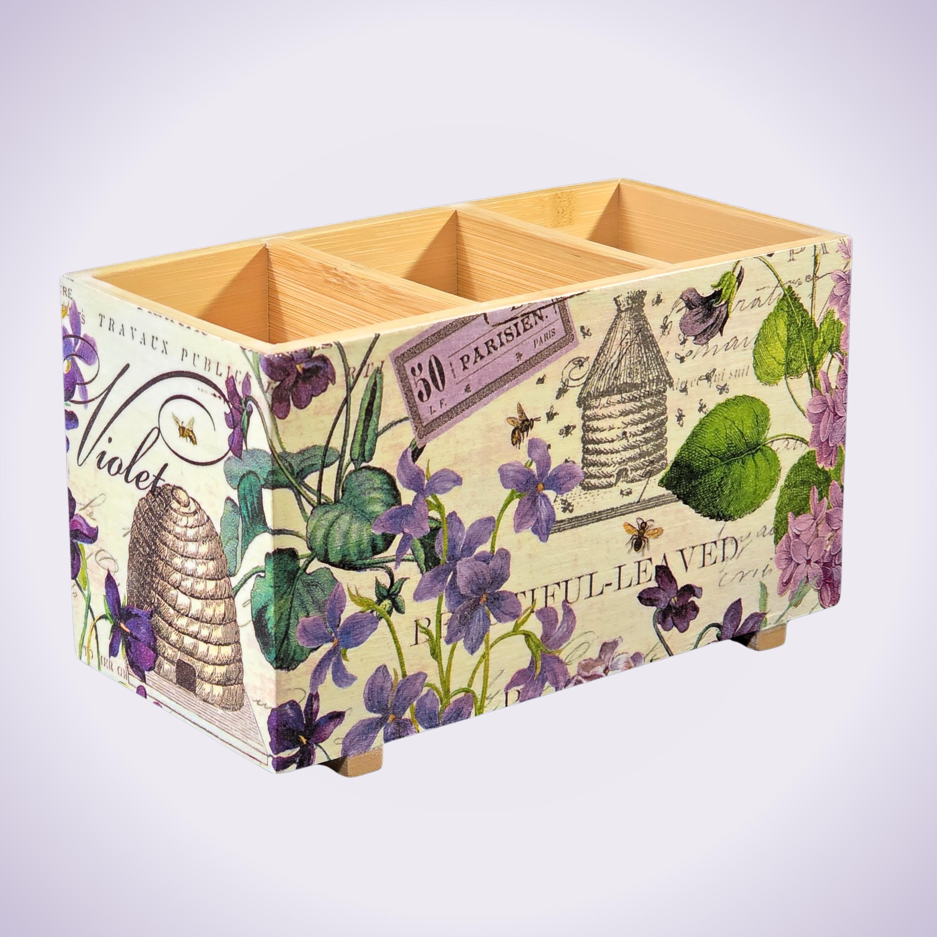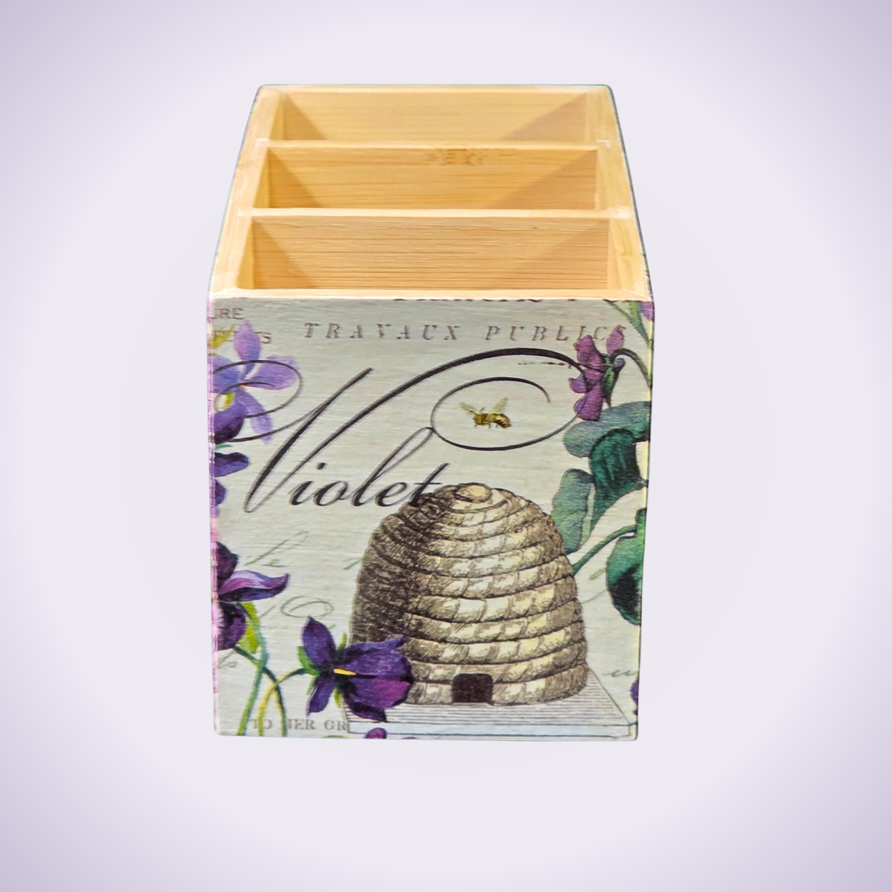 Add a touch of vintage French farmhouse charm to your workspace with this hand-decorated 3-compartment bamboo desk organizer. Featuring rustic bees, classic beehives, soft violets, lilacs, and layered vintage script details, this piece blends functionality with artistic cottage-inspired style.