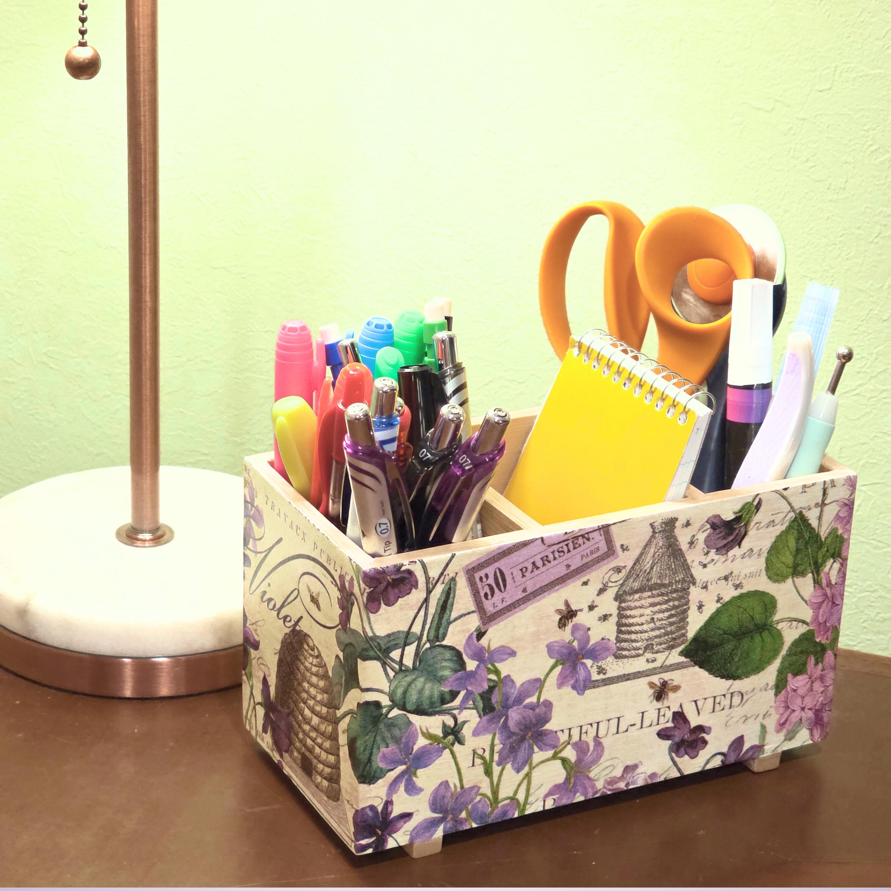 ✨ DETAILS AND FEATURES: • 7 inches long • 3 interior compartments • Upcycled bamboo organizer • Hand-decoupaged and hand-painted • Sealed for protection • Decorative yet functional office storage