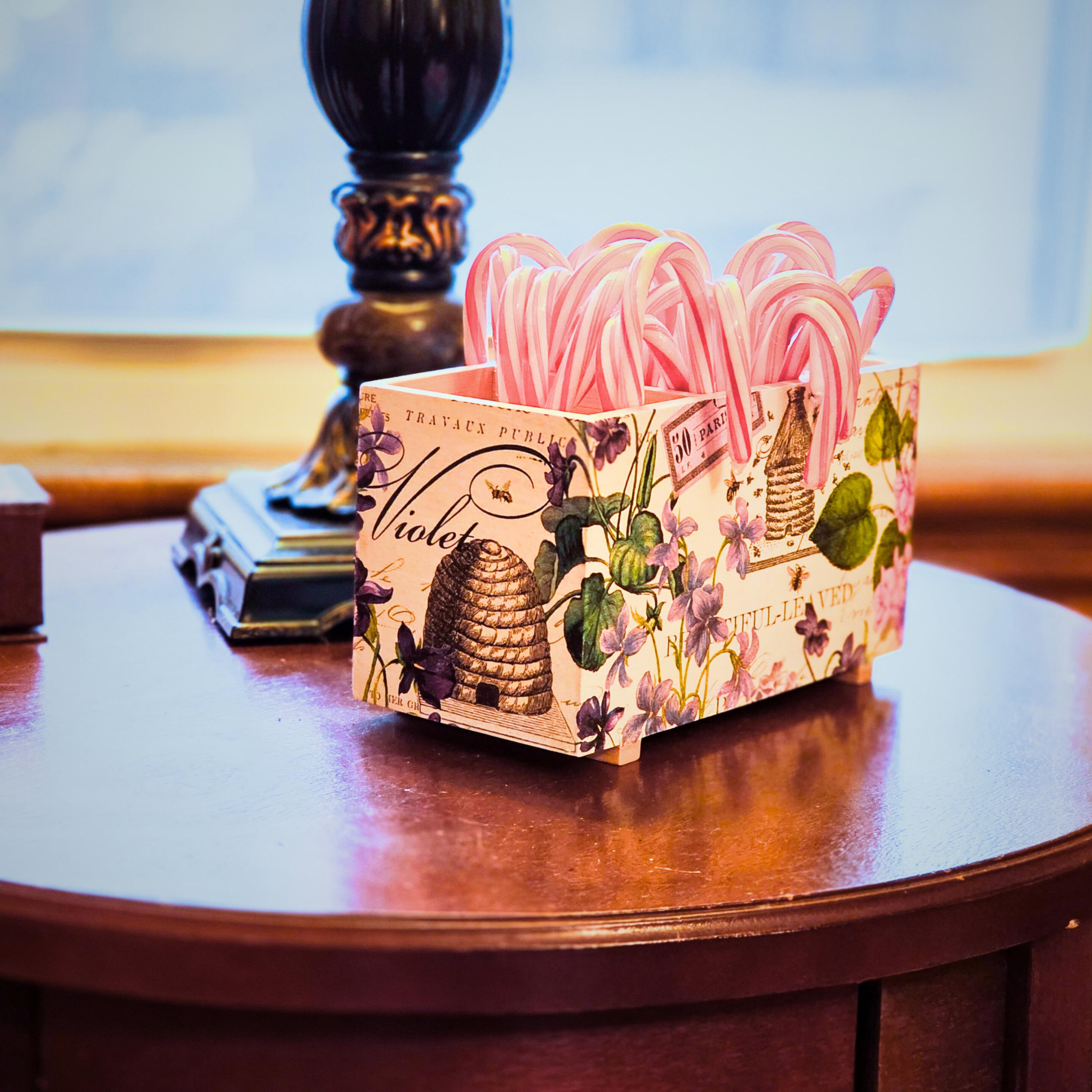 The exterior is carefully hand-decoupaged using designer paper napkins showcasing bees, hives, florals, and antique typography layered over a softly aged background. Each piece is then hand-painted and sealed with a clear water-based polyurethane for durability and lasting beauty.