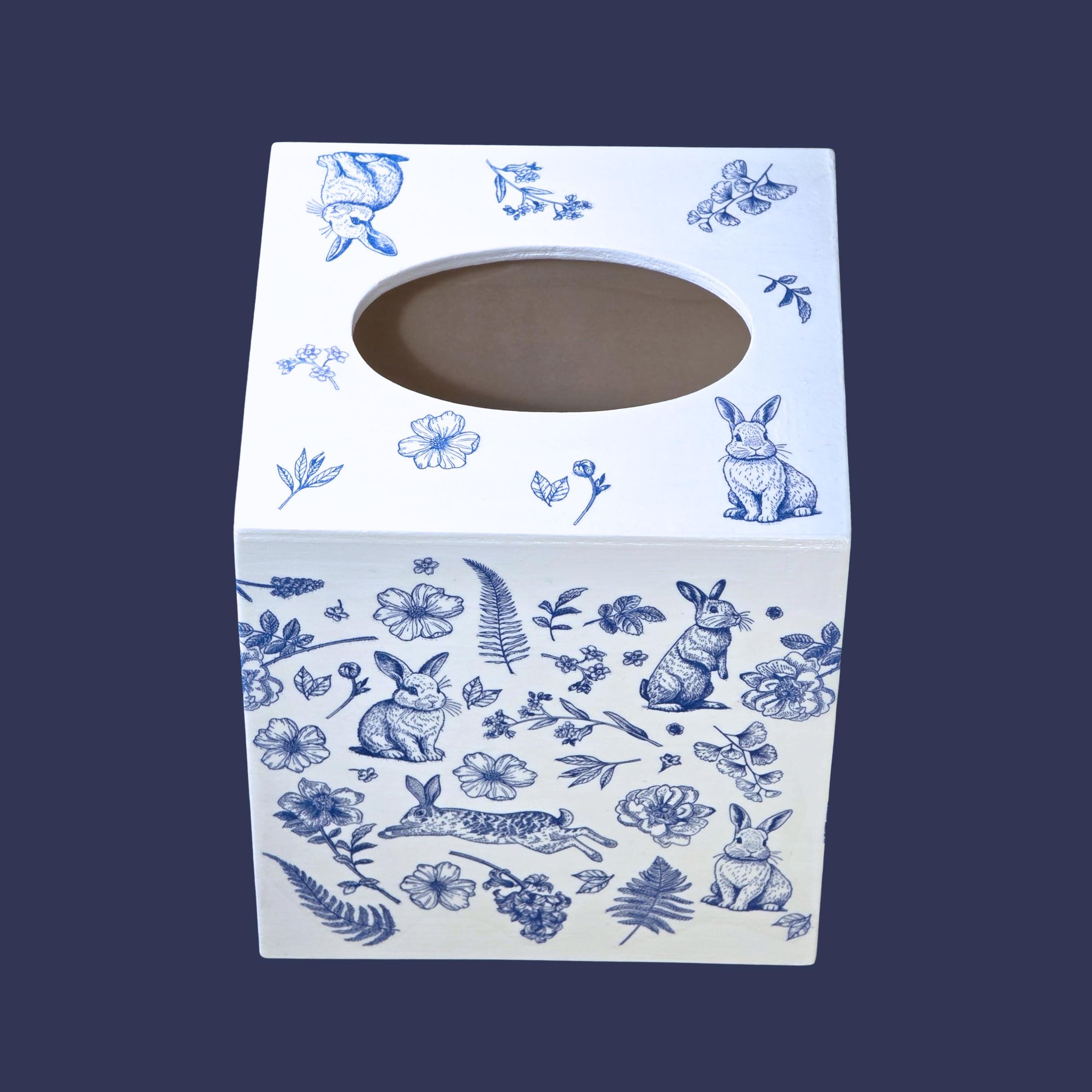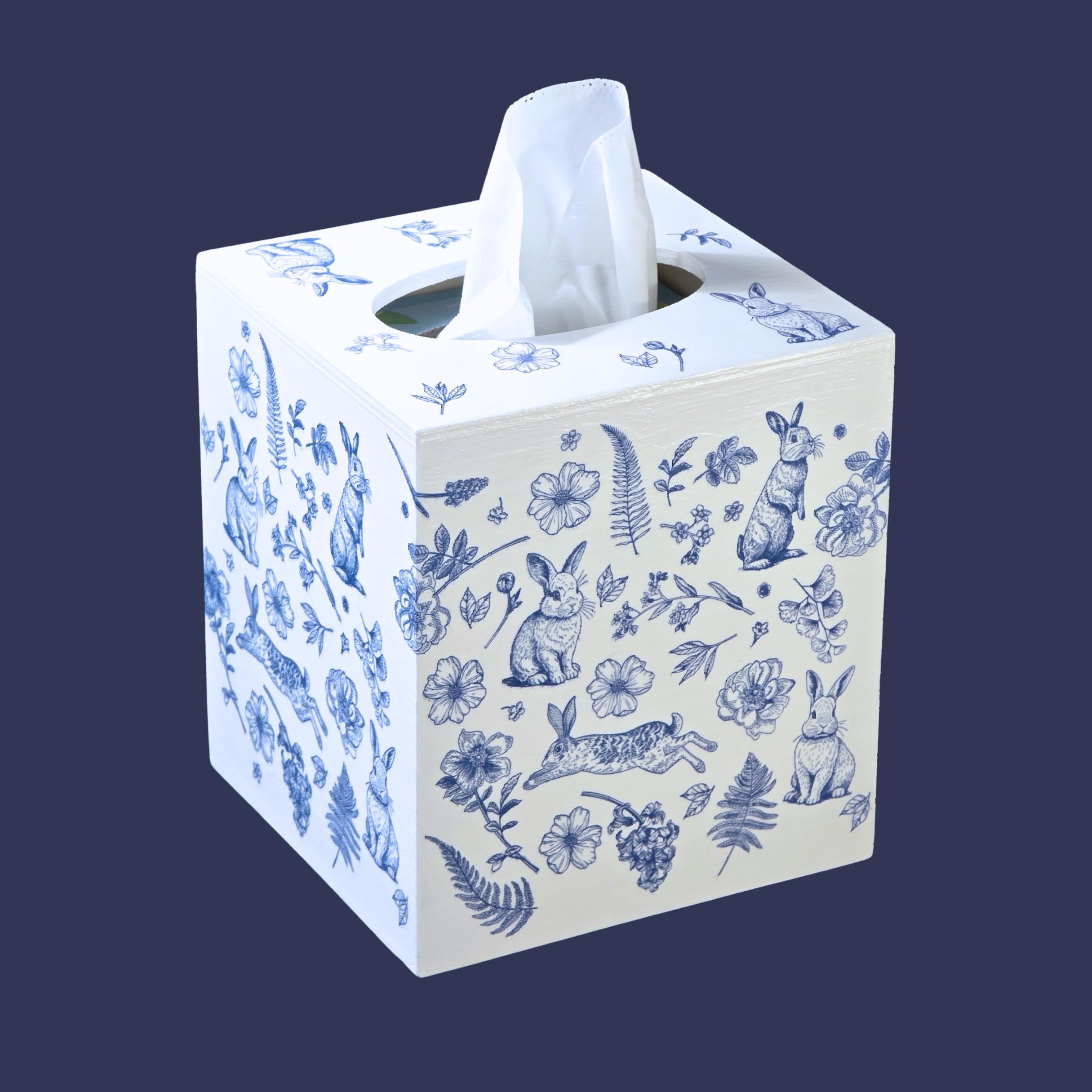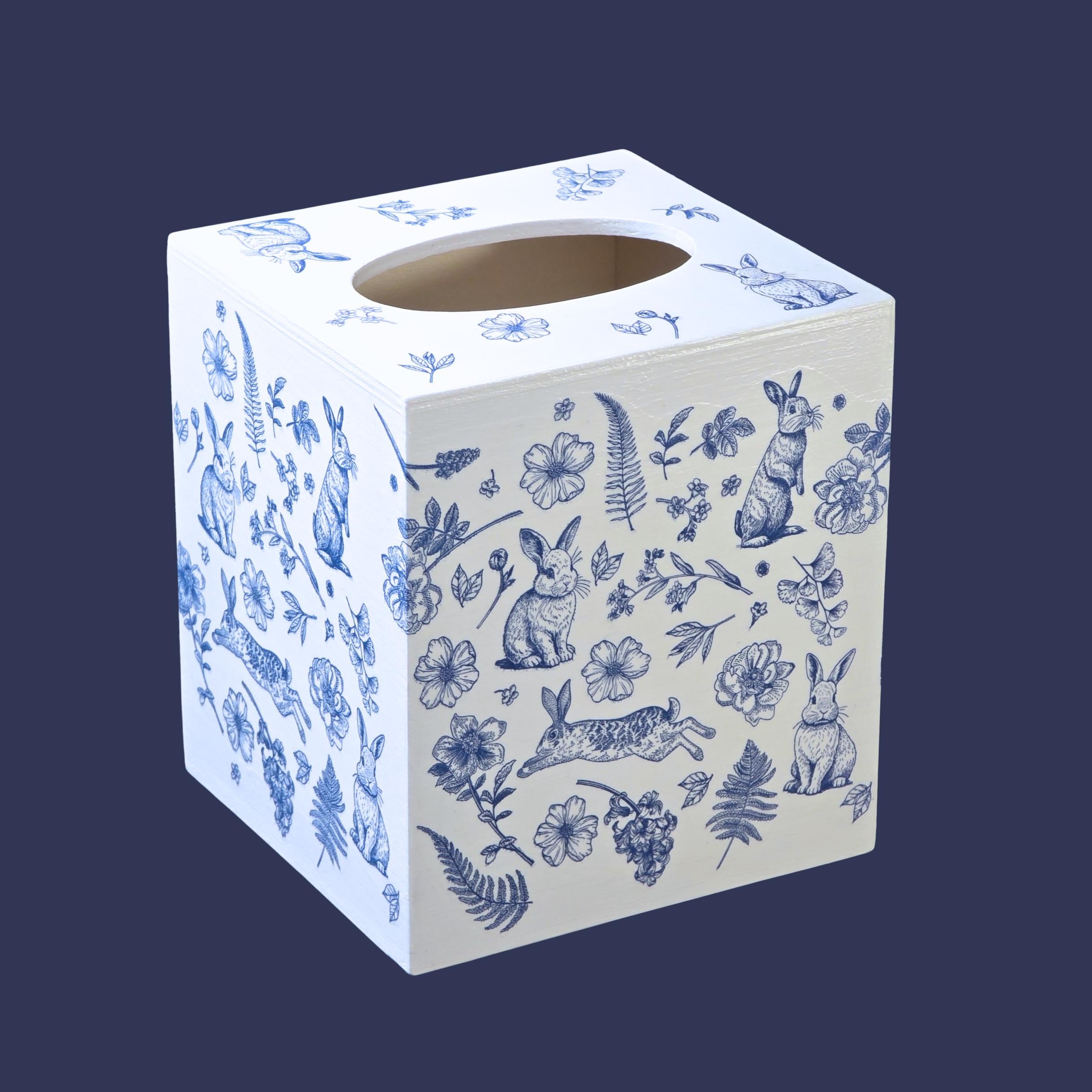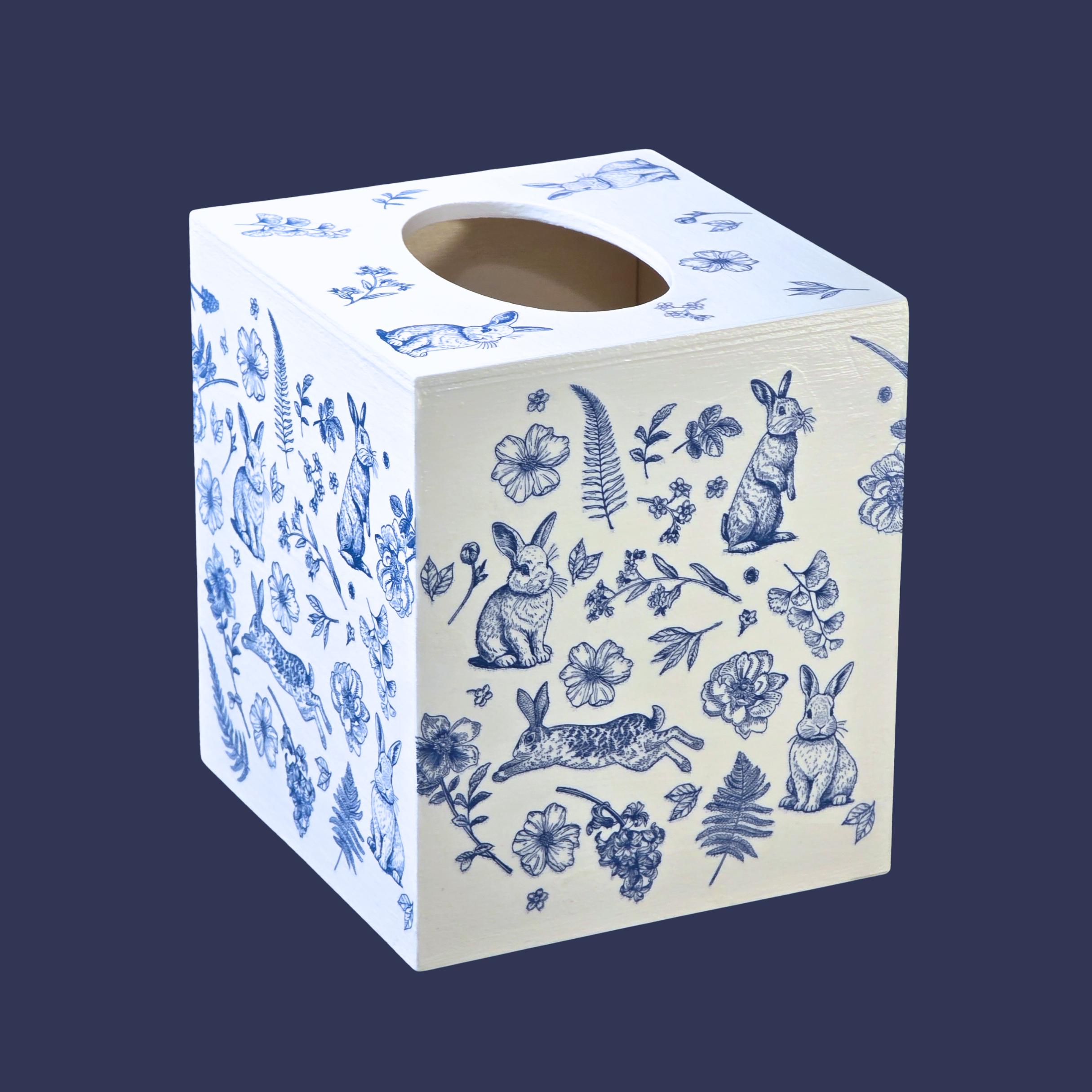 Add timeless cottage elegance to everyday essentials with this hand-decorated Bunny Blossom Toile tissue box cover. Featuring delicate blue toile-style florals and charming woodland rabbits, this piece transforms a simple tissue box into a refined decorative accent.