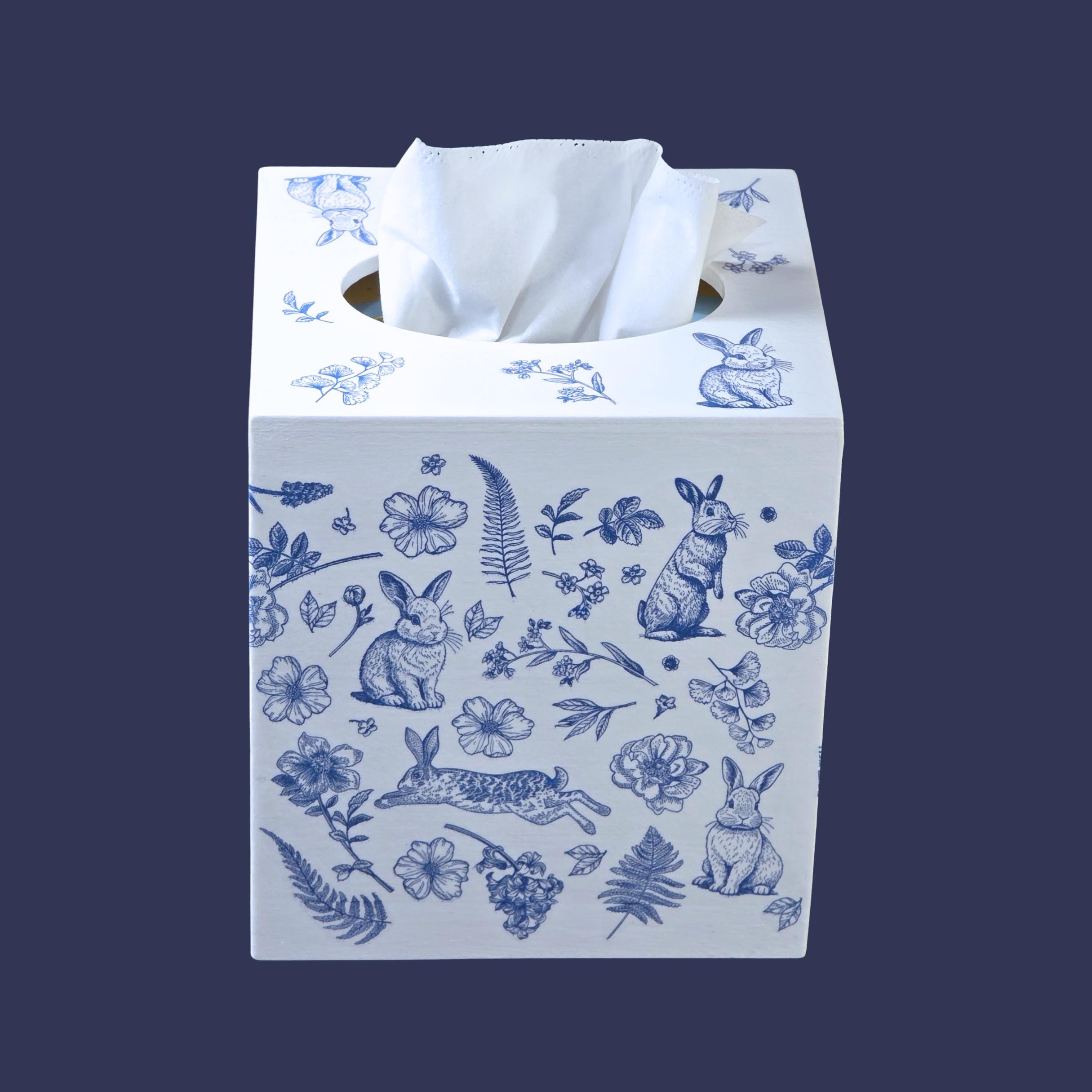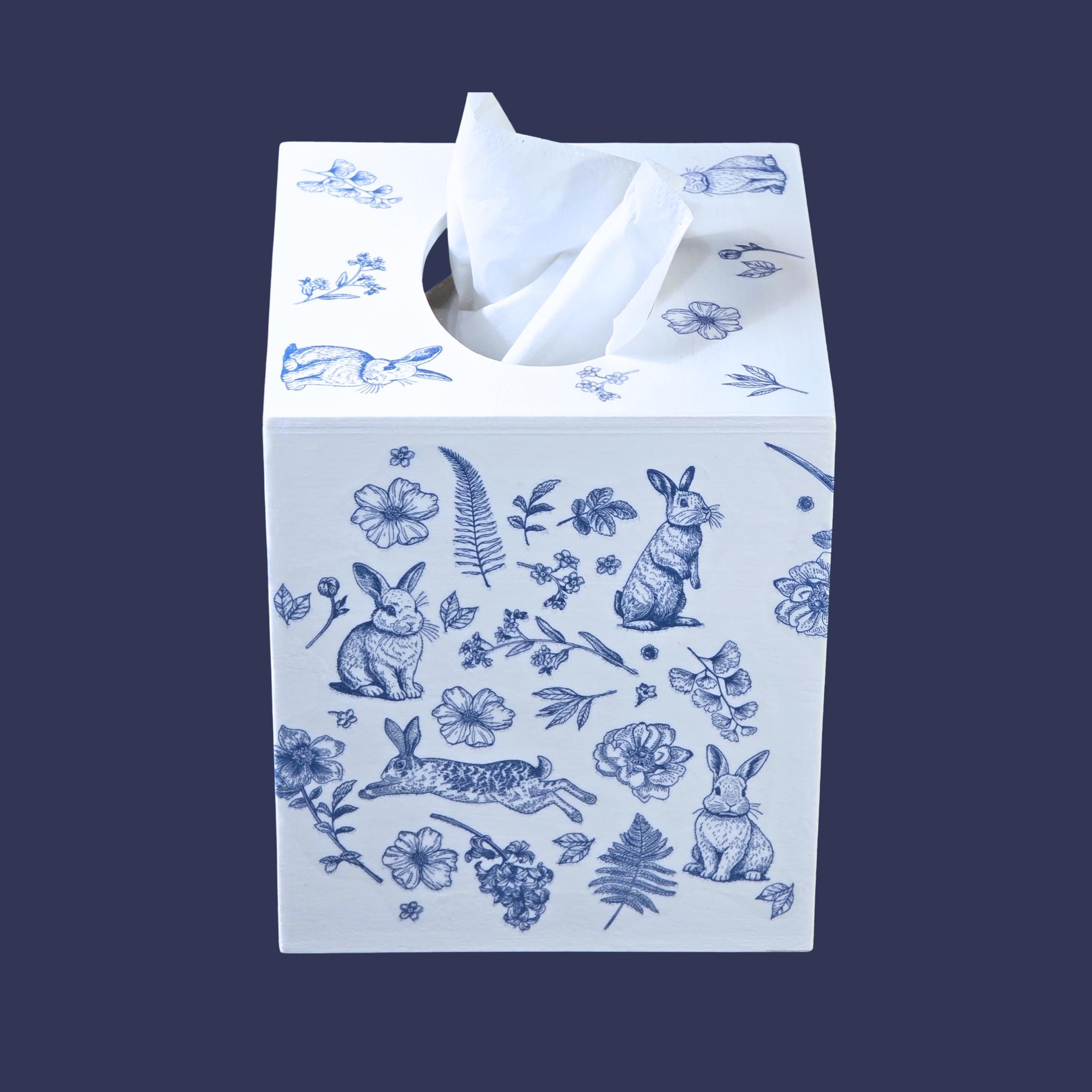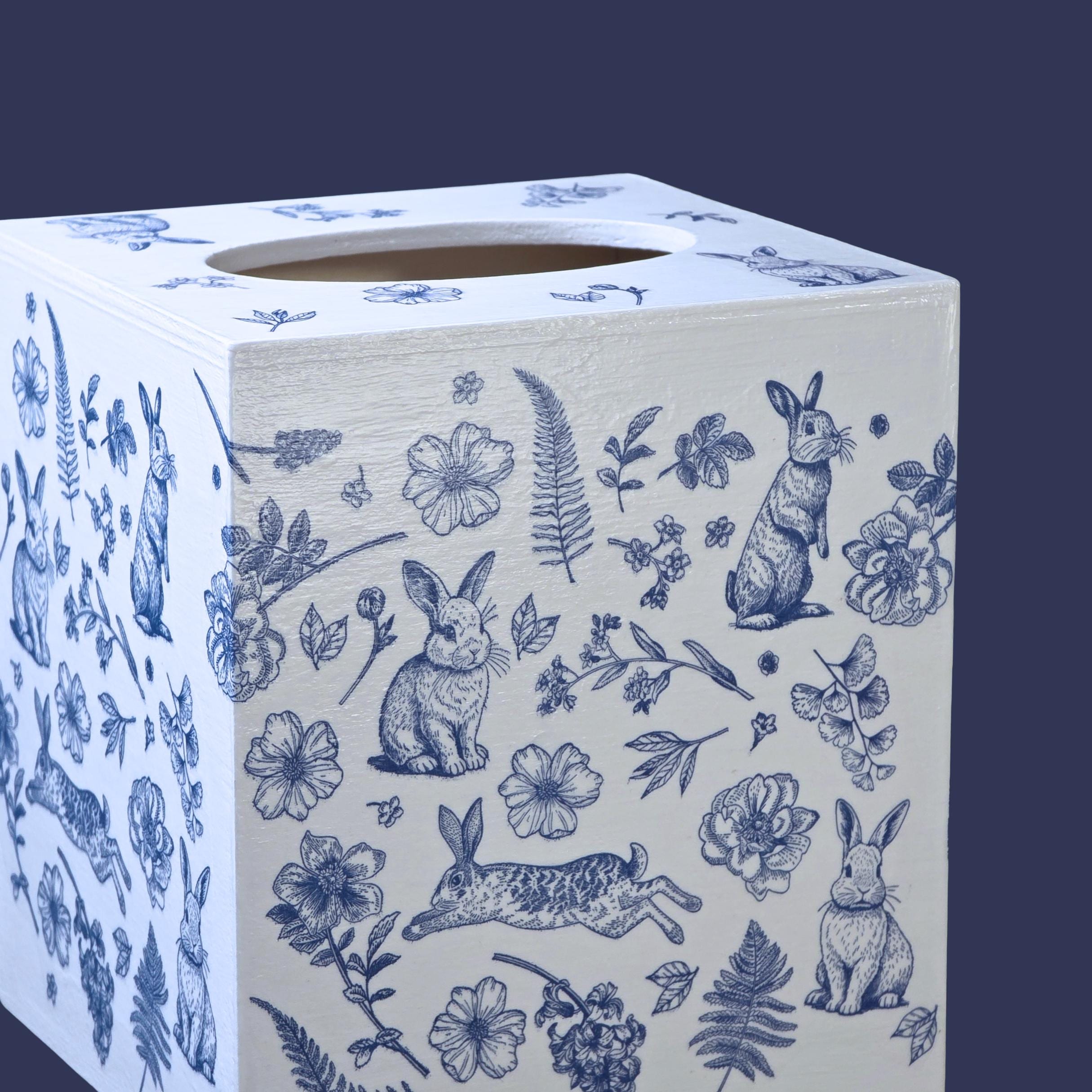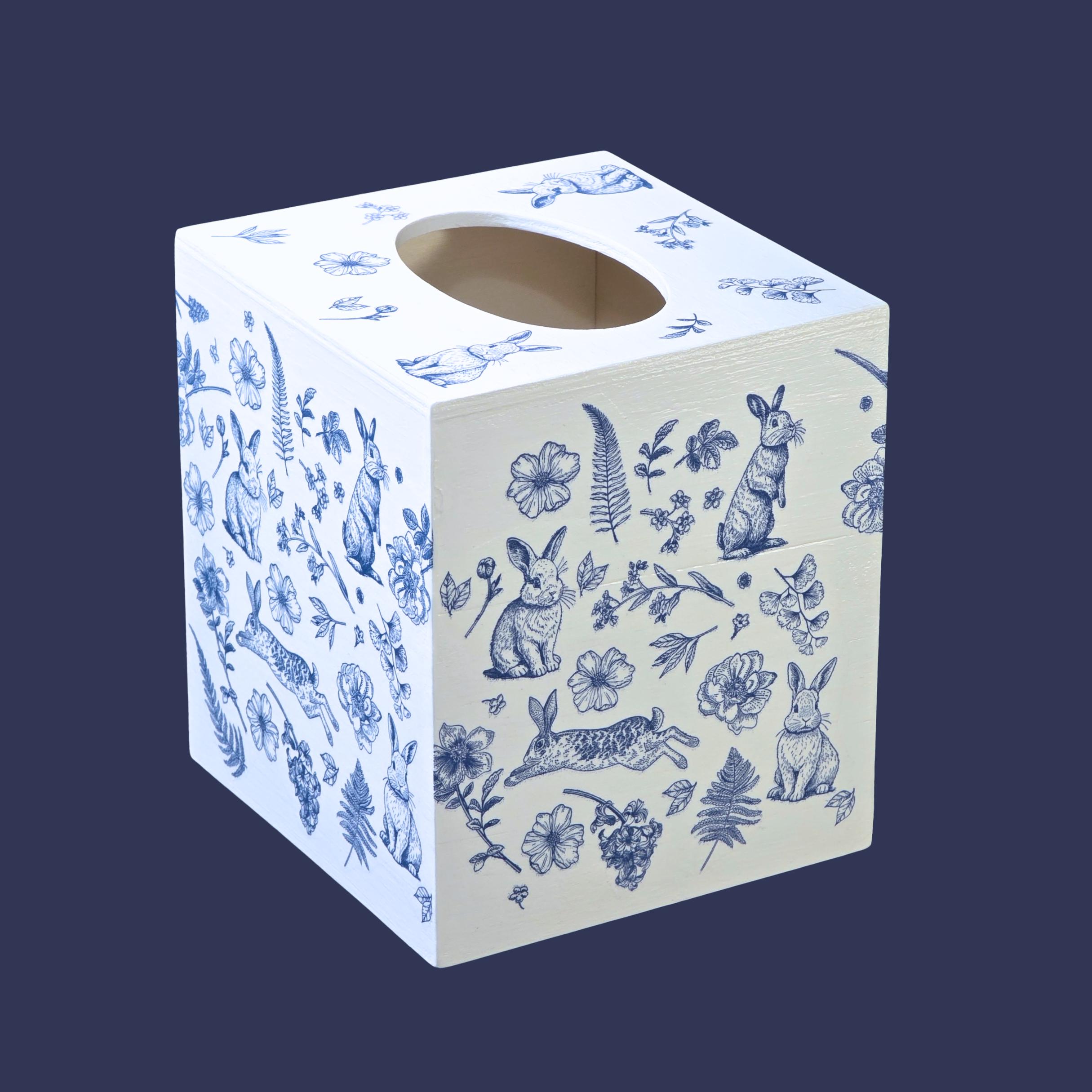 Add timeless cottage elegance to everyday essentials with this hand-decorated Bunny Blossom Toile tissue box cover. Featuring delicate blue toile-style florals and charming woodland rabbits, this piece transforms a simple tissue box into a refined decorative accent.