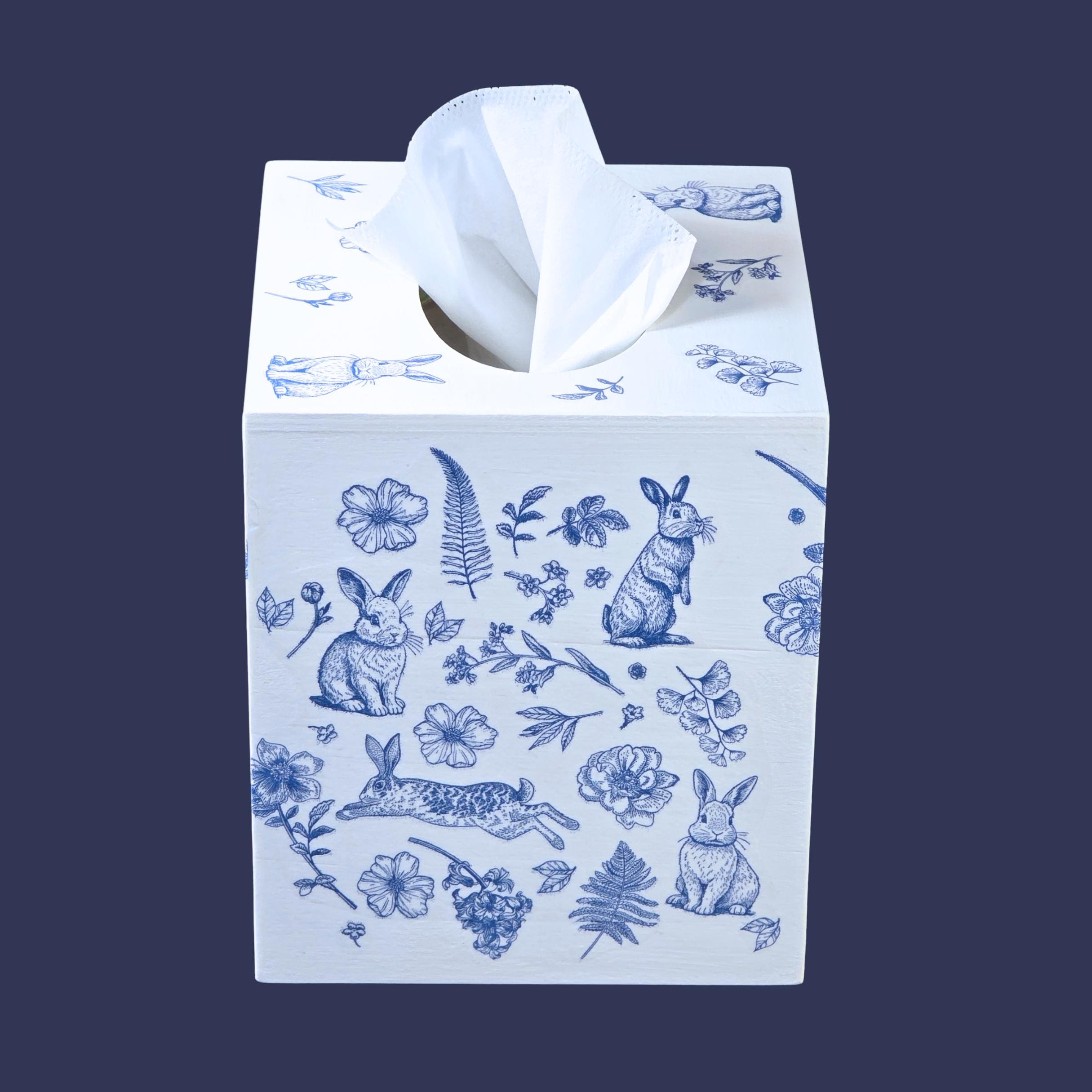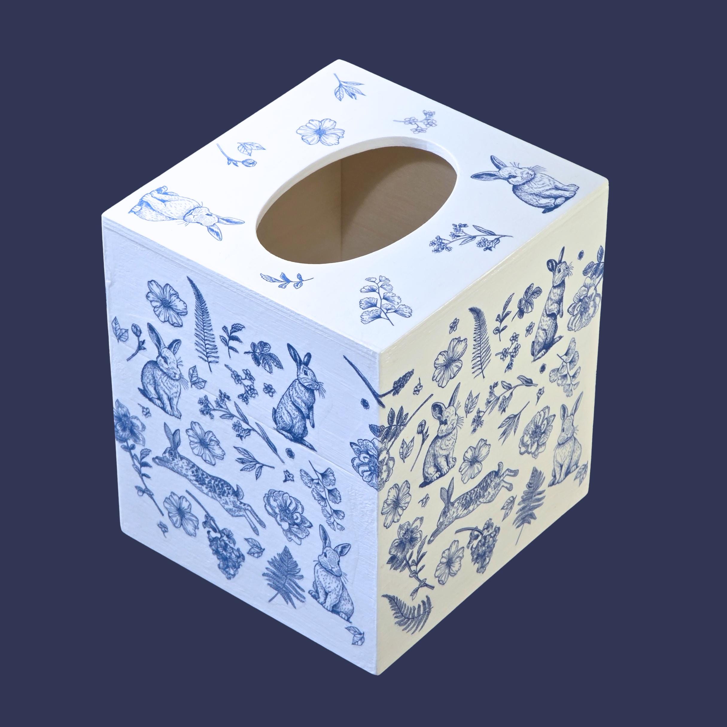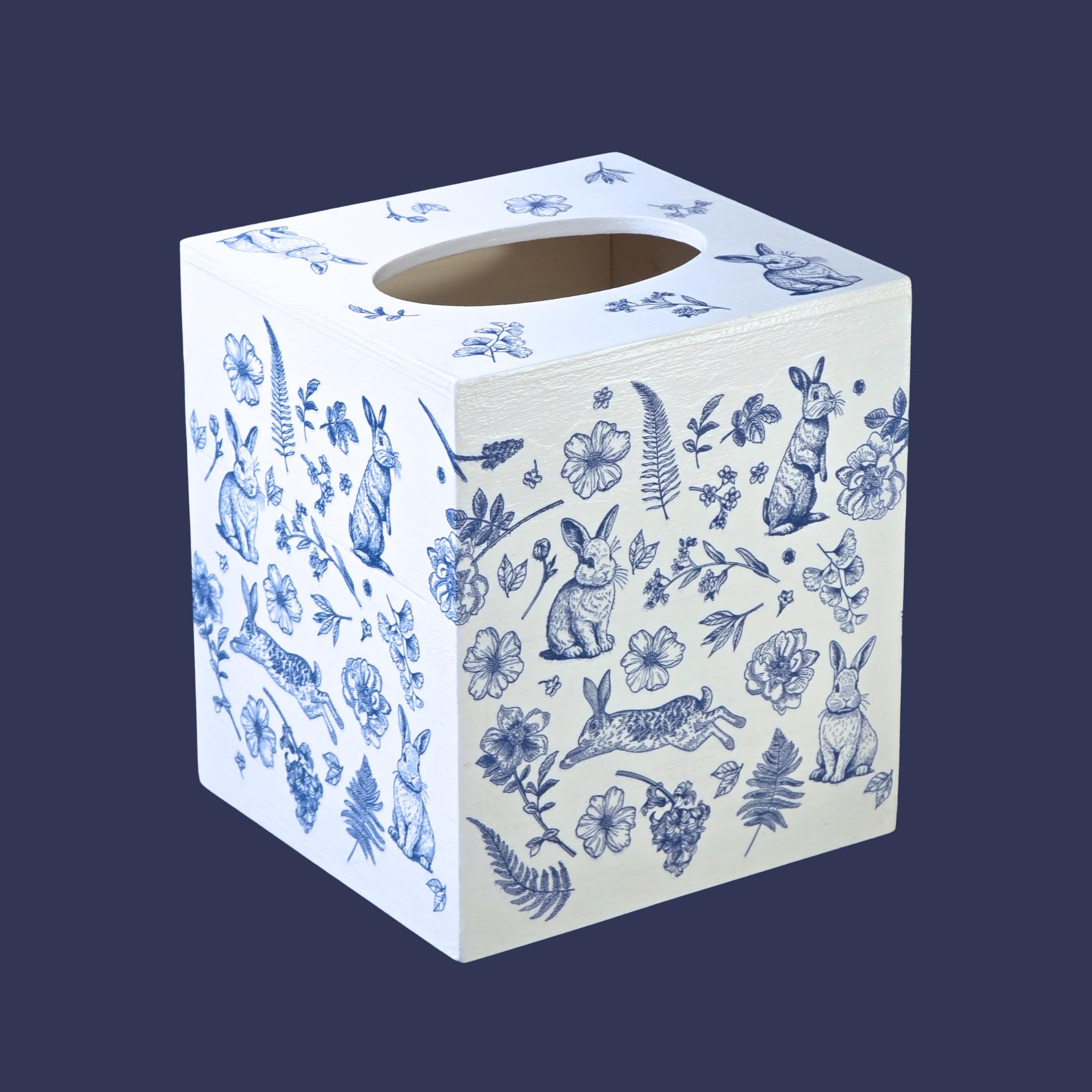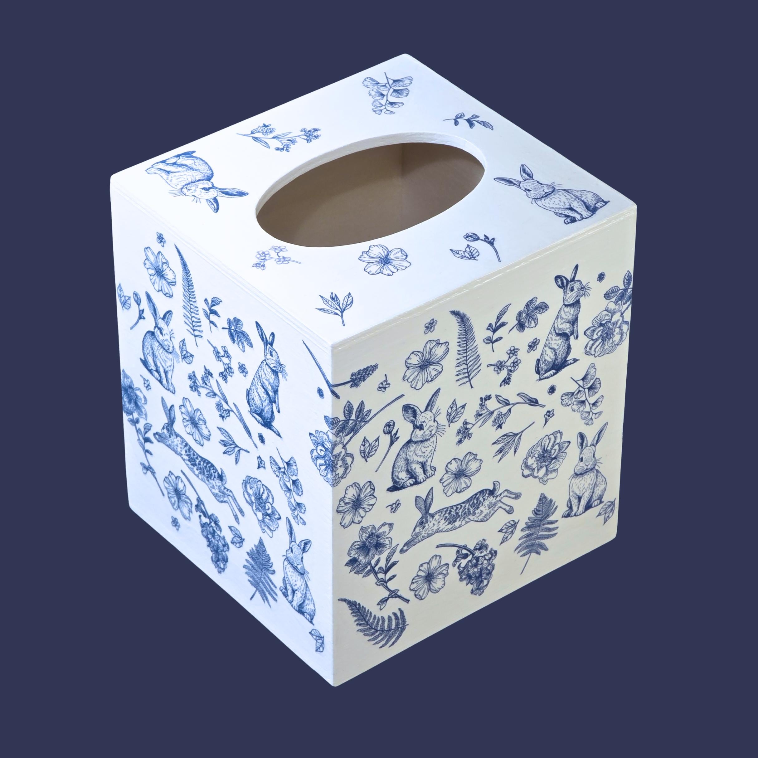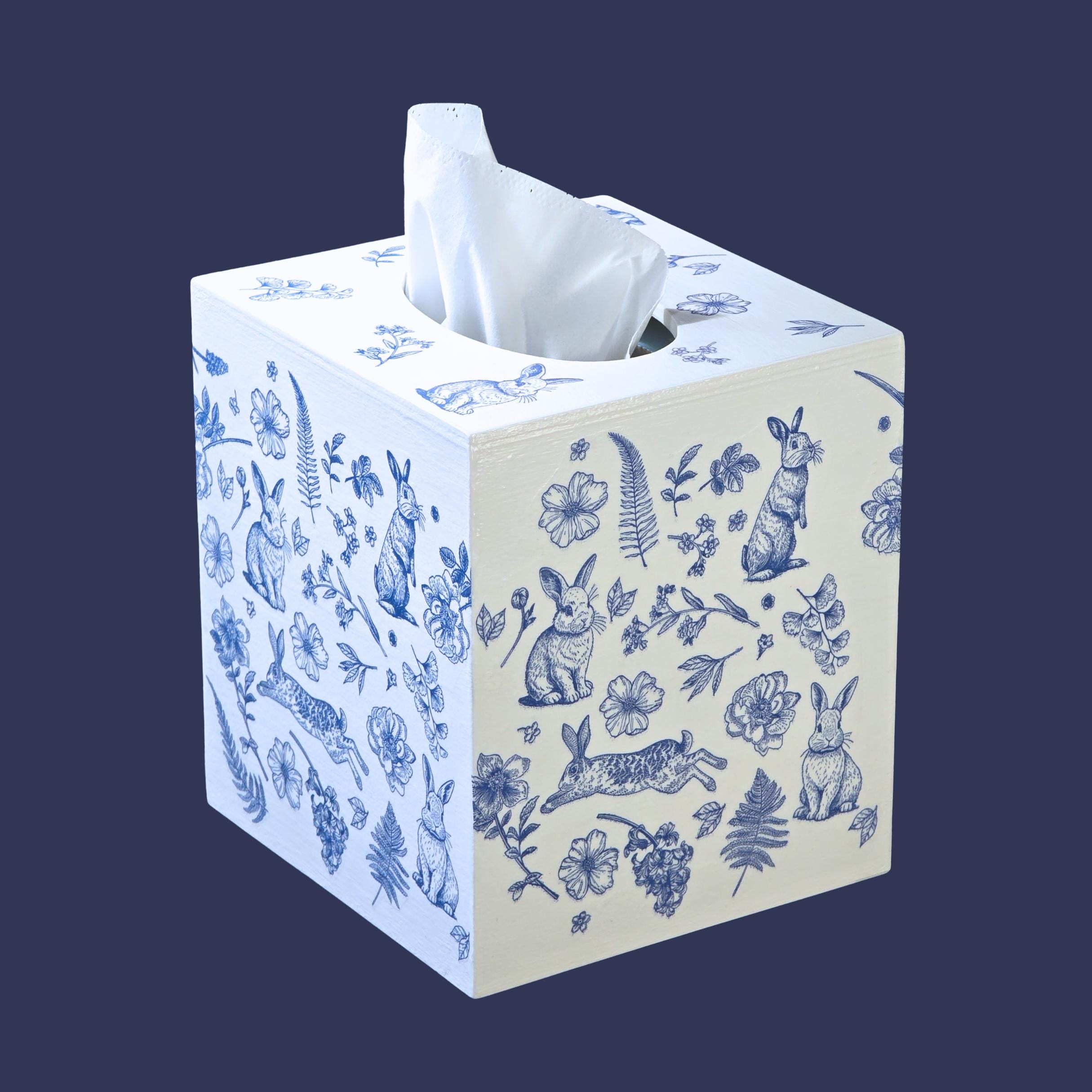 Add timeless cottage elegance to everyday essentials with this hand-decorated Bunny Blossom Toile tissue box cover. Featuring delicate blue toile-style florals and charming woodland rabbits, this piece transforms a simple tissue box into a refined decorative accent.