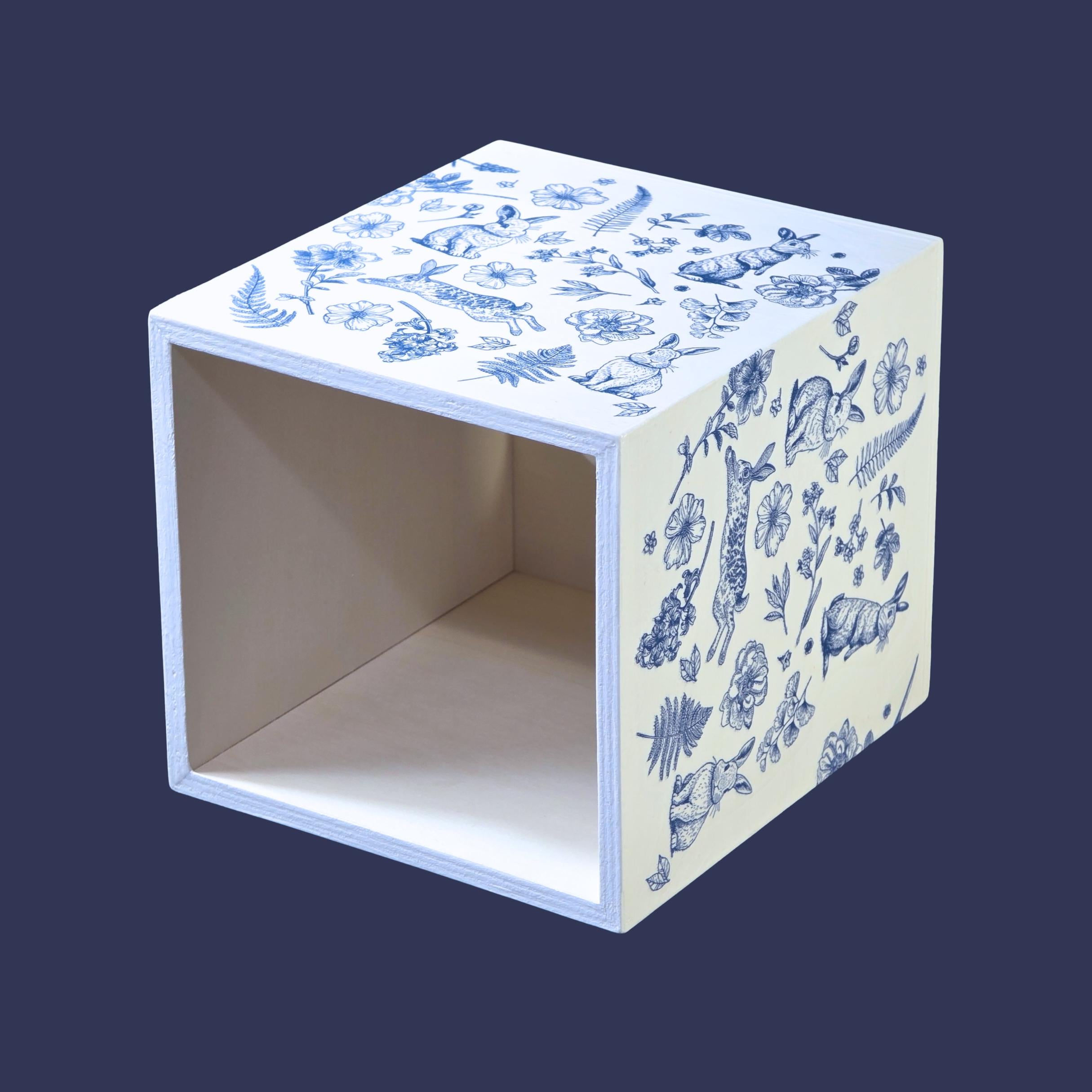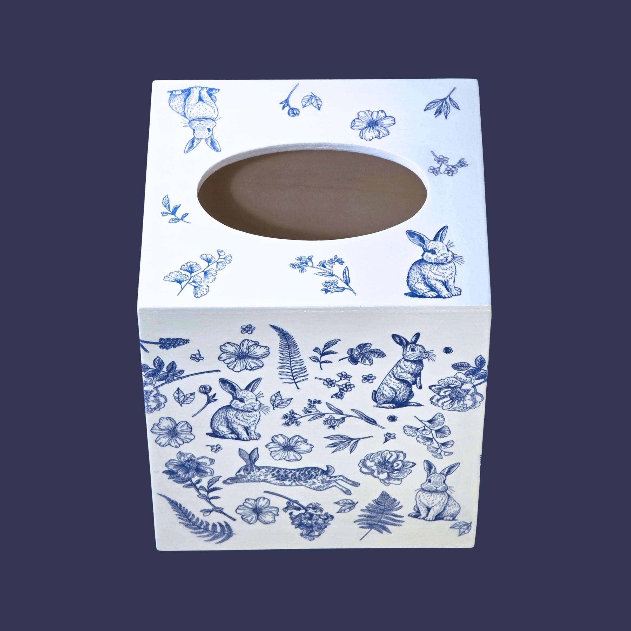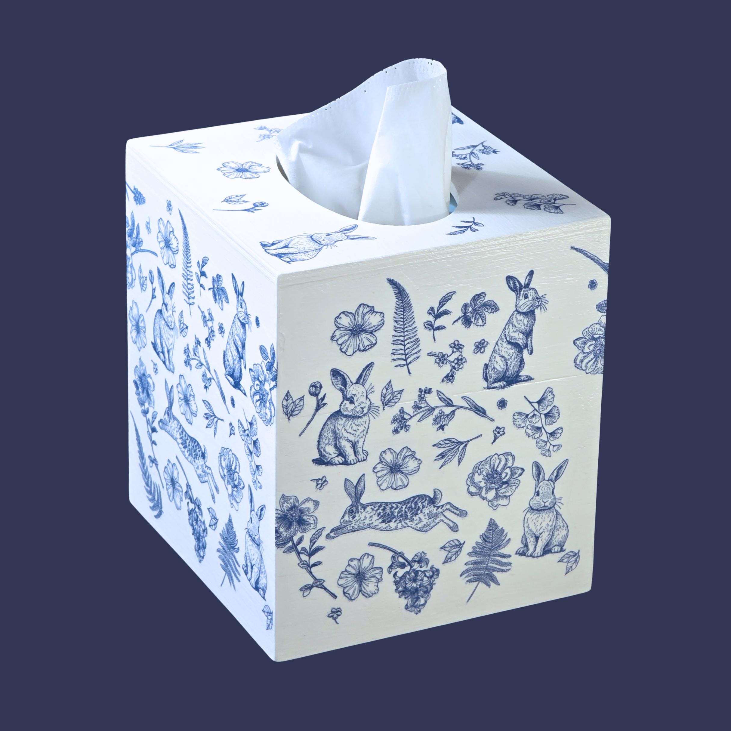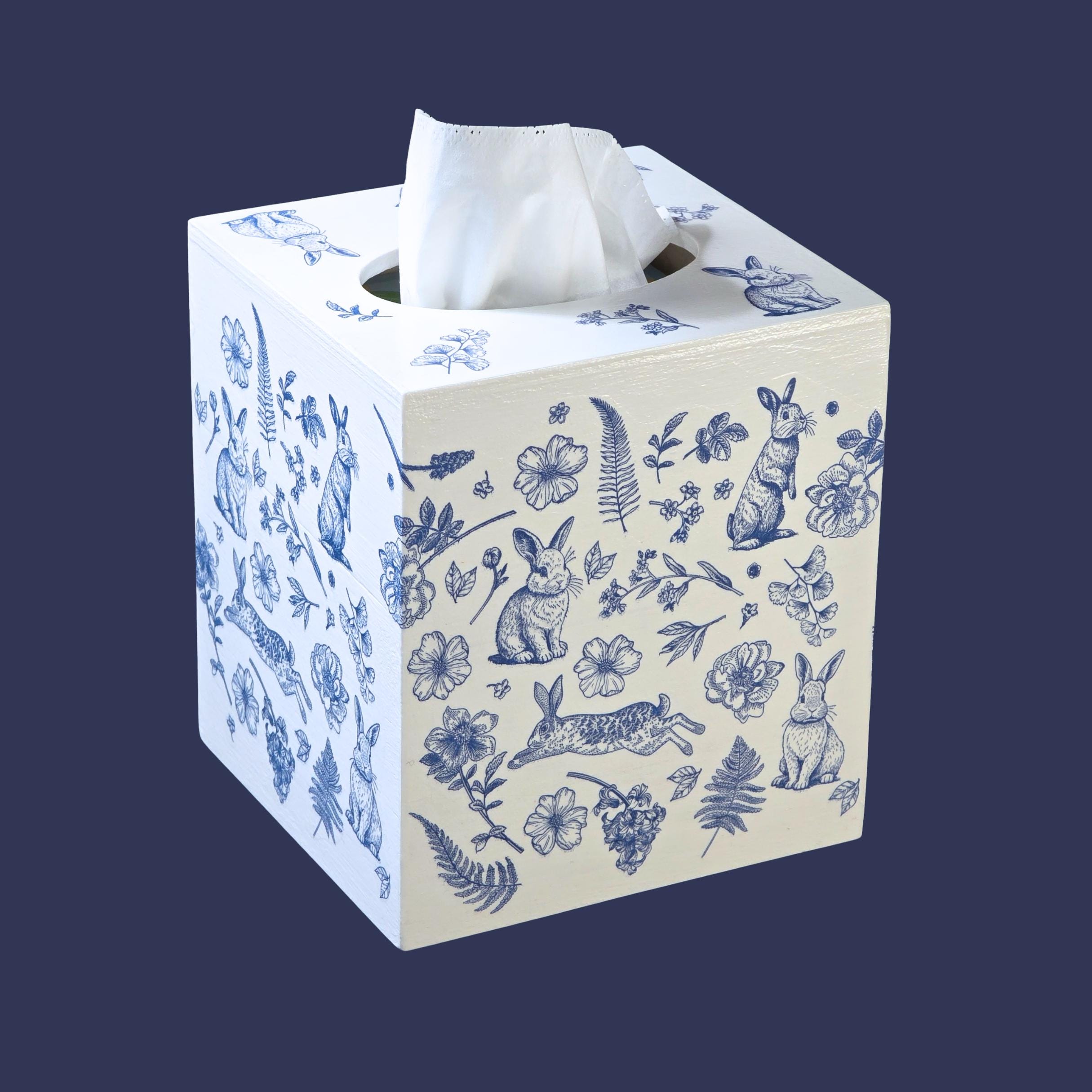 Add timeless cottage elegance to everyday essentials with this hand-decorated Bunny Blossom Toile tissue box cover. Featuring delicate blue toile-style florals and charming woodland rabbits, this piece transforms a simple tissue box into a refined decorative accent.