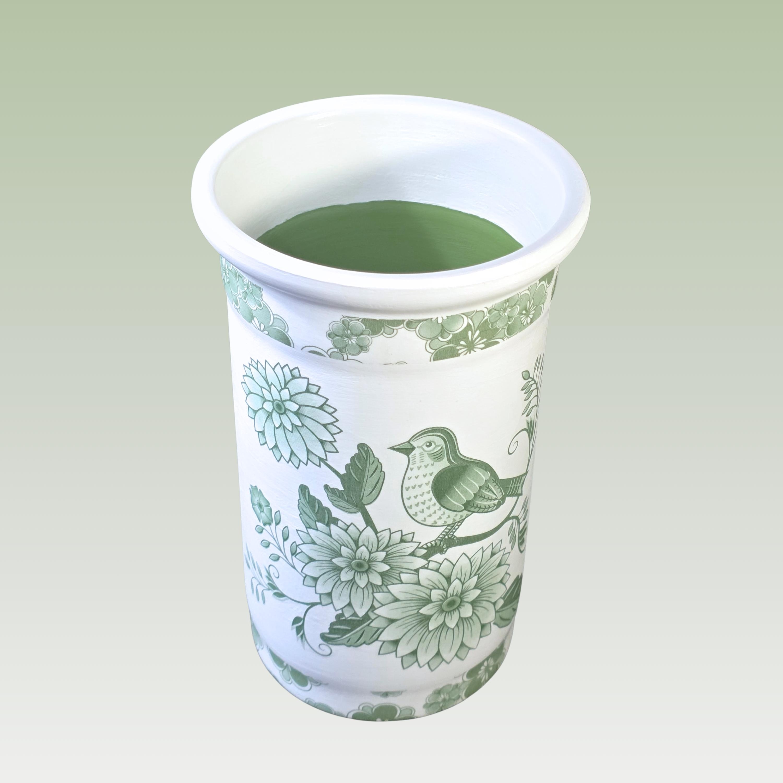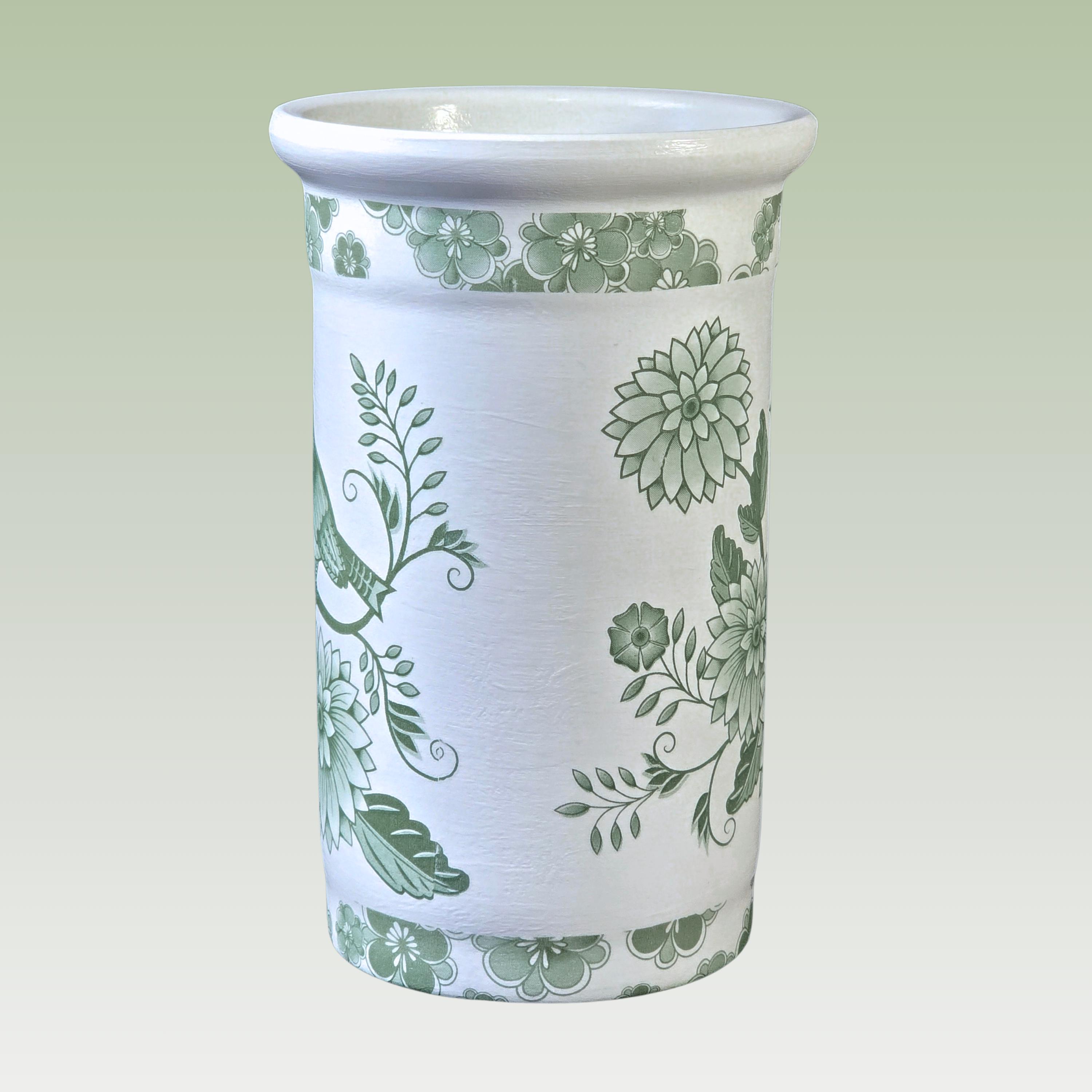 Each upcycled clay vase is hand-painted white and carefully hand-decoupaged using designer paper napkins featuring traditional green-and-white chinoiserie motifs, including florals and birds inspired by classic patterns. The surface is then sealed for durability, resulting in a crisp, collected look that pairs beautifully with traditional, cottage, coastal-classic, and grandmillennial interiors.