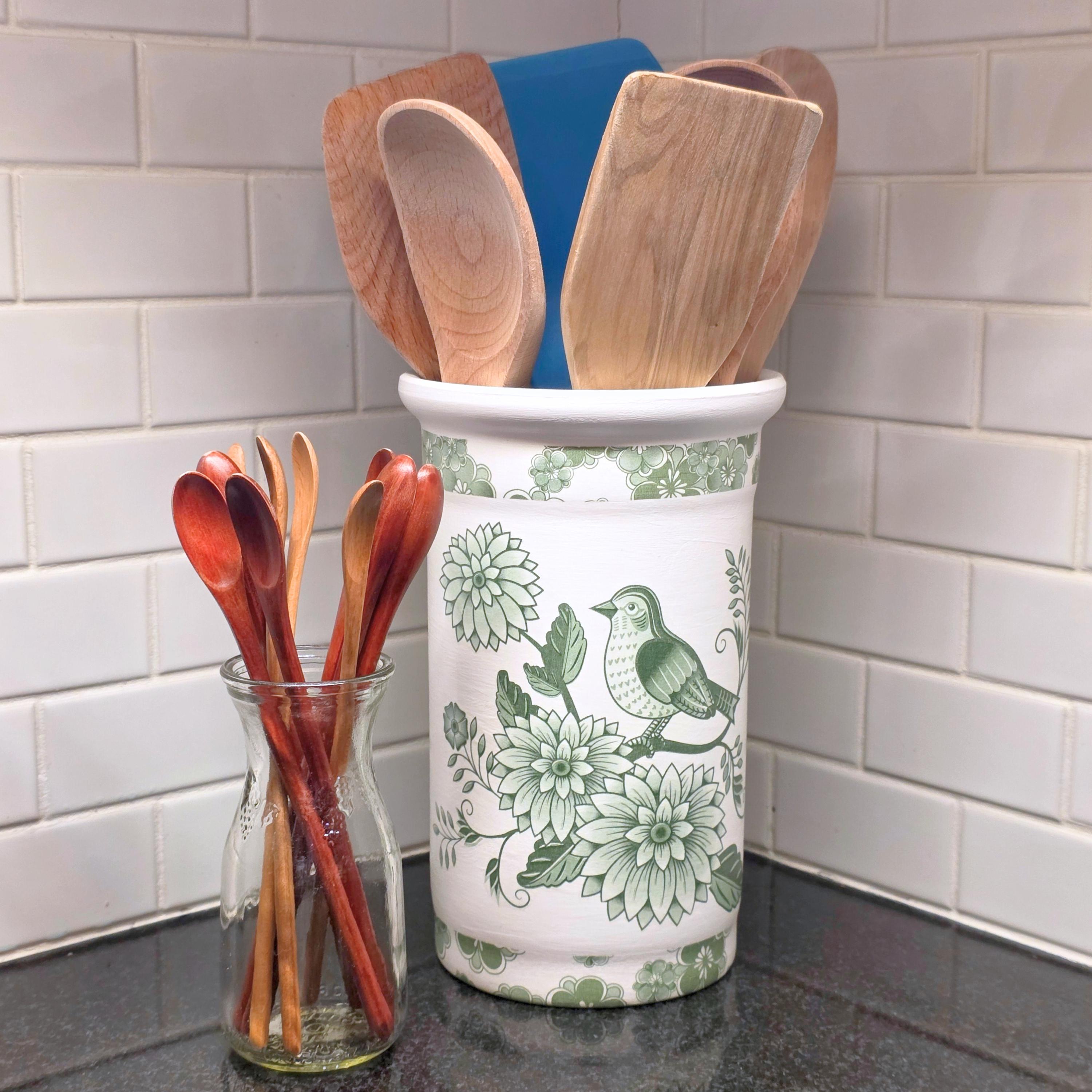 DETAILS: • Approx. 8.75 inches tall • Upcycled ceramic vase • Hand-decoupaged, hand-painted, and sealed • Suitable as a decorative vase or utensil holder • Designed for indoor use