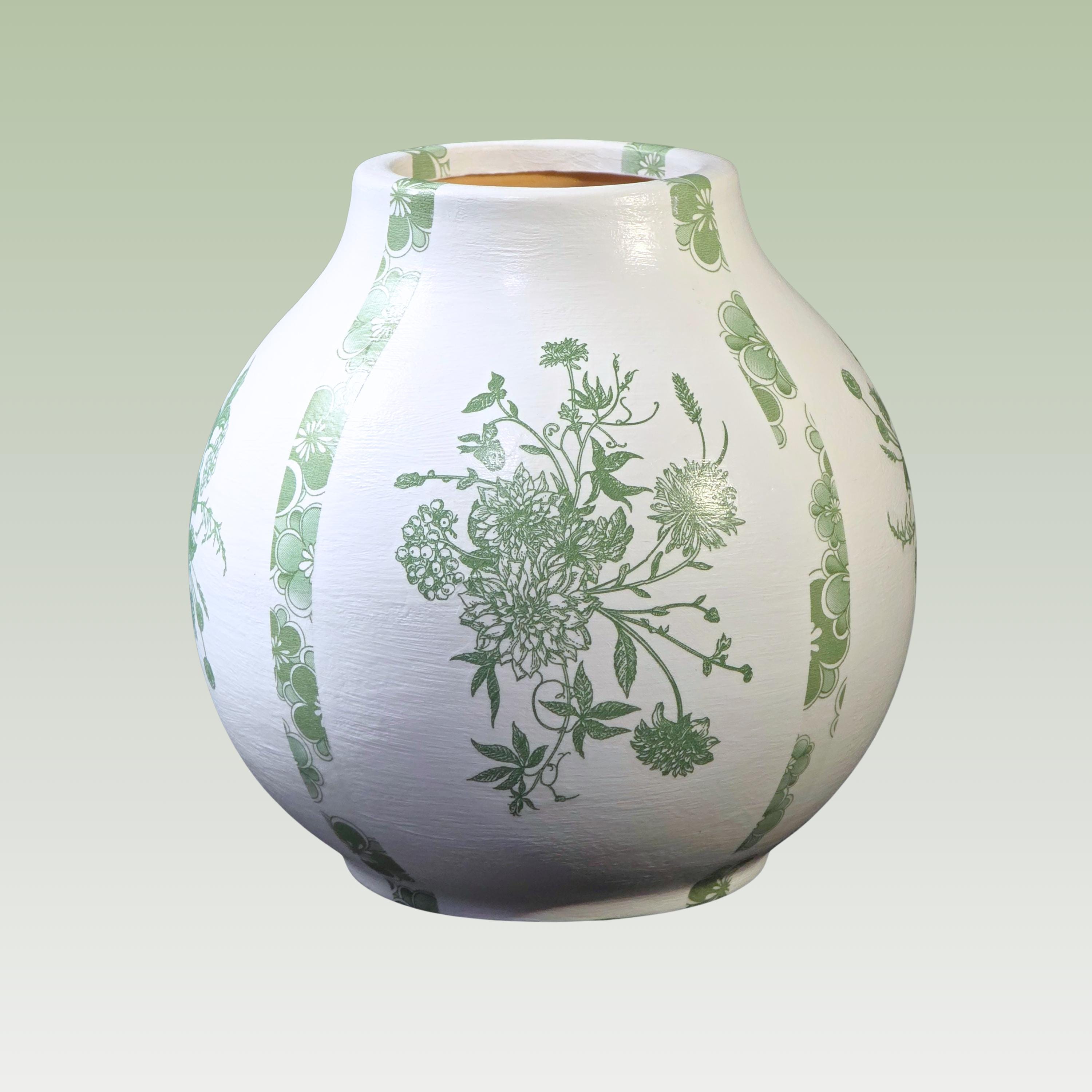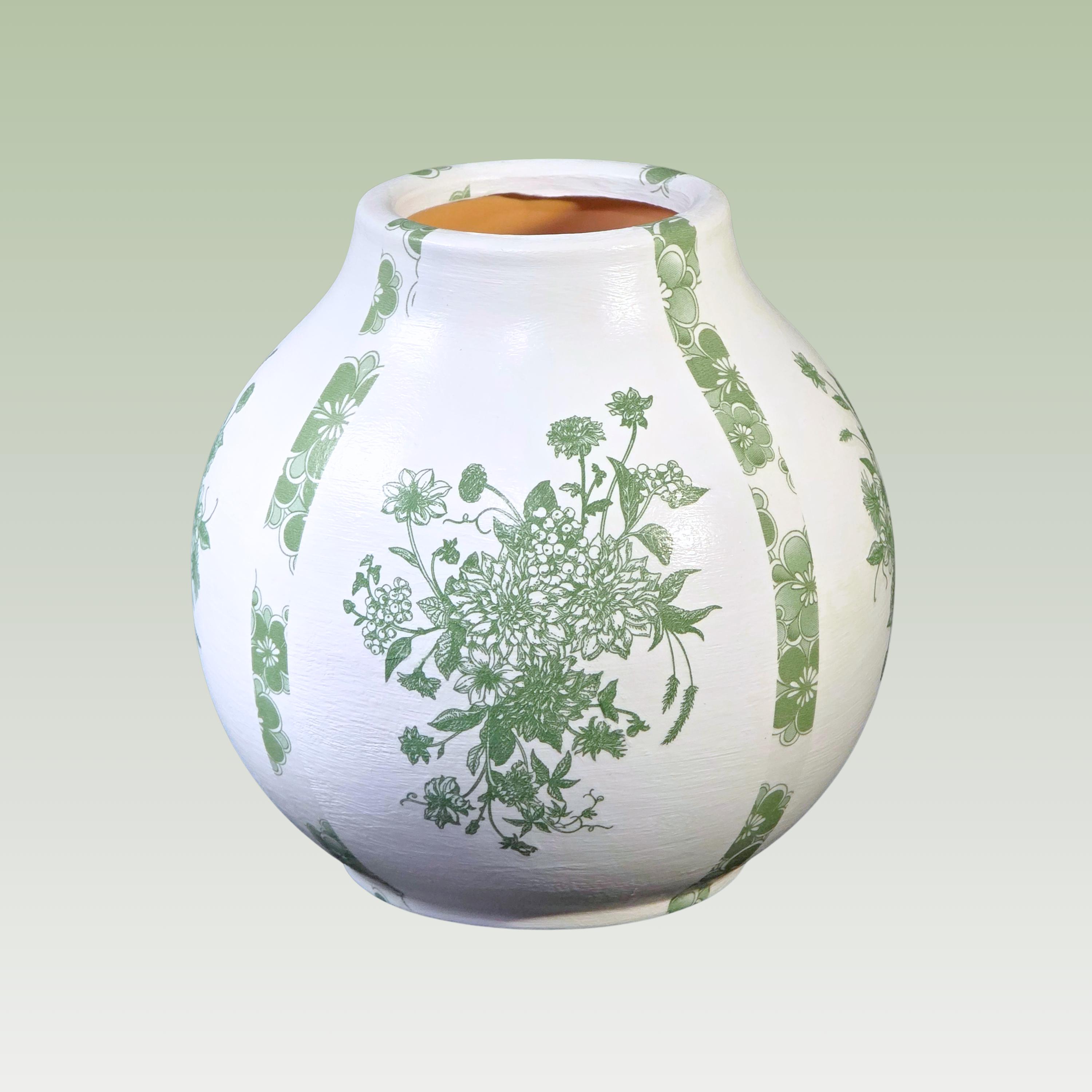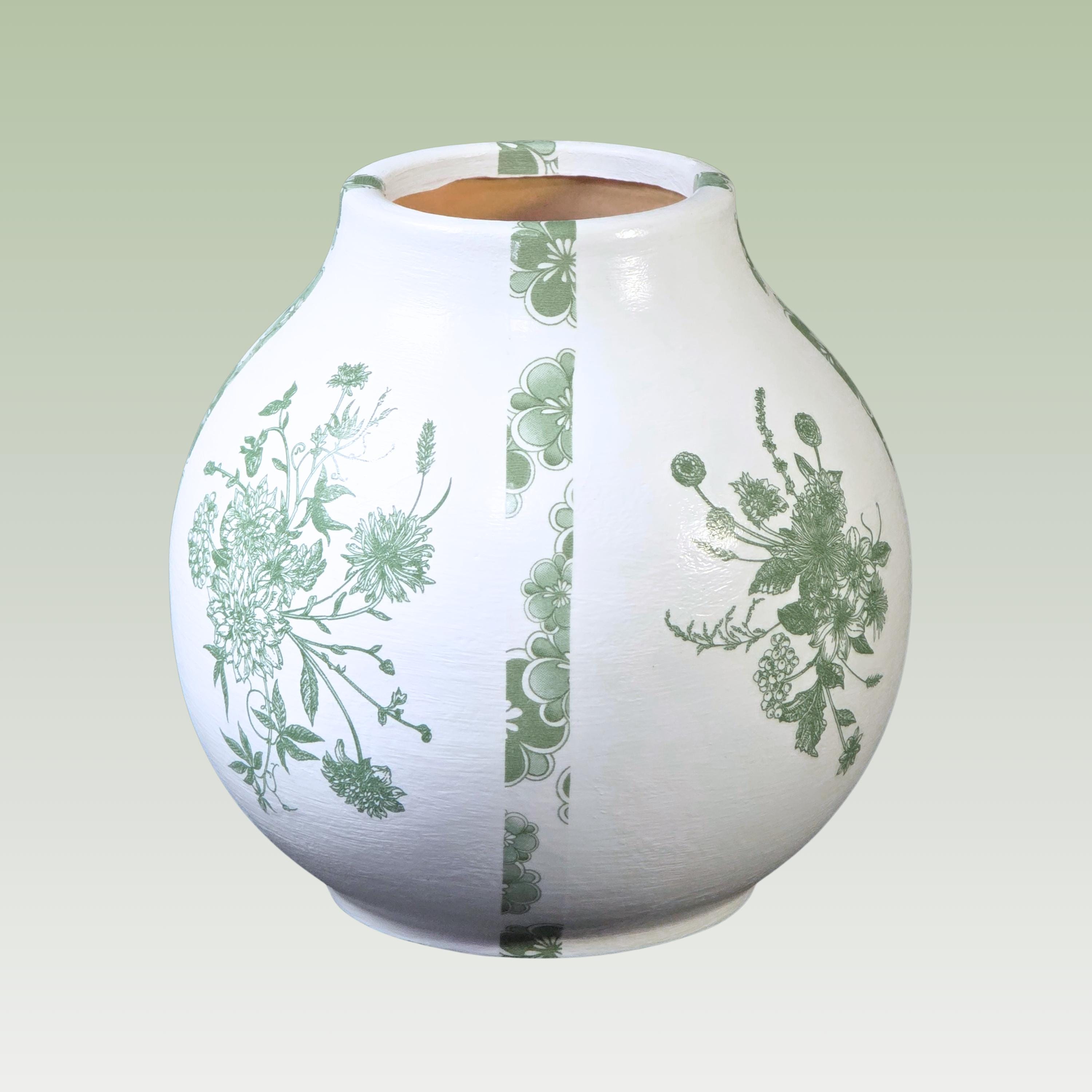 Each upcycled ceramic vase is hand-painted white and carefully hand-decoupaged using designer paper napkins featuring a combination of intricate green florals drawn from classic chinoiserie motifs. The surface is then sealed for durability, creating a refined yet approachable accent that feels both traditional and fresh.