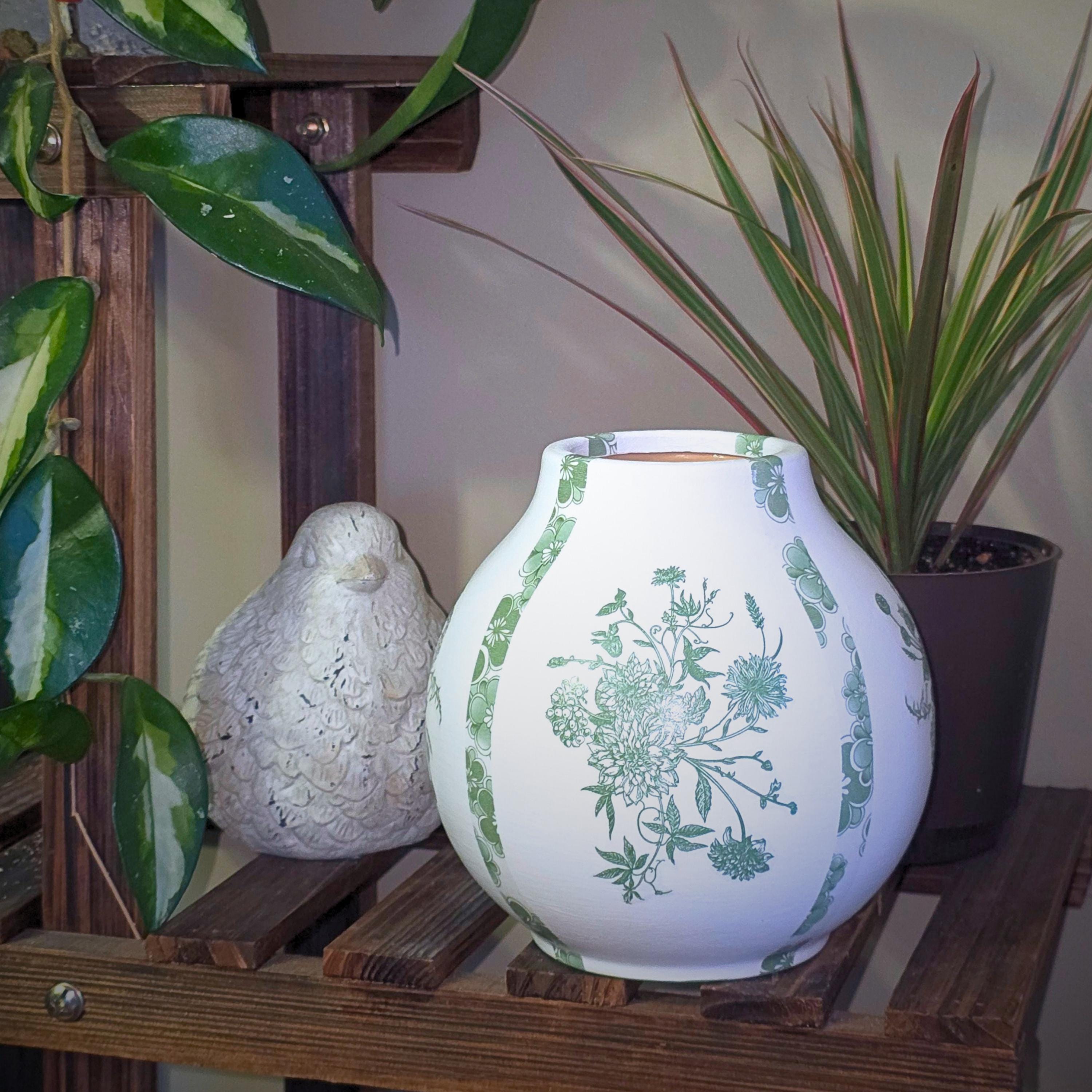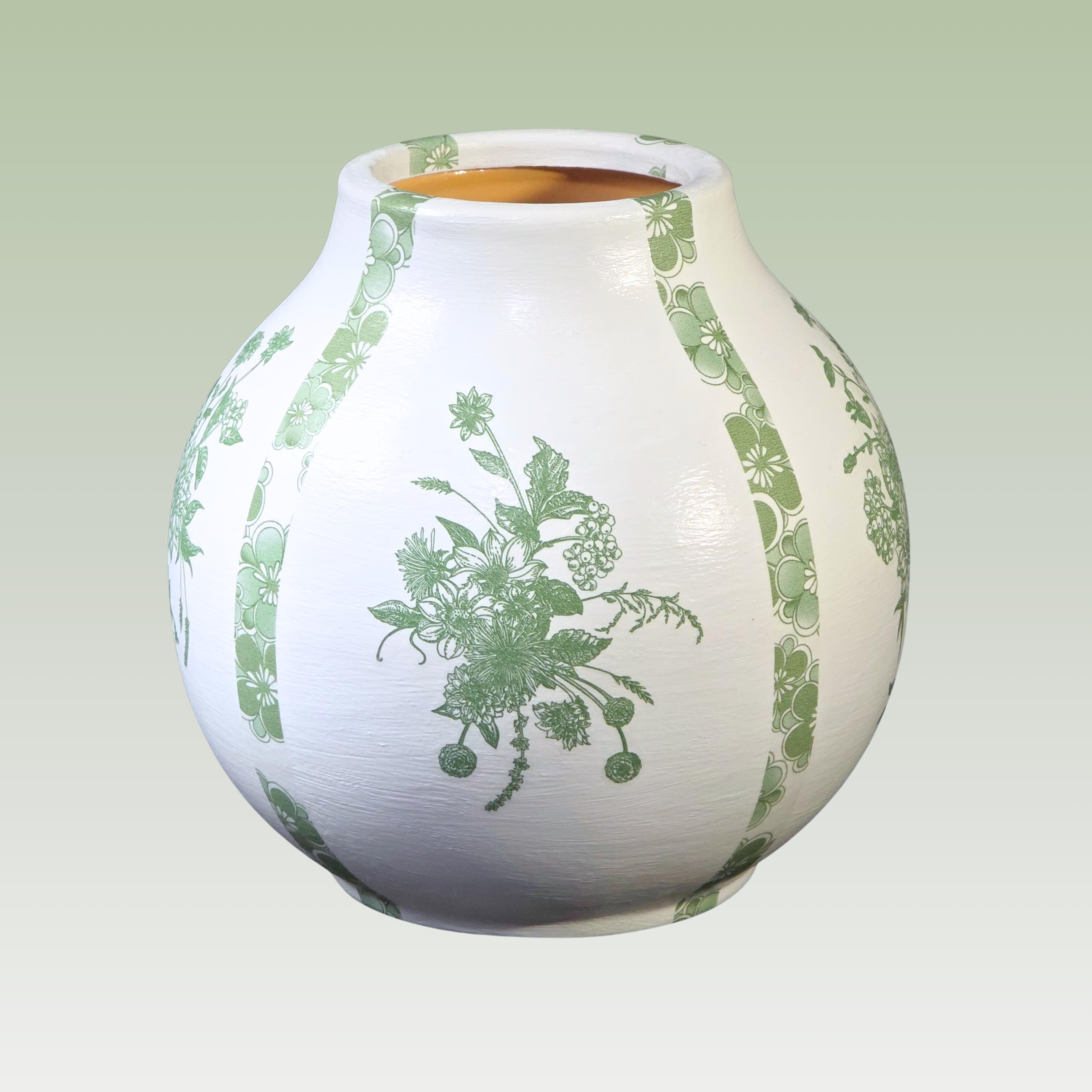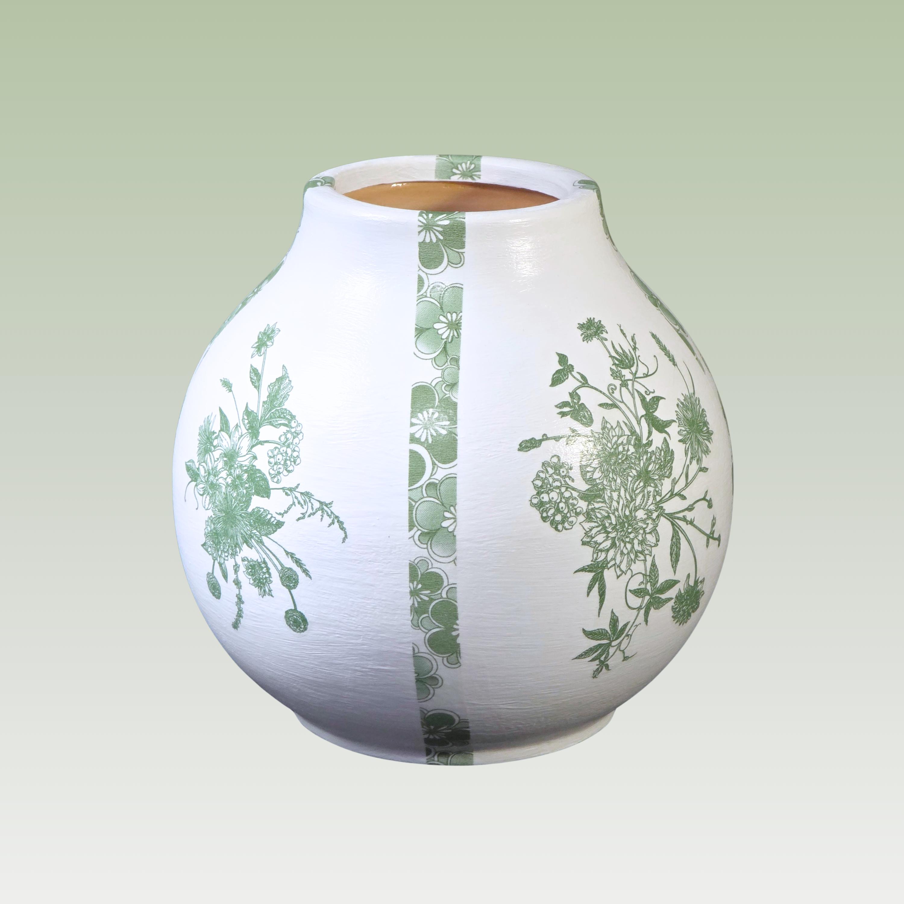 Each upcycled ceramic vase is hand-painted white and carefully hand-decoupaged using designer paper napkins featuring a combination of intricate green florals drawn from classic chinoiserie motifs. The surface is then sealed for durability, creating a refined yet approachable accent that feels both traditional and fresh.