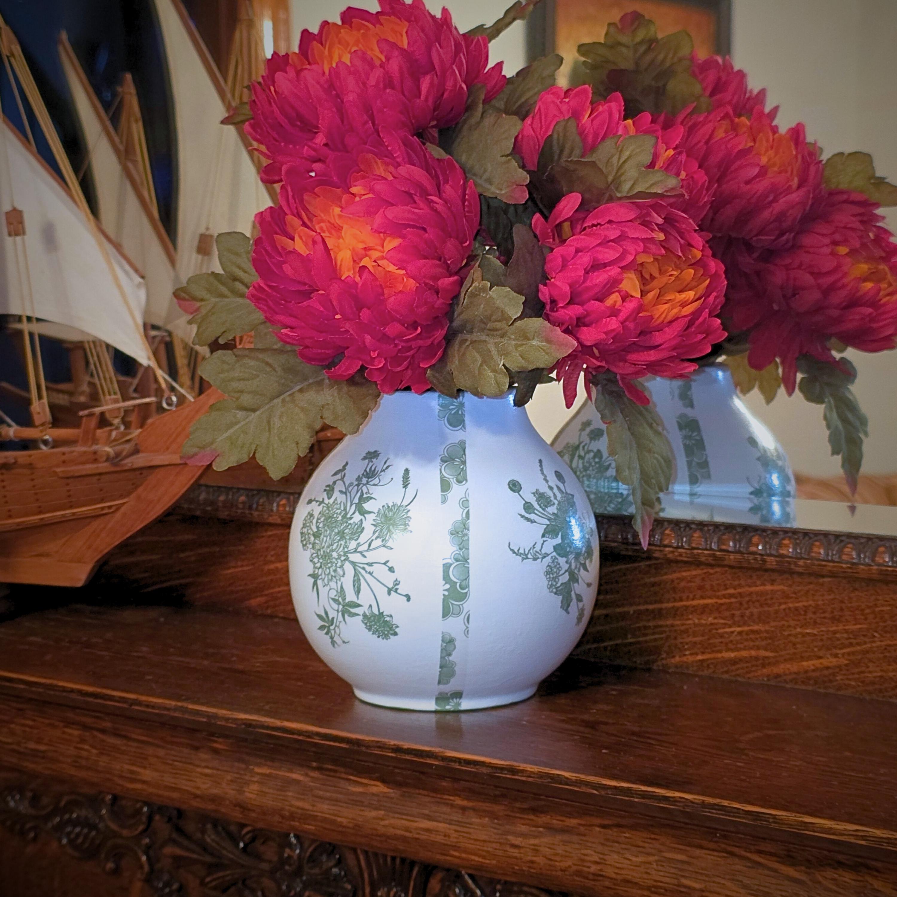 DETAILS: • Approx. 6 inches tall • Upcycled ceramic bulb vase • Hand-decoupaged, hand-painted, and sealed • Decorative use with fresh or dried florals • Designed for indoor display