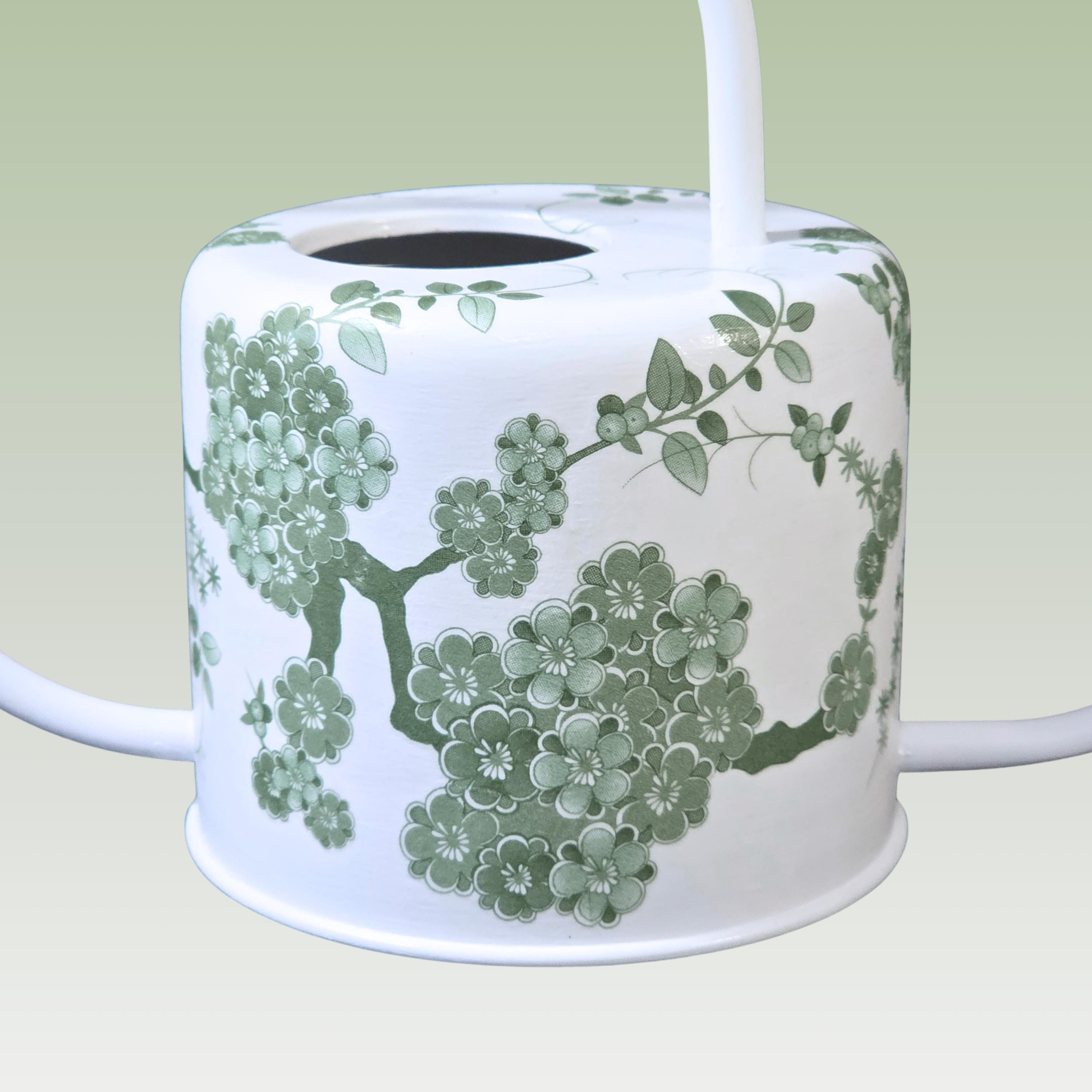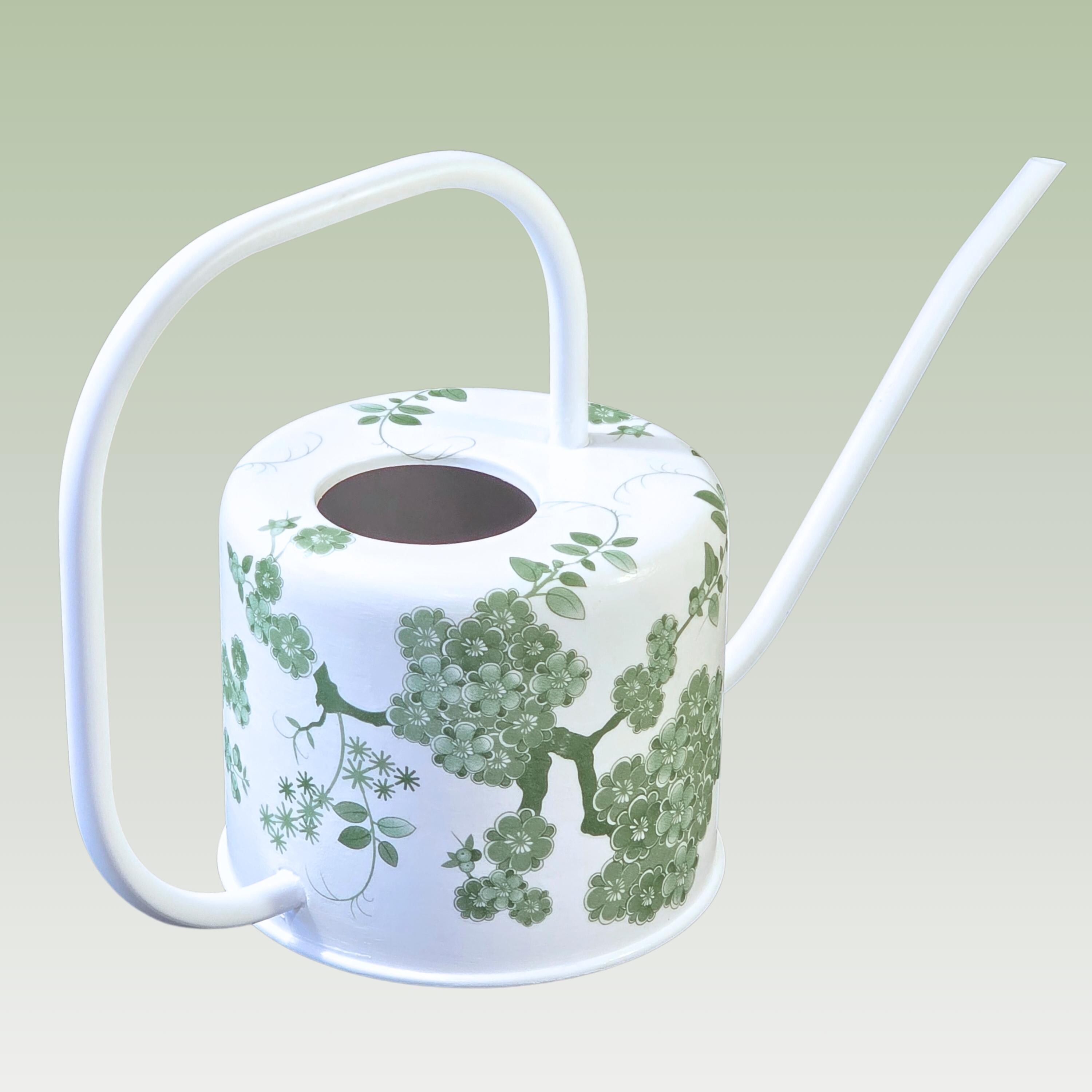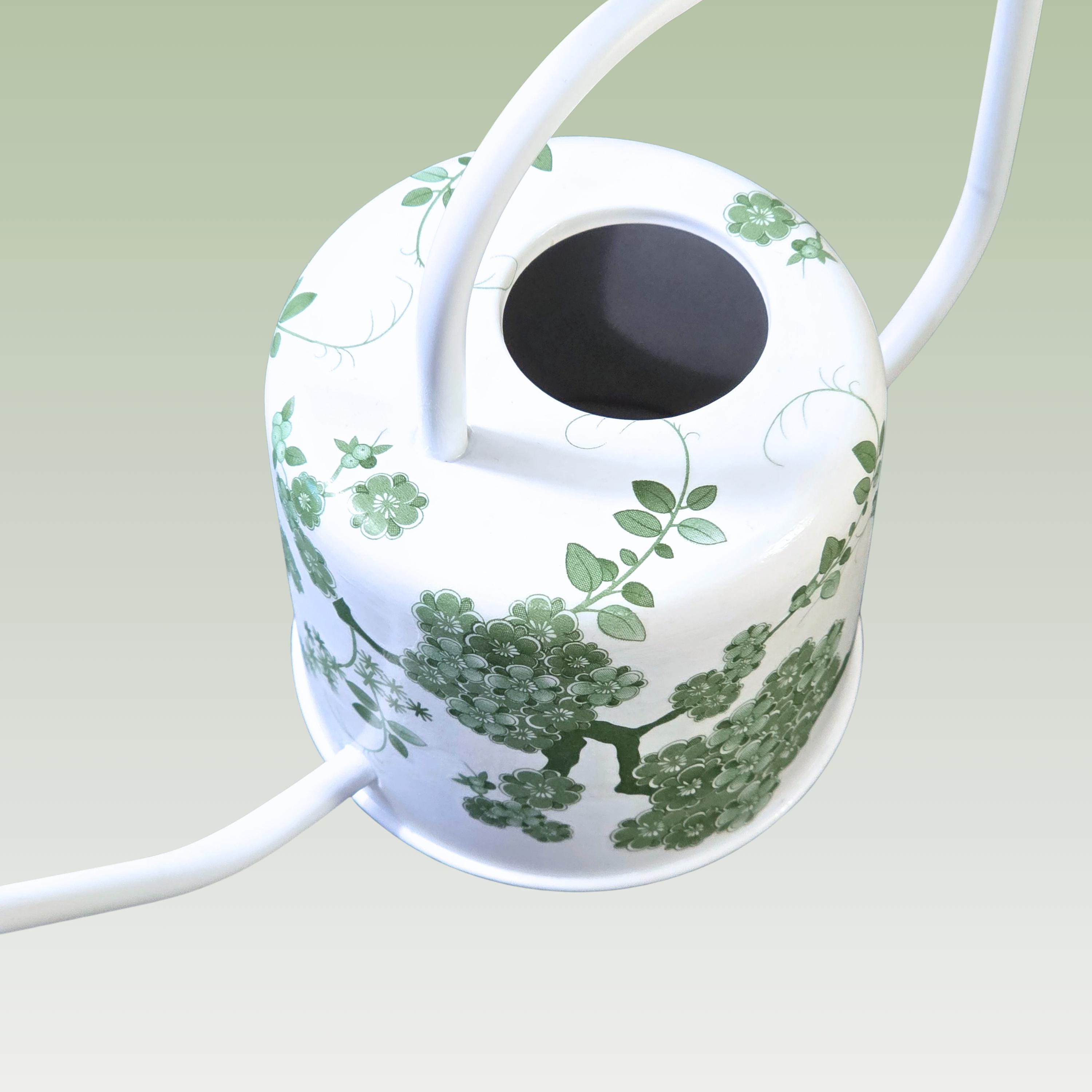 DETAILS: • 1-quart capacity • Hand-decoupaged metal watering can • Long spout for controlled indoor watering • White finish with green-and-white chinoiserie design • Designed for indoor use • Decorative and functional